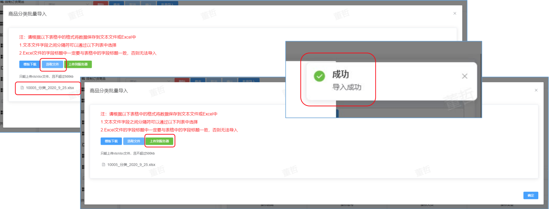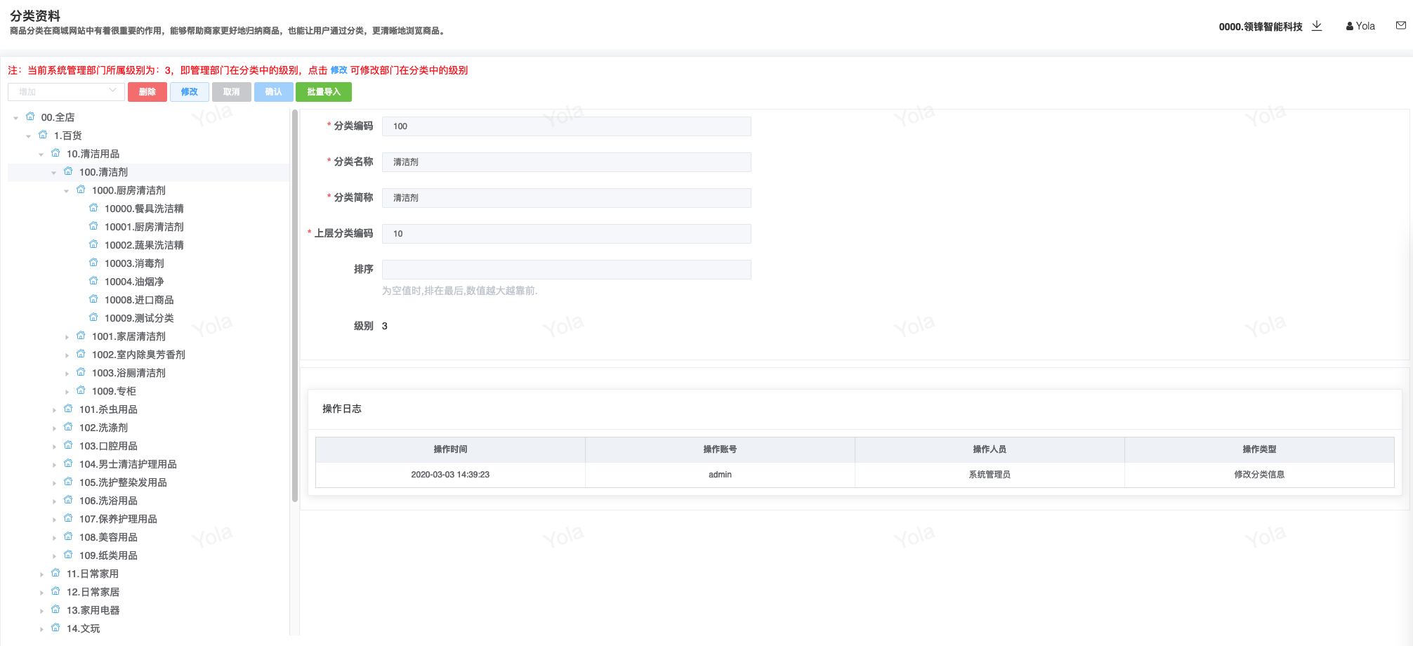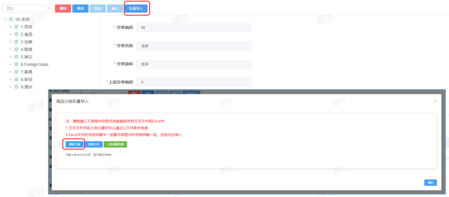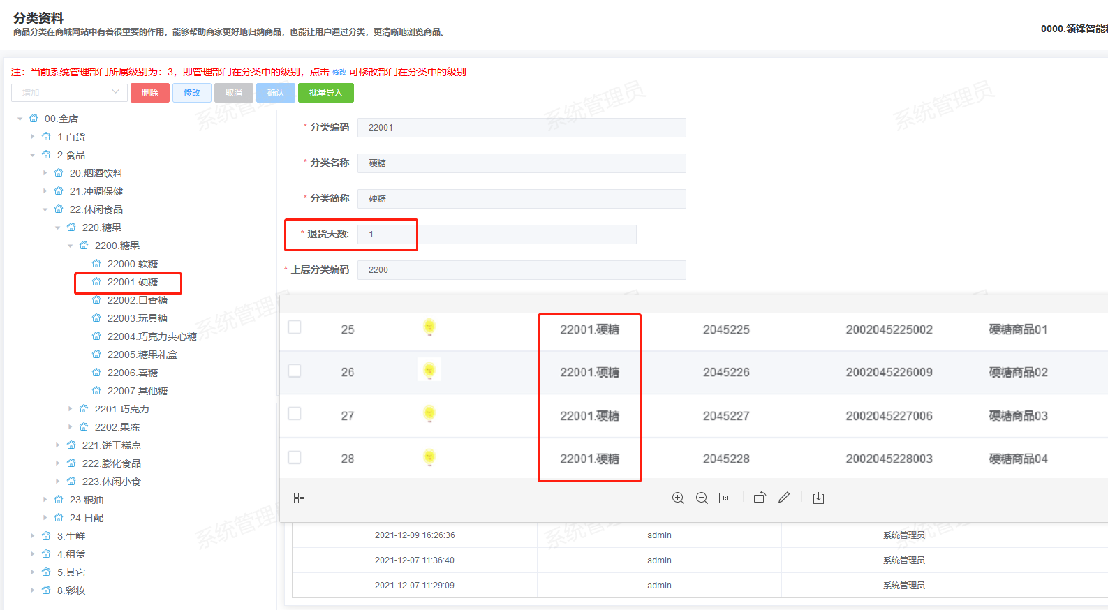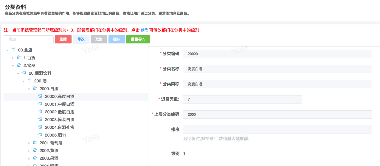 ## 分类-功能介绍 商品分类在商城网站中有着很重要的作用,能够帮助商家更好地归纳商品,也能让用户通过分类,更清晰地浏览商品。  ### 功能路径 灵风云新零售零售业务中台系统->商品->基础资料->分类 ### 操作流程-新增商品分类 --补充gif图片 1. 先在菜单中选择新增的商品分类位置。 2. 点击【增加同级分类】或【增加下级分类】按钮。 3. 输入分类编码、分类名称、分类简称,点击【确认】,分类新增成功。(“*”为必填项) ### 操作流程-批量导入商品分类 1. 点击【批量导入】按钮,弹出商品分类批量导入窗口。 2. 点击【模板下载】按钮下载模板。  3. 点击【选取文件】上传已保存好的文件。 4. 点击【上传到服务器】将文件内容上传到服务器中。 5. 上传成功后,提示导入成功。  模版示例:  ### 通过分类限定线上商城商品可退货天数 时间计算:按物流“已签收”状态日期的第二天零时起开始计算时间  ### 场景示例-退货天数 1.设置商品所属分类的退货天数为1  2.商城下单  3.订单已完成后的第二天零点开始计算不可退货时间,订单已完成时间2022-01-10 16:15:17,订单可退换时间:2022-01-11 24:00:00前,在可退换期间商城订单界面有售后服务按钮