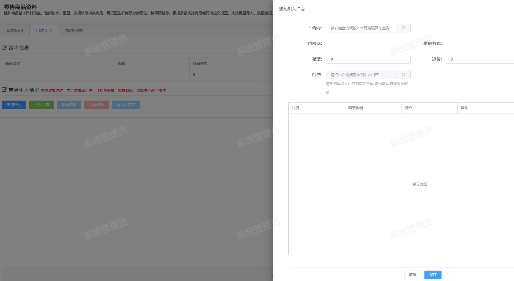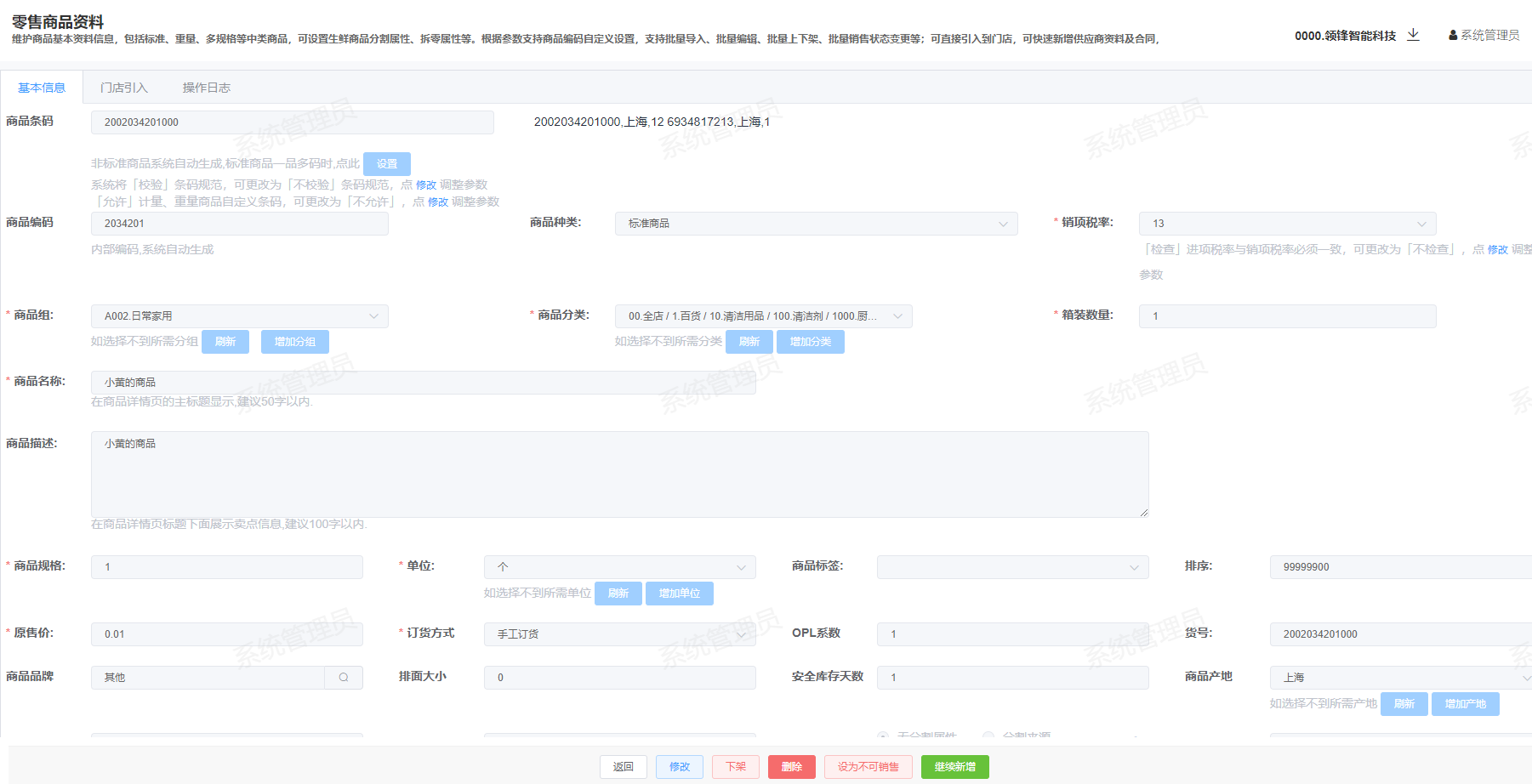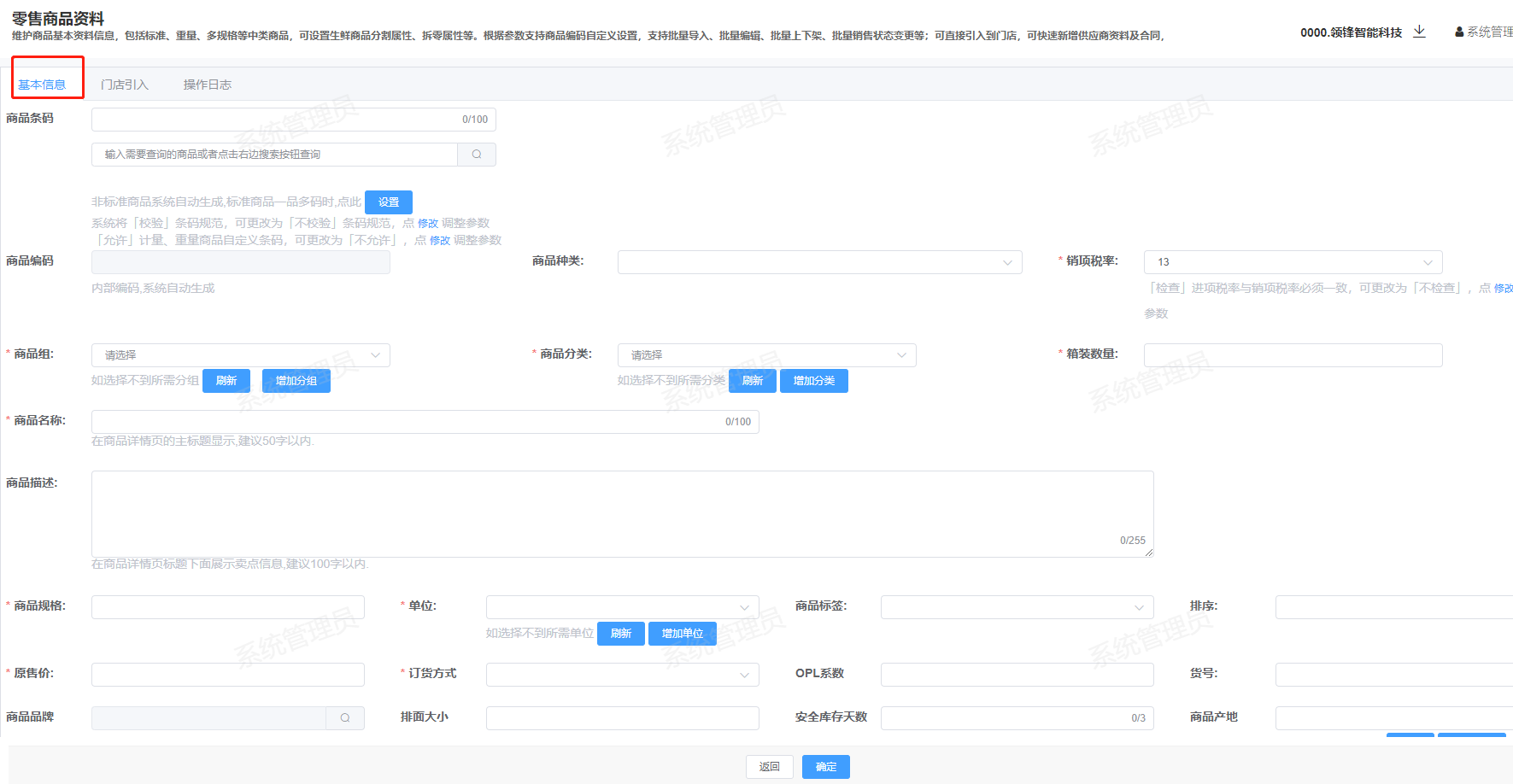 ## 如何创建商品-功能介绍 通过后台创建商品的功能,您可以添加新的商品并在POS收银机中销售  ### 流程图  ### 功能路径 新零售管理后台->商品->商品管理->新增商品 ### 操作流程-新增商品分类 1.根据系统提示输入商品名称、商品组、商品分类、商品规格等等 注:带“*”为必填项  2.根据系统提示输入商品展示图、商品详情图、音频和视频 3.商品图建议尺寸750*750,支持jpg、png、jpeg等格式,图片大小不超过2M 4.音频建议时长10-120秒 5.视频仅支持手机播放,建议时长9-30秒,视频宽高比16:9,大小不超过30M,格式为mp4  6.基本信息显示已经填写过的商品基本信息。 7.在商品引入情况选择门店,根据门店选择合同信息,填写商品进价、配送中心。  8.商品中的所有带”*”必填项都填写完成后,点击确认商品就新增成功了。  ### 名词解释 销项税率:商品销项税率 进项税率:商品进货税率 商品规格:商品的规格大小,比如500ml,500g 商品标签:商品标签属性,比如包邮、热销 排序:在微信小程序中的显示顺序,数字越大越靠前显示 订货方式:以何种方式订货 OPL系数:OPL自动订货的系数参数 货号:一般为厂商提供的商品编码 商品品牌:商品的品牌 排面大小:货架上商品的排面数量 安全库存天数:不会造成缺货的库存天数 商品产地:商品生产来源地 存储类型:商品的存储条件 商品等级:商品的品质等级 属性:可订货:商品可向供应商订货;可退货:商品可退给供应商;可销售:商品可以进行销售;分店可变售价:分店可以更 改商品的价格;拆零:商品是否允许拆零销售;季节性商品:季节性商品;自营商品:一般为自有品牌商品;必卖品项:必须售卖的商品;分割商品:商品是否需要分割售卖; 合同:销售方与供应商签订的进货协议 供应商:商品的供货商 供应类型:商品的供货类型 配送中心:商品属于哪个仓库进行配送