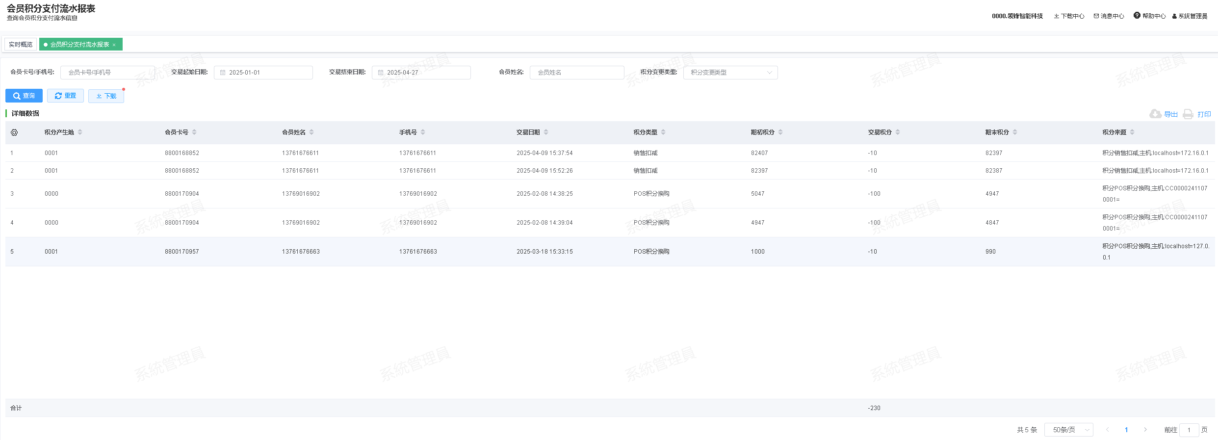 会员积分支付流水报表