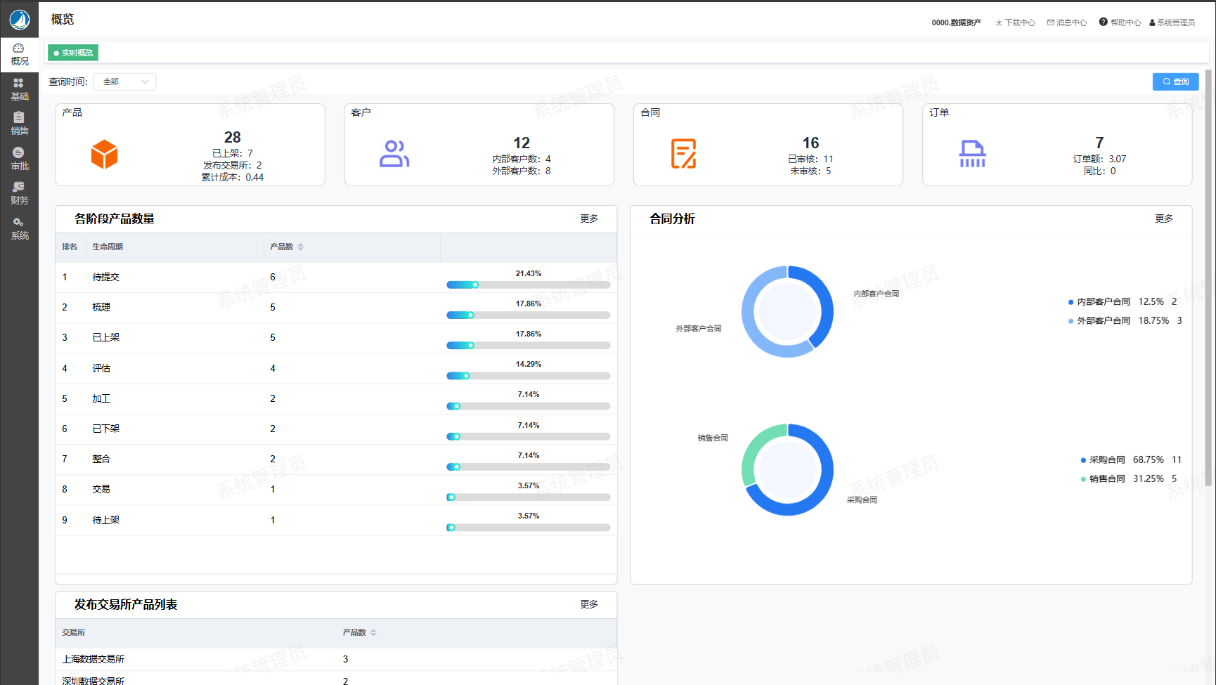 ### 功能说明 主要数据资产管理系统的产品数(已上架、已发布)、客户数(内部客户数、外部客户数)、合同数(已审核、未审核)、订单数(订单数、订单金额) ### 操作路径 【概况】→【概览】 ### 操作界面  ### 操作示例 ### 按钮说明