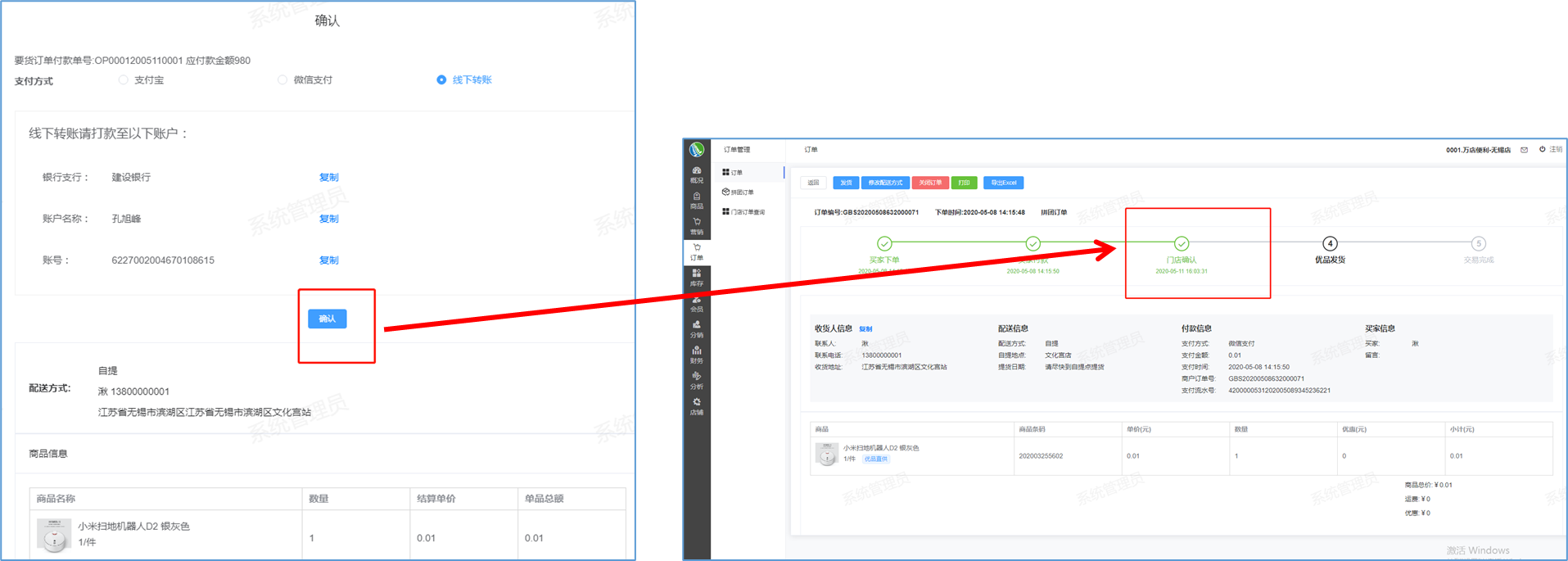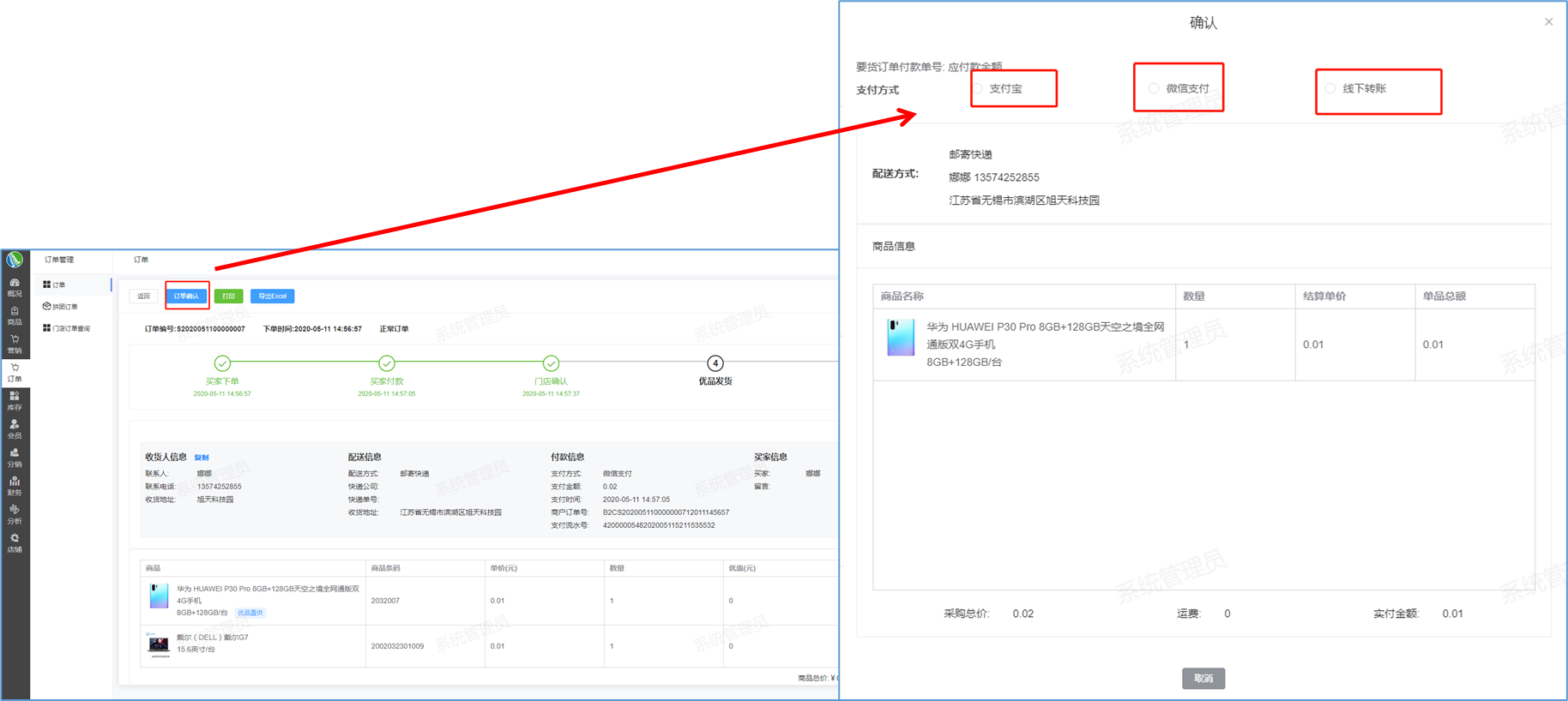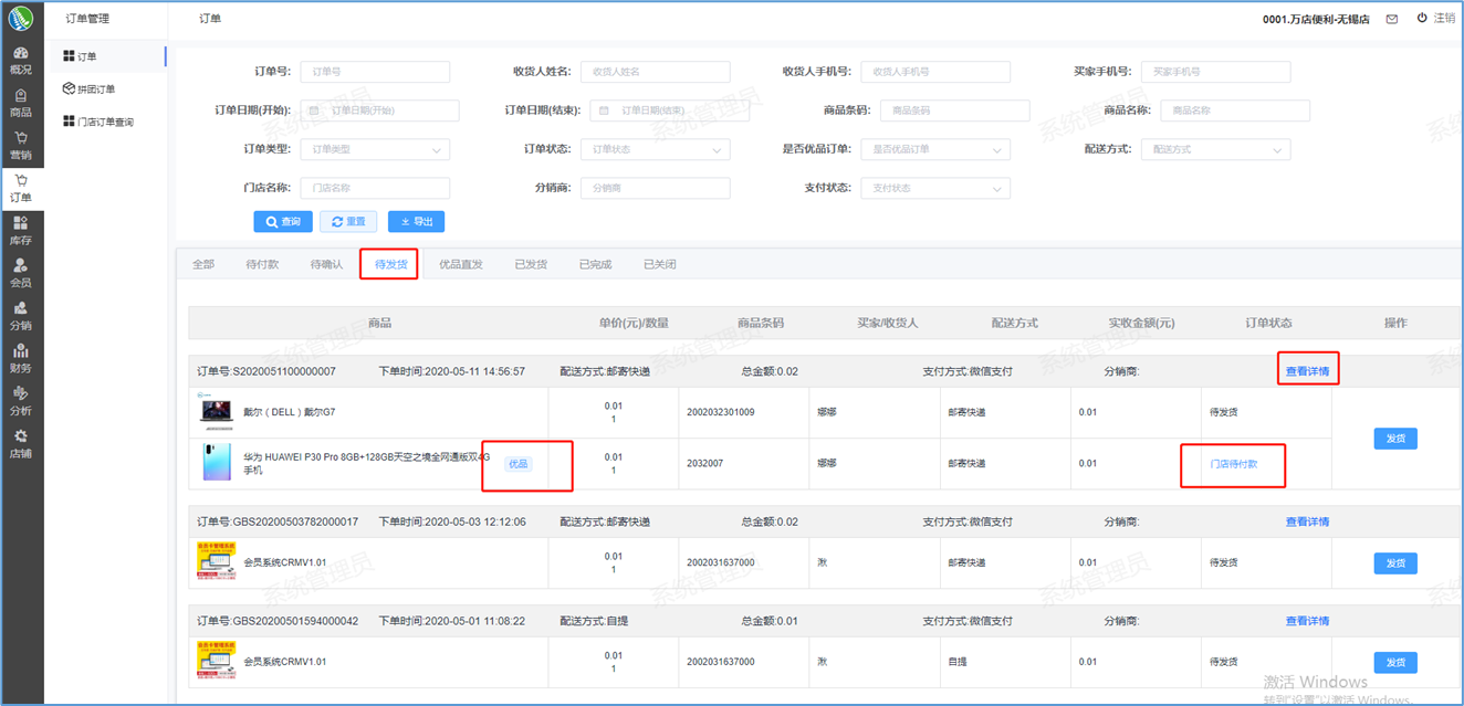 如何订单发货-功能介绍 通过后台门店确认订单信息后,将所有订单信息展示到小程序中。  如何进行订单发货-功能路径 B2C门店运营管理后台->订单->订单->查询->待发货->查看详情  如何进行订单发货-操作流程-点击发货 点击发货:当用户提交订单信息后,您可以点击发货按钮填写快递公司、备注等等。 备注:即用户有什么需求可向卖家反应后填写在备注栏。  如何进行订单发货-操作流程-确认发货 确认发货:当您的所有信息都填写完成后,您可以点击确认发货,如图弹出成功的提示框则发货成功。  如何进行订单发货-操作流程-确认优品订单 确认优品订单:当您点击待发货的订单中如果有优品订单(如图),您可以继续点击查看详情。 优品订单:即总部的订单,普通的订单门店是可以直接点击确认发货的,而优品订单门店是没有权限发货的,门店只需要确认订单即可。  如何进行订单发货-操作流程-确认订单 确认订单:您可以点击订单确认,选择支付方式支付宝、微信支付、线下转账。 名词解释: 支付宝:弹出一个二维码,门店方完成扫码支付即可。 微信支付:弹出一个二维码,门店方完成扫码支付即可。 线下转账:即通过线下银行卡支付转账。  如何进行订单发货-操作流程-门店订单确认 门店订单确认:如图当您的支付方式选择成功之后,点击确认按钮。门店确认成功后即整个订单确认成功。