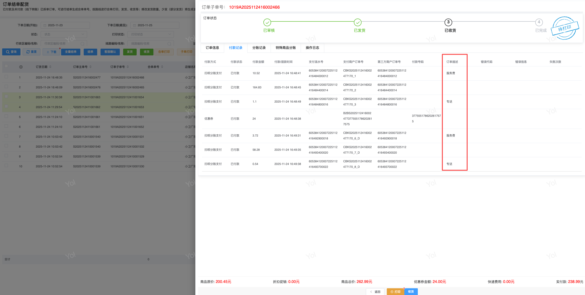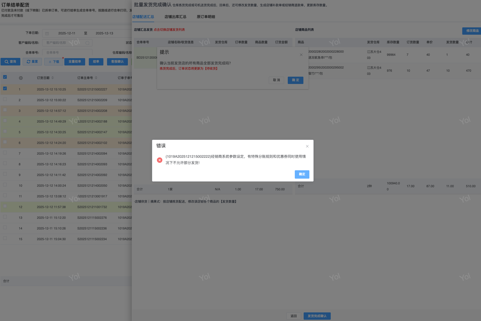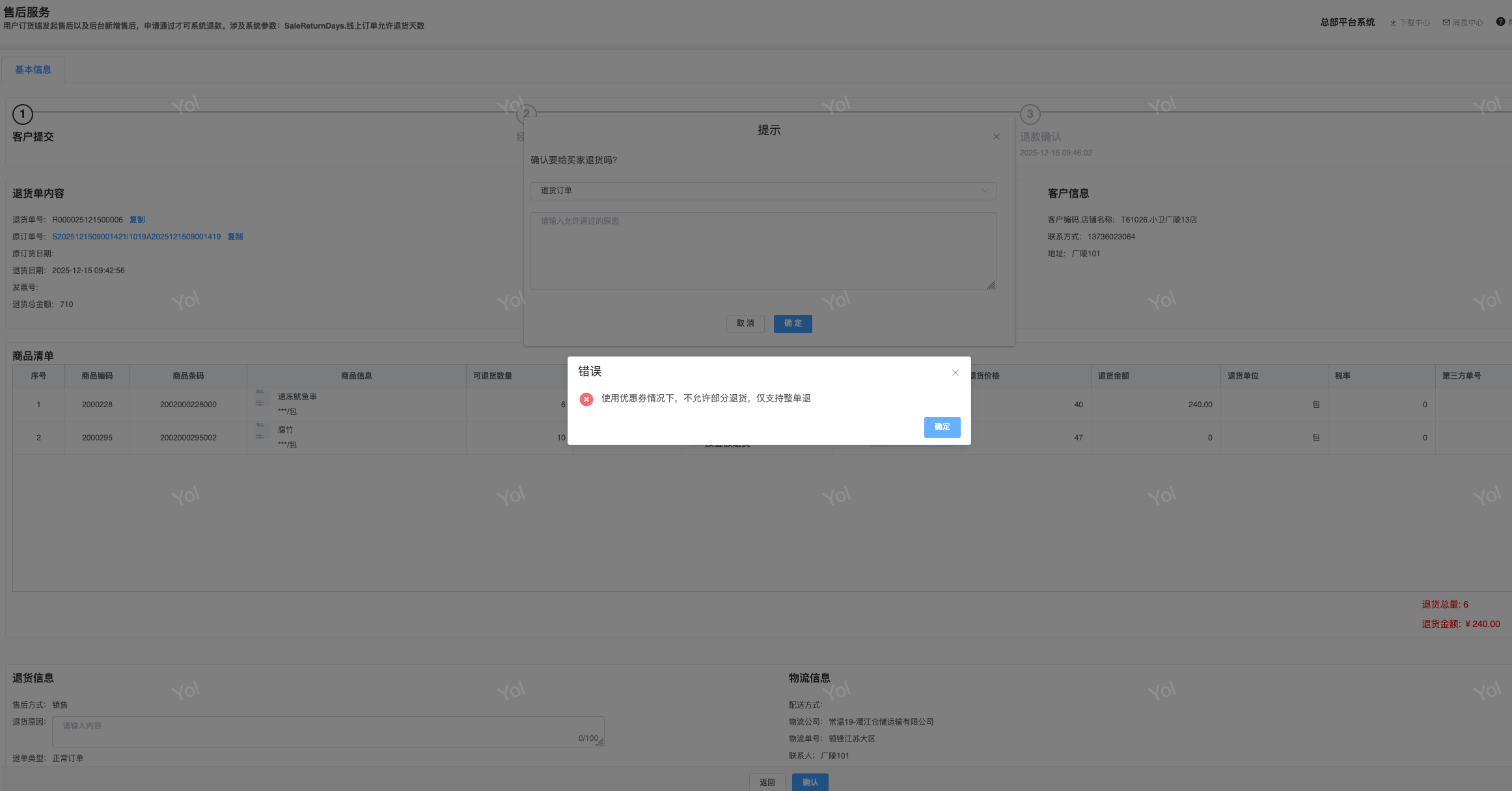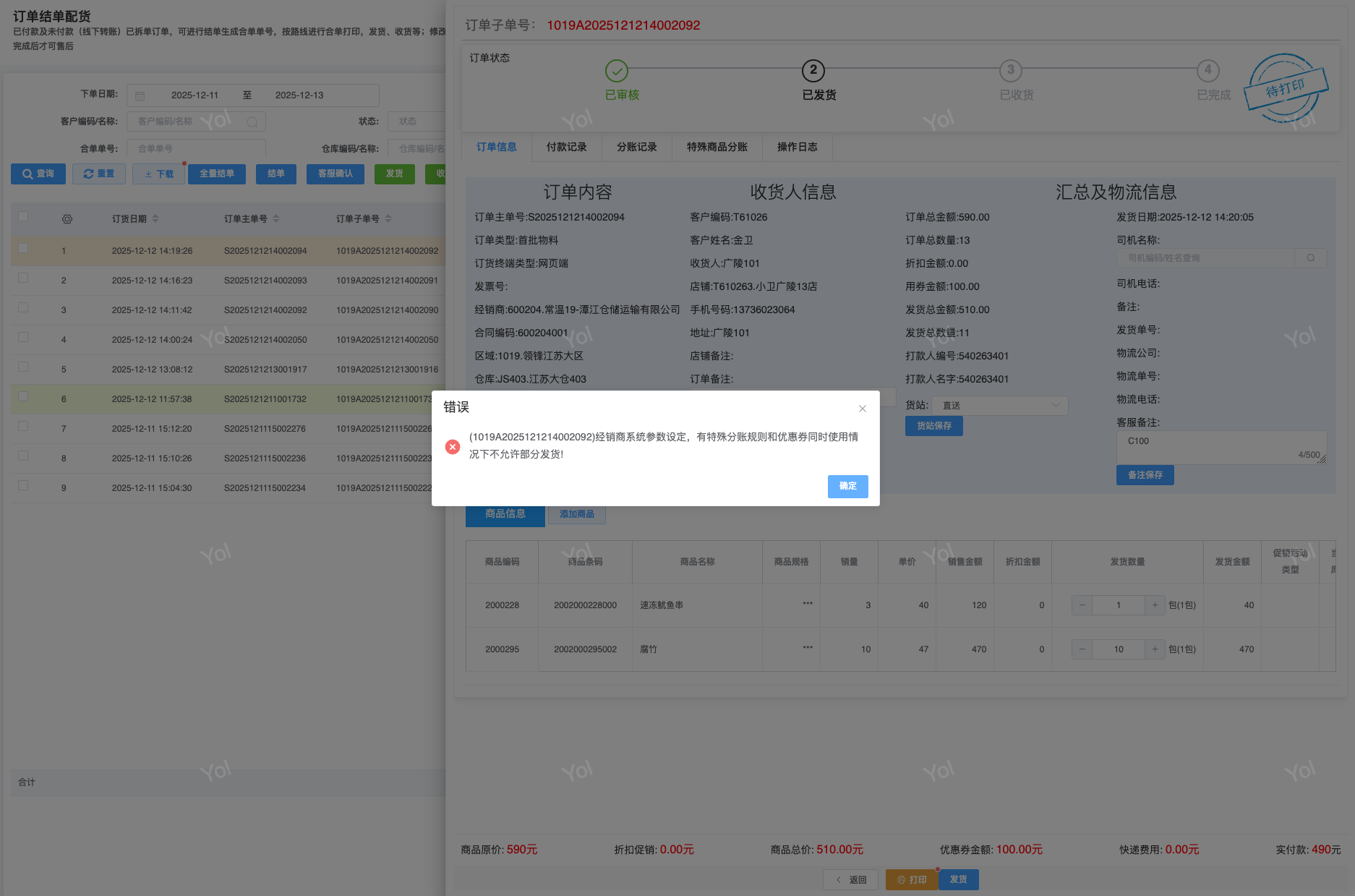 ## B2B平台系统 ### B30024/订单/订单结单配货:详情付款记录增加【订单描述】字段 - A00008/系统/经销商系统参数维护: IsAllowRefund.经销商是否允许用户售后,参数值4,是否允许含券及100%分账时部分退货,默认允许,不允许时,提交售后弹窗拦截 - 批量发货、详情发货:部分发货增加分账100%+券检查弹框拦截提醒:(1019A2025121214002092)经销商系统参数设定,有特殊分账规则和优惠券同时使用情况下不允许部分发货! - B80039/支付报表/分账明细查询:查询结果增加备注字段 - B80013/经营报表/经销商线上订单收款查询:查询结果增加订单描述字段        #### B30003/订单/售后服务:新增保存增加弹窗拦截含分账及券不允许部分商品退货 - 弹窗拦截提醒:使用优惠券情况下,不允许部分退货,仅支持整单退 - A00008/系统/经销商系统参数维护: IsAllowRefund.经销商是否允许用户售后,参数值4,是否允许含券及100%分账时部分退货,默认允许,不允许时,提交售后弹窗拦截   #### B30028/订单/销售预售单:增加弹窗拦截-百分百分账不可使用优惠券 - 弹窗拦截提醒: 实付金额不够支付百分百分账,百分百分账商品不支持使用优惠券,请加购商品后重新提交订单!  #### 任务调度-B2B订单子单商品明细券分摊金额计算:销售及销退排除分账100%商品分摊  ### 券到店按经销商审批流程对接 #### 1、A00008/系统/经销商系统参数维护:IsSendCouponCheck经销商券直接发放是否启用平台审批,默认不启用  #### 2、90032/系统/审批流程设置:配置平台审批流程  #### 3、F10003/营销/优惠券制券:新增、修改操作增加提醒:适用经销商券直接发放到店启用不同审批流程,确认继续制券吗?  #### 4、F20006/营销/券直接发放到店:根据所选制券单的经销商,以及经销商参数(经销商券直接发放是否启用平台审批),未启用的进行经销商直接审核,已启用的则按审批流程配置提交审核    ### B00058/商品/经销商套餐商品维护:修复明细2000000商品问题  ### C20001/采购/采购订货:修复首页订货总金额问题  ## 订货端 ### 分账支付订单及补款订单-支付服务增加订单的交易备注   ### 提交订单、申请售后:增加分账+券检查弹窗拦截 - 提交订单:部分商品不支持优惠券,实付金额不满足优惠券,请加购商品重新提交订单 - 申请售后-提交:使用优惠券情况下,不允许部分退货,仅支持整单退