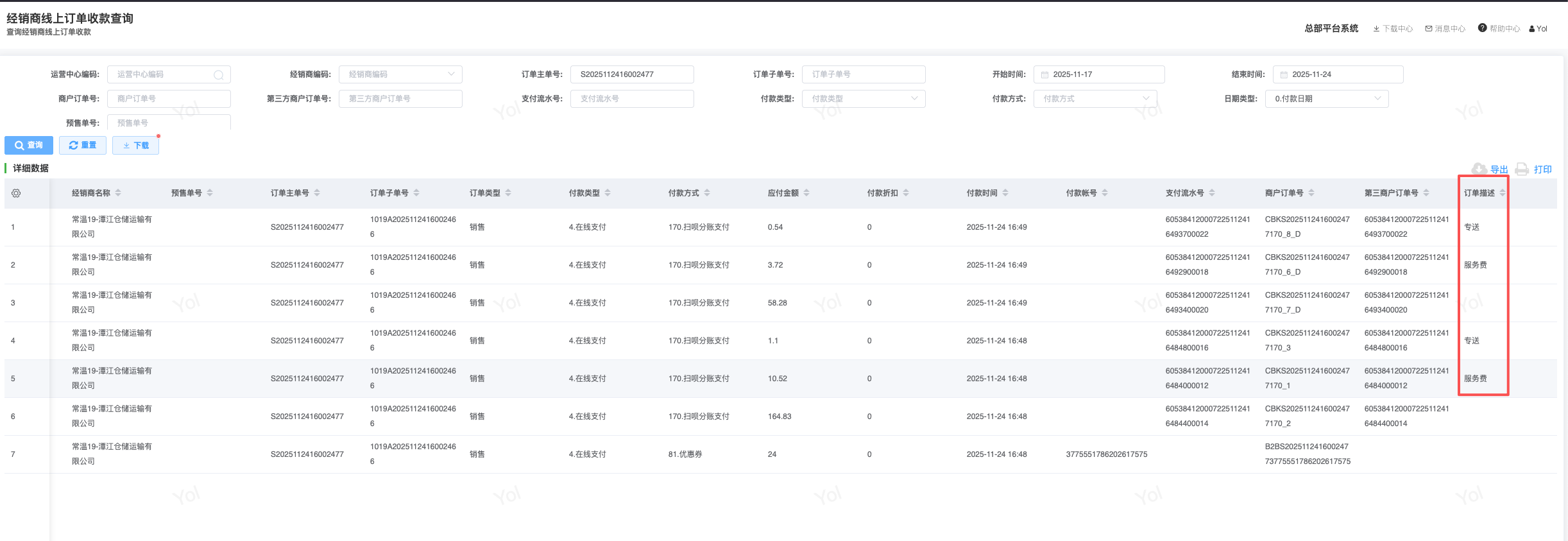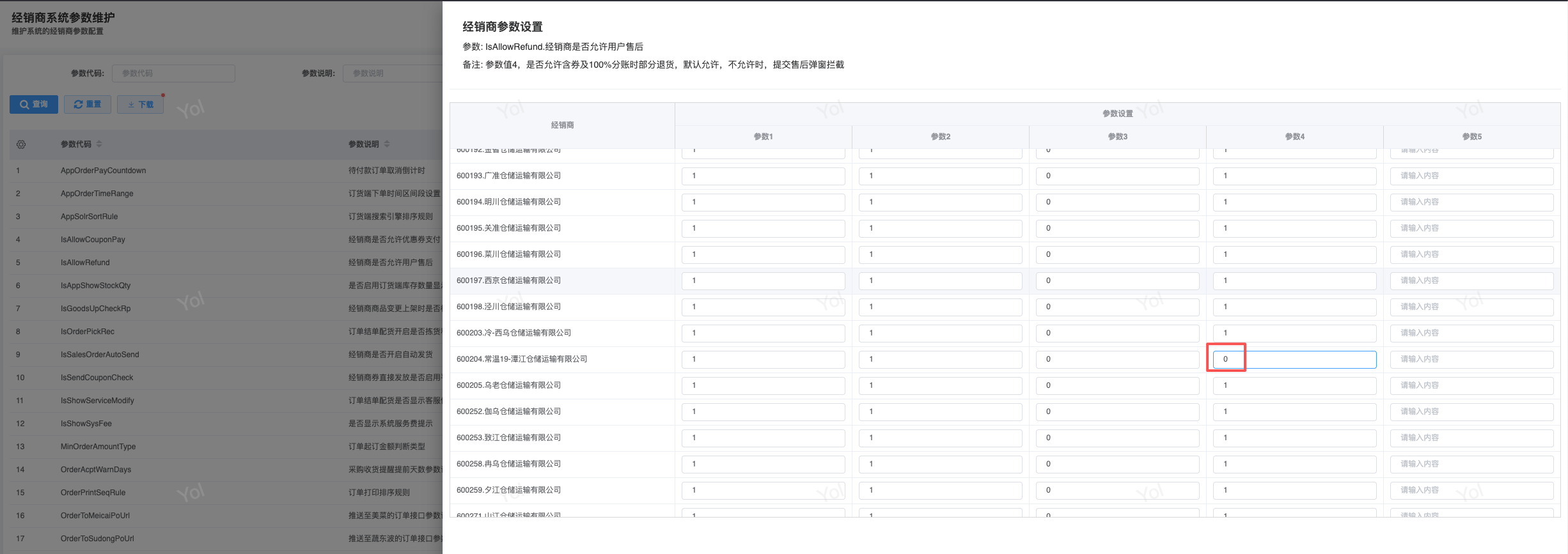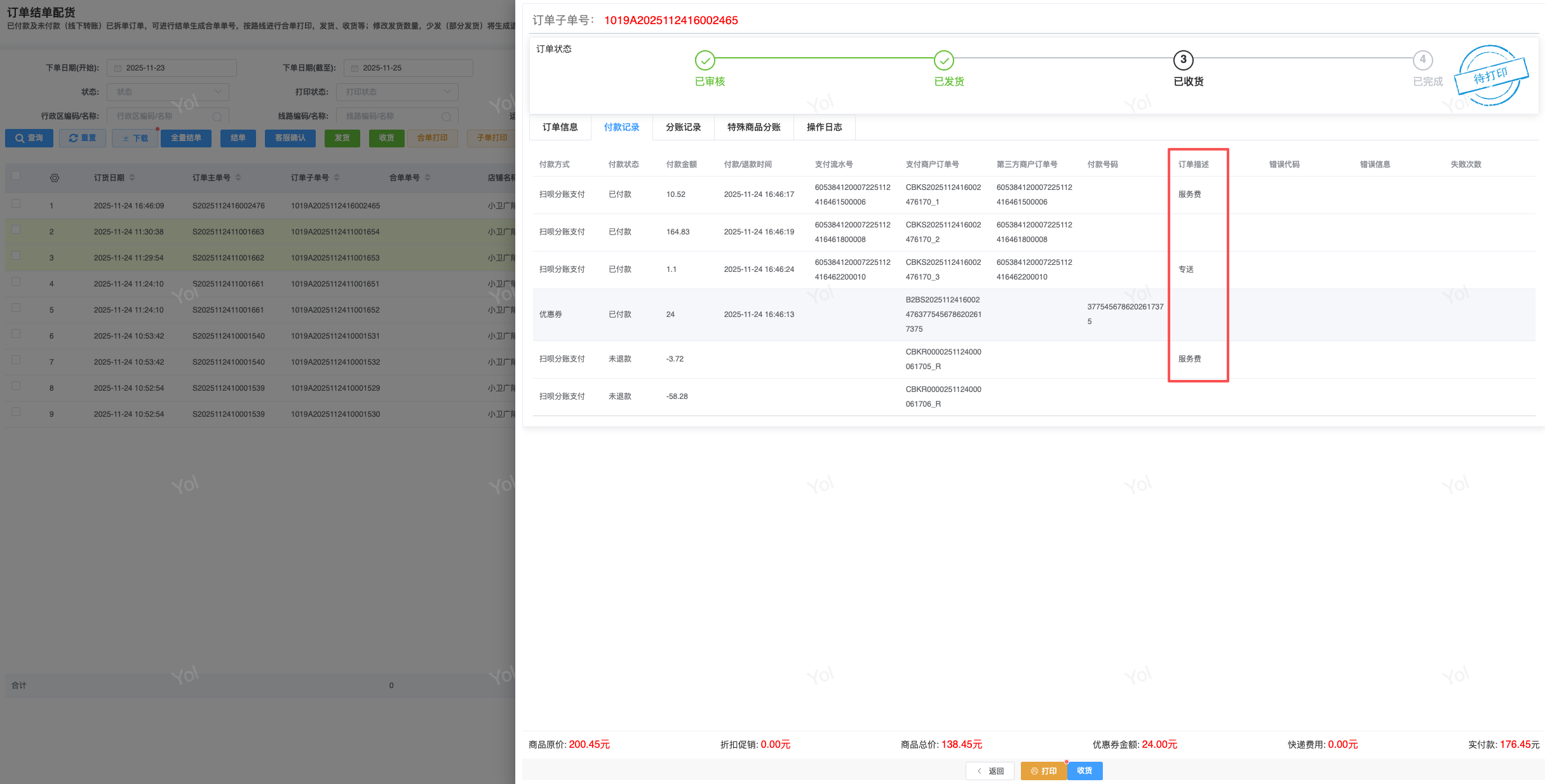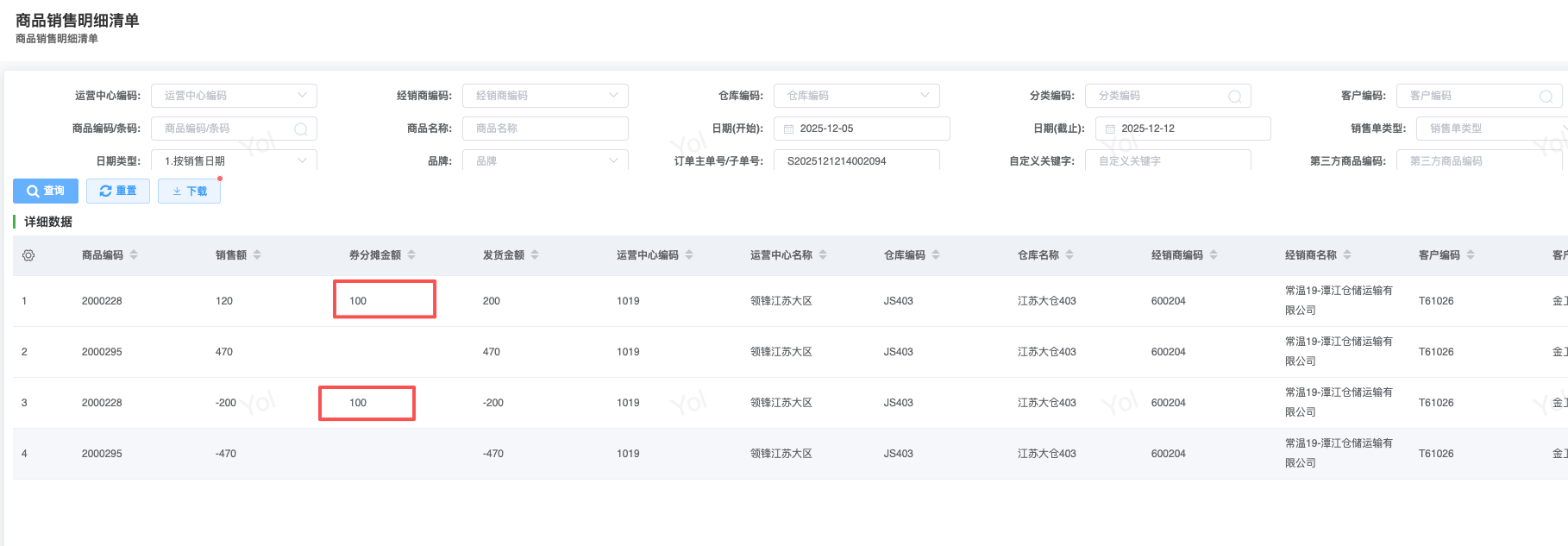 ## B2B平台系统 ### B30024/订单/订单结单配货:详情付款记录增加【订单描述】字段 - A00008/系统/经销商系统参数维护: IsAllowRefund.经销商是否允许用户售后,参数值4,是否允许含券及100%分账时部分退货,默认允许,不允许时,提交售后弹窗拦截 - 批量发货、详情发货:部分发货增加分账100%+券检查弹框拦截提醒:(1019A2025121214002092)经销商系统参数设定,有特殊分账规则和优惠券同时使用情况下不允许部分发货! - B80039/支付报表/分账明细查询:查询结果增加备注字段 - B80013/经营报表/经销商线上订单收款查询:查询结果增加订单描述字段        #### B30003/订单/售后服务:新增保存增加弹窗拦截含分账及券不允许部分商品退货 - 弹窗拦截提醒:使用优惠券情况下,不允许部分退货,仅支持整单退 - A00008/系统/经销商系统参数维护: IsAllowRefund.经销商是否允许用户售后,参数值4,是否允许含券及100%分账时部分退货,默认允许,不允许时,提交售后弹窗拦截   #### B30028/订单/销售预售单:增加弹窗拦截-百分百分账不可使用优惠券 - 弹窗拦截提醒: 实付金额不够支付百分百分账,百分百分账商品不支持使用优惠券,请加购商品后重新提交订单!  #### 任务调度-B2B订单子单商品明细券分摊金额计算:销售及销退排除分账100%商品分摊  ### 券到店按经销商审批流程对接 #### 1、A00008/系统/经销商系统参数维护:IsSendCouponCheck经销商券直接发放是否启用平台审批,默认不启用  #### 2、90032/系统/审批流程设置:配置平台审批流程  #### 3、F10003/营销/优惠券制券:新增、修改操作增加提醒:适用经销商券直接发放到店启用不同审批流程,确认继续制券吗?  #### 4、F20006/营销/券直接发放到店:根据所选制券单的经销商,以及经销商参数(经销商券直接发放是否启用平台审批),未启用的进行经销商直接审核,已启用的则按审批流程配置提交审核    ### B00058/商品/经销商套餐商品维护:修复明细2000000商品问题  ### C20001/采购/采购订货:修复首页订货总金额问题  ## 订货端 ### 分账支付订单及补款订单-支付服务增加订单的交易备注   ### 提交订单、申请售后:增加分账+券检查弹窗拦截 - 提交订单:部分商品不支持优惠券,实付金额不满足优惠券,请加购商品重新提交订单 - 申请售后-提交:使用优惠券情况下,不允许部分退货,仅支持整单退