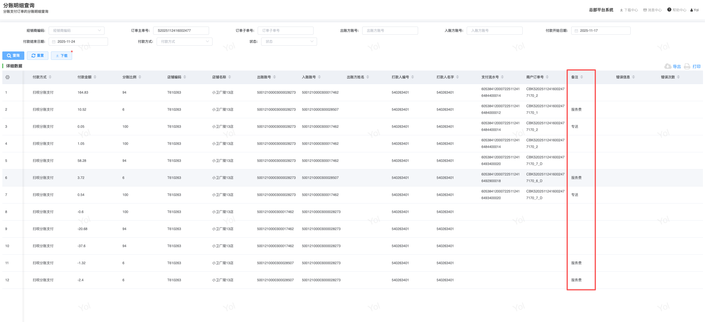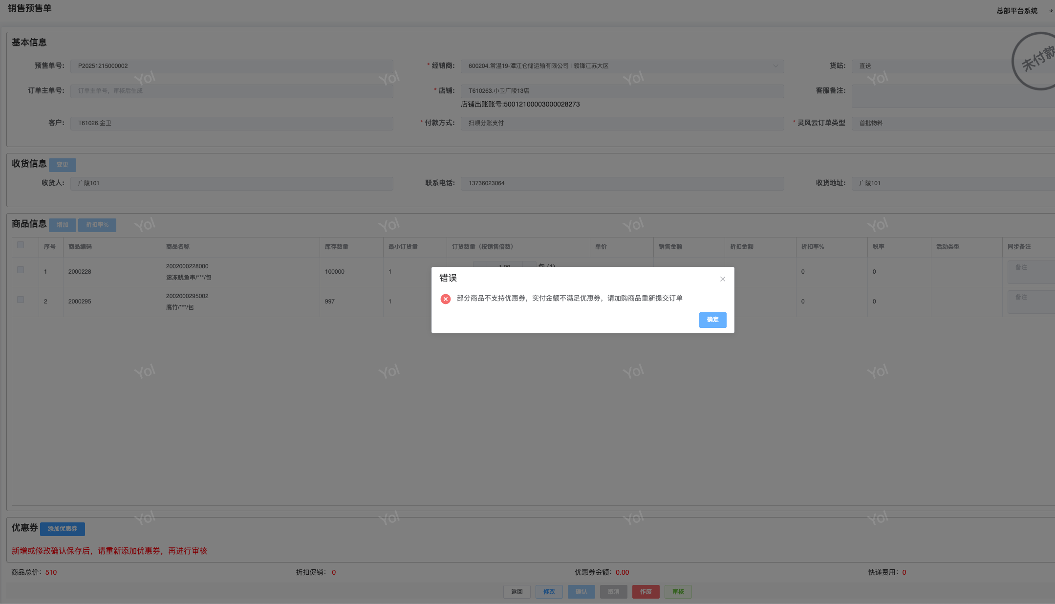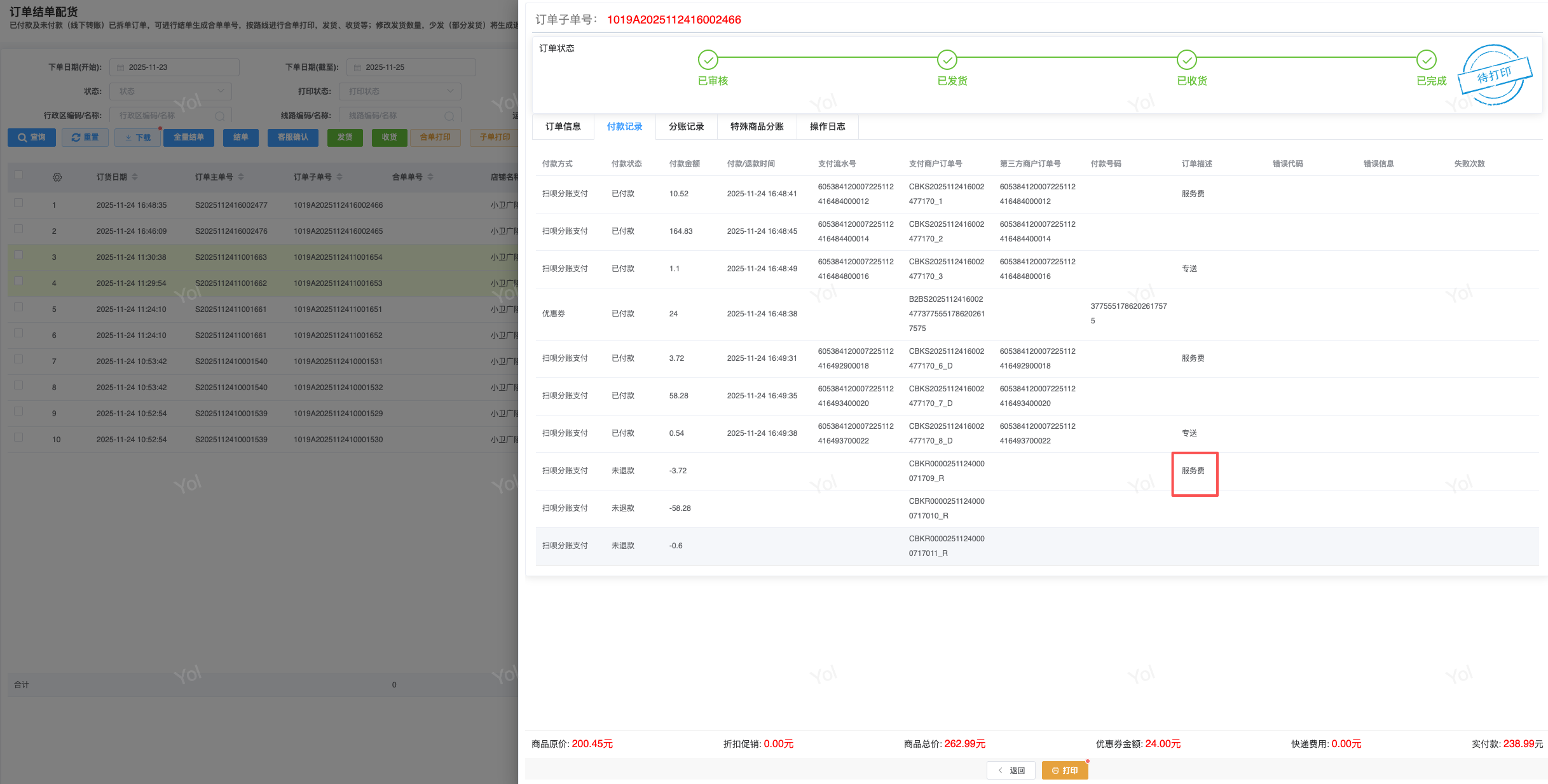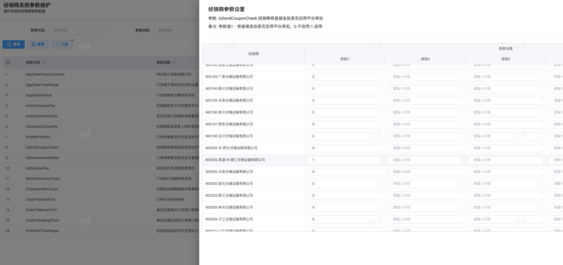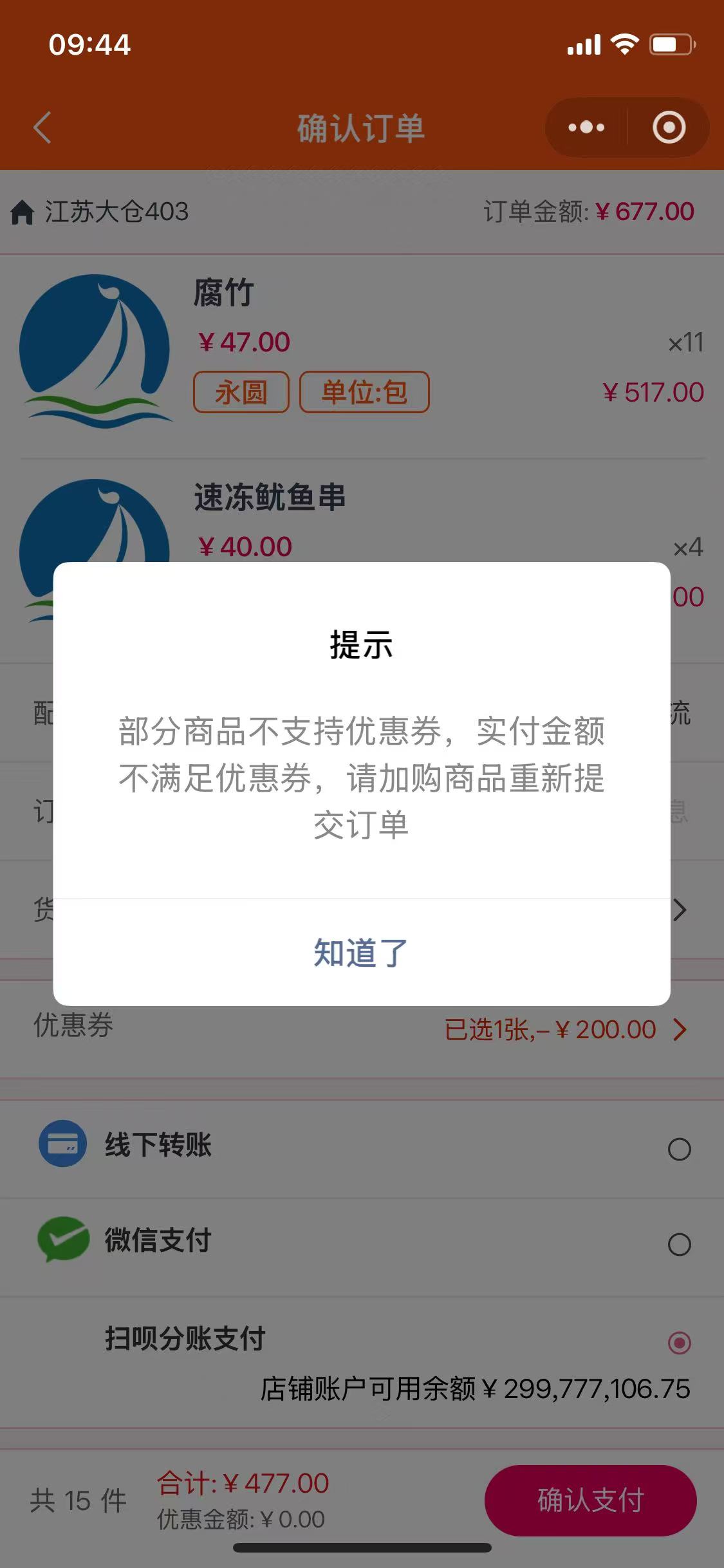 ## B2B平台系统 ### B30024/订单/订单结单配货:详情付款记录增加【订单描述】字段 - A00008/系统/经销商系统参数维护: IsAllowRefund.经销商是否允许用户售后,参数值4,是否允许含券及100%分账时部分退货,默认允许,不允许时,提交售后弹窗拦截 - 批量发货、详情发货:部分发货增加分账100%+券检查弹框拦截提醒:(1019A2025121214002092)经销商系统参数设定,有特殊分账规则和优惠券同时使用情况下不允许部分发货! - B80039/支付报表/分账明细查询:查询结果增加备注字段 - B80013/经营报表/经销商线上订单收款查询:查询结果增加订单描述字段        #### B30003/订单/售后服务:新增保存增加弹窗拦截含分账及券不允许部分商品退货 - 弹窗拦截提醒:使用优惠券情况下,不允许部分退货,仅支持整单退 - A00008/系统/经销商系统参数维护: IsAllowRefund.经销商是否允许用户售后,参数值4,是否允许含券及100%分账时部分退货,默认允许,不允许时,提交售后弹窗拦截   #### B30028/订单/销售预售单:增加弹窗拦截-百分百分账不可使用优惠券 - 弹窗拦截提醒: 实付金额不够支付百分百分账,百分百分账商品不支持使用优惠券,请加购商品后重新提交订单!  #### 任务调度-B2B订单子单商品明细券分摊金额计算:销售及销退排除分账100%商品分摊  ### 券到店按经销商审批流程对接 #### 1、A00008/系统/经销商系统参数维护:IsSendCouponCheck经销商券直接发放是否启用平台审批,默认不启用  #### 2、90032/系统/审批流程设置:配置平台审批流程  #### 3、F10003/营销/优惠券制券:新增、修改操作增加提醒:适用经销商券直接发放到店启用不同审批流程,确认继续制券吗?  #### 4、F20006/营销/券直接发放到店:根据所选制券单的经销商,以及经销商参数(经销商券直接发放是否启用平台审批),未启用的进行经销商直接审核,已启用的则按审批流程配置提交审核    ### B00058/商品/经销商套餐商品维护:修复明细2000000商品问题  ### C20001/采购/采购订货:修复首页订货总金额问题  ## 订货端 ### 分账支付订单及补款订单-支付服务增加订单的交易备注   ### 提交订单、申请售后:增加分账+券检查弹窗拦截 - 提交订单:部分商品不支持优惠券,实付金额不满足优惠券,请加购商品重新提交订单 - 申请售后-提交:使用优惠券情况下,不允许部分退货,仅支持整单退