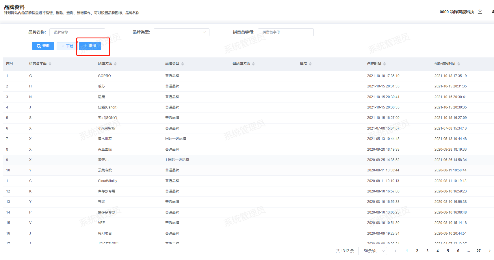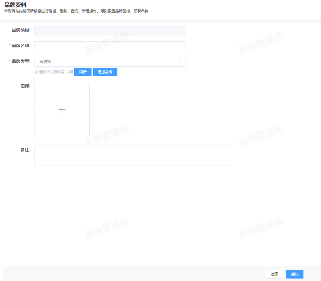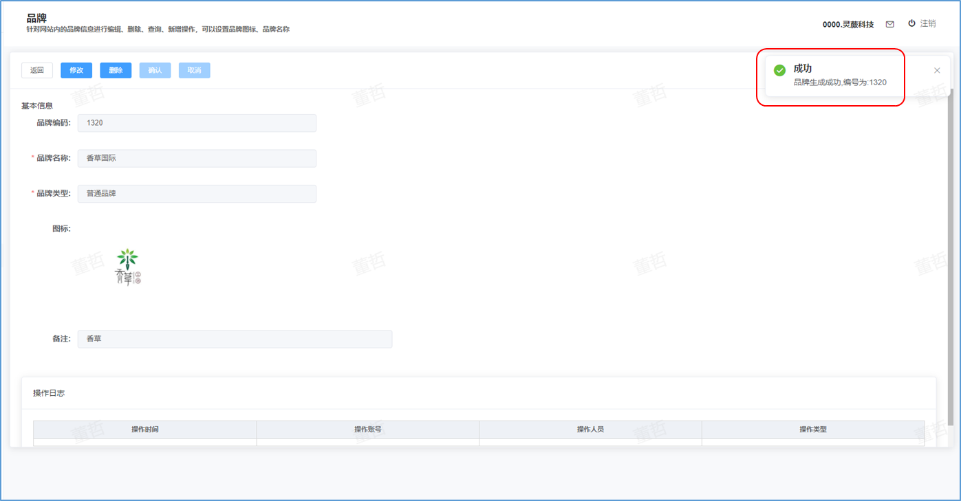 ## 品牌-功能介绍 针对网站内的品牌信息进行编辑、删除、查询、新增操作,可以设置品牌图标、品牌名称。 ### 功能路径 灵商云零售业务中台->商品->基础资料设置->品牌 ### 操作流程-新增商品品牌 1. 点击【增加】按钮,新增商品品牌。  2. 输入品牌名称、品牌类型、图标、备注,点击【确认】按钮。(“*”为必填项)  3. 新增品牌成功,提示品牌生成成功。