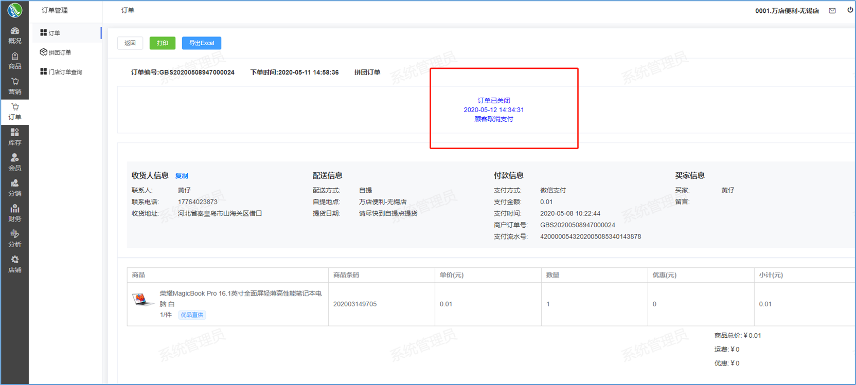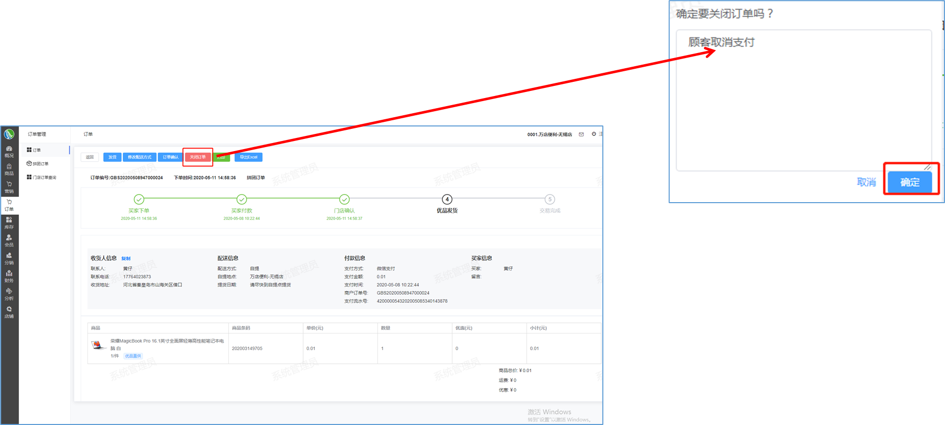 如何关闭订单-功能介绍 通过选择关闭订单按钮,将关闭的商品信息详细的展示出来。  如何关闭订单-功能路径 B2C门店运营管理后台->订单->订单->待确认->查看详情  如何关闭订单-操作流程-关闭订单 关闭订单:您可以点击关闭订单按钮,如图会弹出一个提示框是否确认关闭,您还可以在备注栏里输入取消订单原因,例如:顾客取消支付等等,然后点击确定。  如何关闭订单-操作流程-确认关闭 确认关闭:当您确认关闭成功后,您可以看到如图的订单信息。