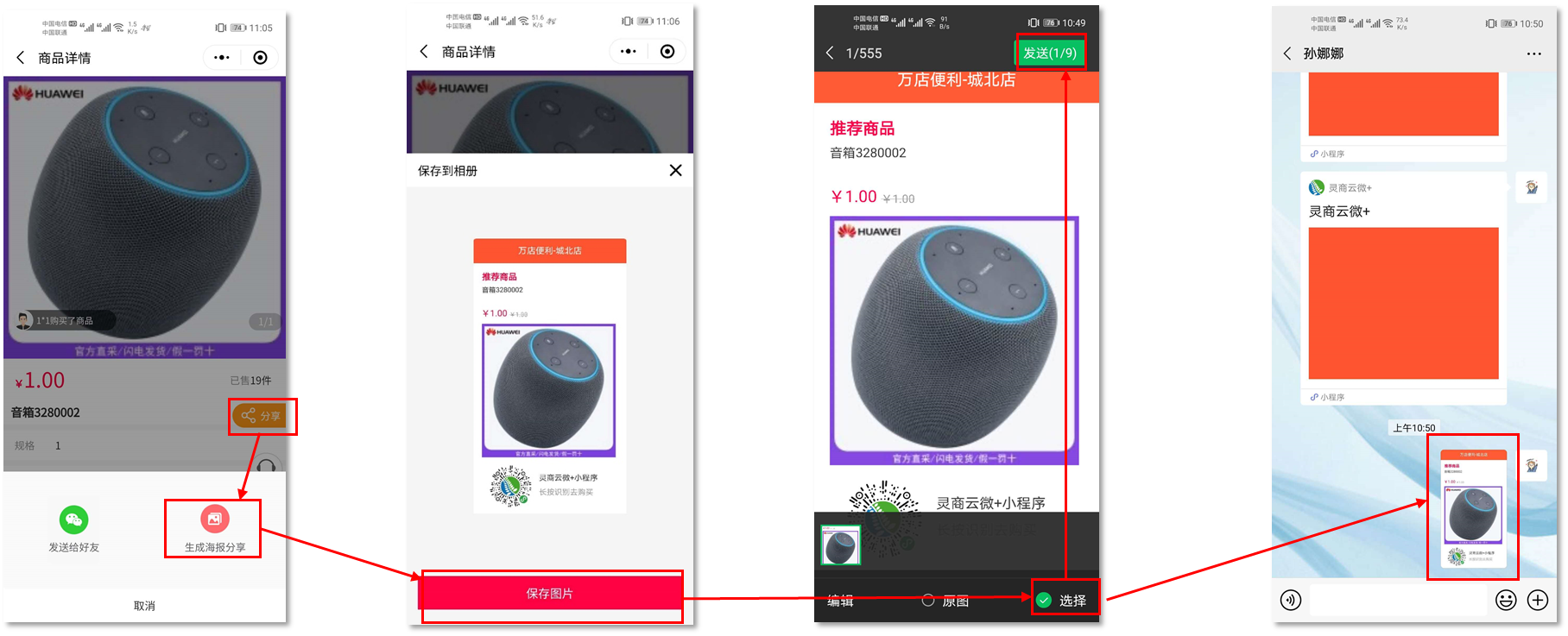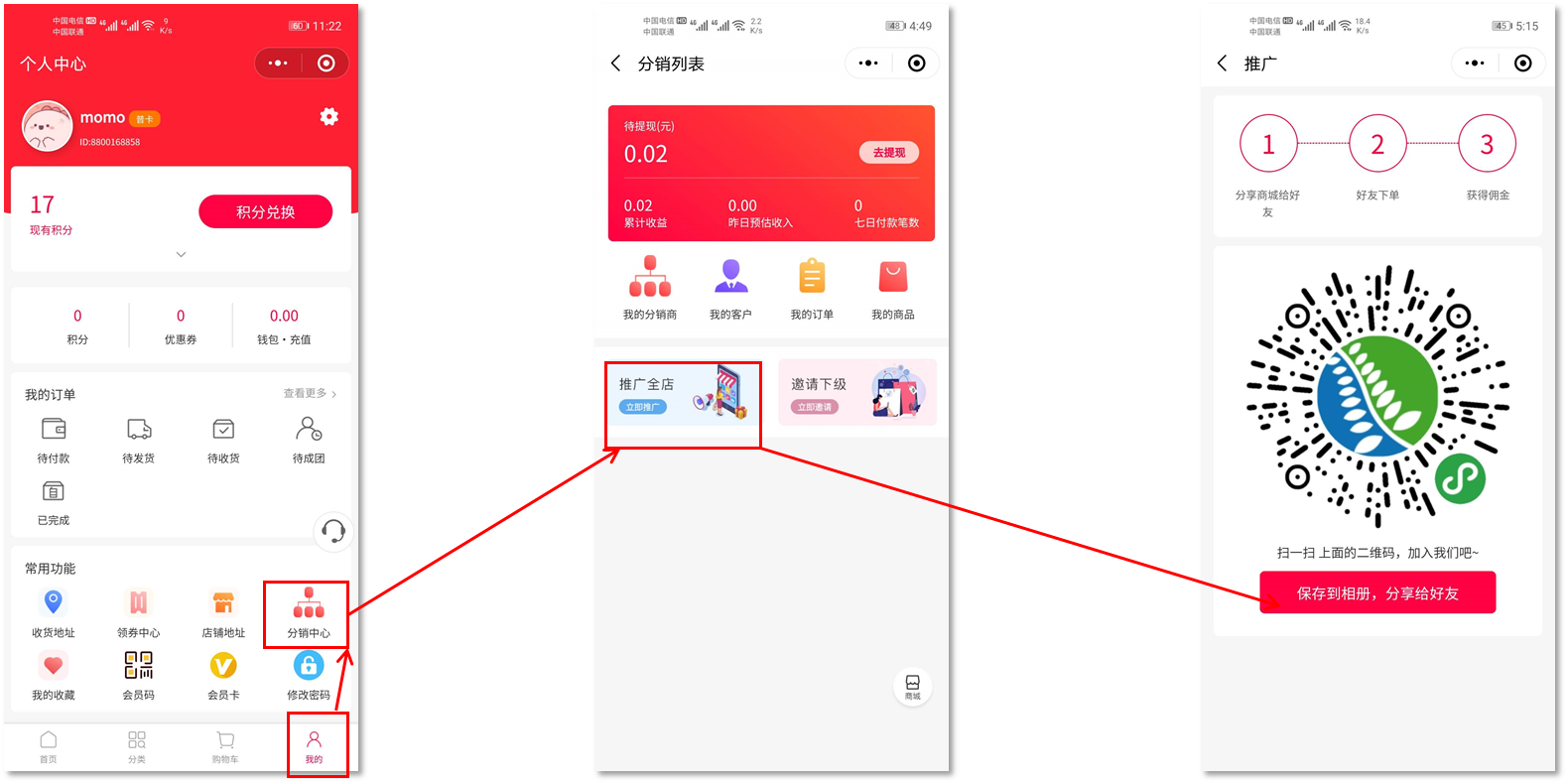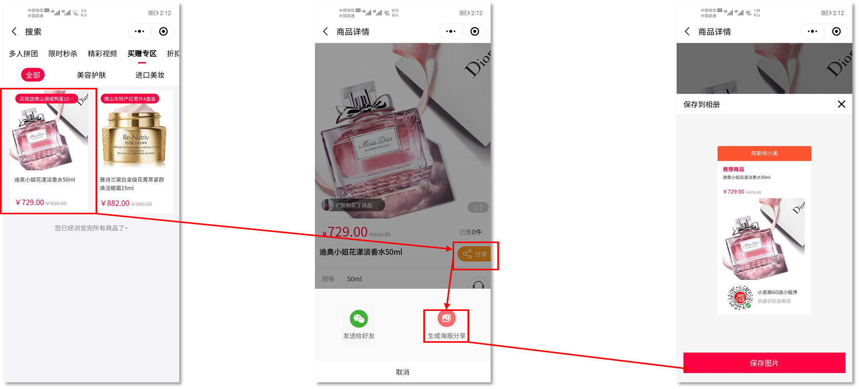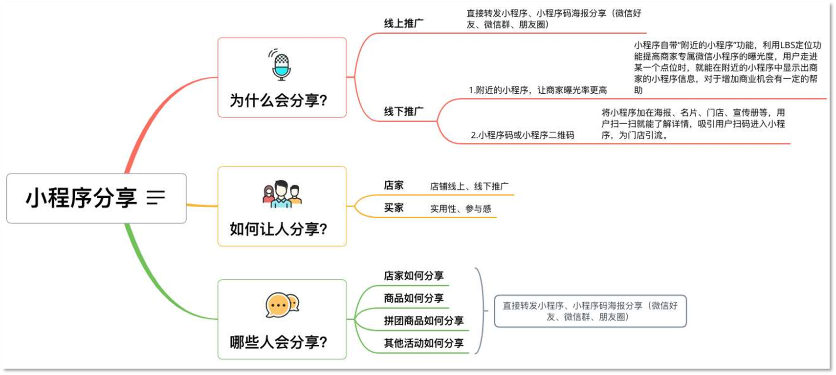 小程序分享-思维导图 思维导图  小程序分享-为什么会分享-线上推广 线上推广:直接转发小程序(微信好友、微信群)。首先您可以在微信页面点击发现”选项,进入“小程序”选项,在页面找到您想分享给朋友 的小程序,然后在该小程序页面右上角的“三点”图标点击选择发送给好友即可。  小程序分享-为什么会分享-线上推广 线上推广: 转发小程序码海报分享(微信好友、微信群),当您把小程序中的图片保存后,在打开您保存的小程序海报分享如图点击选择并发送,当好友收到后即发送成功。  小程序分享-为什么会分享-线下推广 线下推广: 1.附近的小程序,让商家曝光率更高在微信发现页中,小程序自带“附近的小程序”功能,利用LBS定位功能提高商家专属微信小程序的曝光度,用户走进某一个点位时, 就能在附近的小程序中显示出商家的小程序信息,对于增加商业机会有一定的帮助。 2.打开手机微信,向下滑动屏幕就能看到你最近常用的小程序,也可以搜索您要推广的小程序。  小程序分享-为什么会分享-线下推广 线下推广: 3.小程序码或小程序二维码将小程序加在海报、名片、门店、宣传册等,用户扫一扫就能了解详情,吸引用户扫码进入小程序,为门店引流。店铺门前放海报等宣传活动(如图)。而商家只需要在广告宣传单醒目的位置印上小程序码,当然也包括收银台桌贴、货架等用户可以直接触达的地方张贴小程序码,引导用户扫码使用。  小程序分享-如何让人分享-买赠商品如何分享 买赠商品如何分享:直接转发小程序、小程序码海报分享(微信好友、微信群)您可以直接搜索买赠的商品,进入到该商品后点击如图的分享按钮,然后可以分享给好友,或者点击生成海报分享保存图片,再可以把生成的海报发送到微信群或者朋友圈中。  小程序分享-如何让人分享-拼团商品如何分享 拼团商品如何分享:直接转发小程序、小程序码海报分享(微信好友、微信群)您可以直接搜索拼团的商品,进入到该商品后点击如图的分享按钮,然后可以分享给好友,或者点击生成海报分享保存图片,再可以把拼团商品生成的海报发送到微信群或者朋友圈中.  小程序分享-如何让人分享-限时购商品如何分享 限时购商品如何分享:直接转发小程序、小程序码海报分享(微信好友、微信群)例如您可以直接搜索限时购的商品,进入到该商品后点击如图的分享按钮,然后可以分享给好友,或者点击生成海报分享保存图片,再可以把商品生成的海报发送到微信群或者朋友圈中。  小程序分享-如何让人分享-分销商如何推广门店 分销商如何推广门店:您可以在分销中心中点击推广全店,然后保存到相册中,然后将其分享到微信好友、微信群  小程序分享-如何让人分享-分销商如何邀请下级分销商 分销商如何邀请下级分销商:您可以在分销中心中点击邀请下级,然后保存到相册中,然后将其分享到微信好友、微信群  小程序分享-如何让人分享-店家小程序 店家名片:您可以点击个人中心模块,然后选择店铺地址,再点击店铺的信息保存分享成海报形式,如图保存图片即分享成功。  小程序分享-如何让人分享-社群 社群:您可以选择您要分享的群组,也可以在相册里将您保存的小程序海报选中点击确认即发送成功。  小程序分享-如何让人分享-朋友圈海报 朋友圈分享:您可以点击如图的摄像头模块,然后从相册中选择您保存的小程序海报,如图即成功将海报分享到朋友圈中。  小程序分享-如何让人分享-创意服务详情 定制分享海报:您可以在总部模块选择您要定制的商品,例如可以根据商品编码来选择您要定制的商品,选择完成后点击确认。  小程序分享-如何让人分享-创意服务详情 定制分享海报:当您在后台把要选择定制的商品添加后,可以在小程序中通过商品编码搜索您要分享的商品,如图带有设计师图标的就是定制商品,您接下来可以分享该商品生成海报分享。