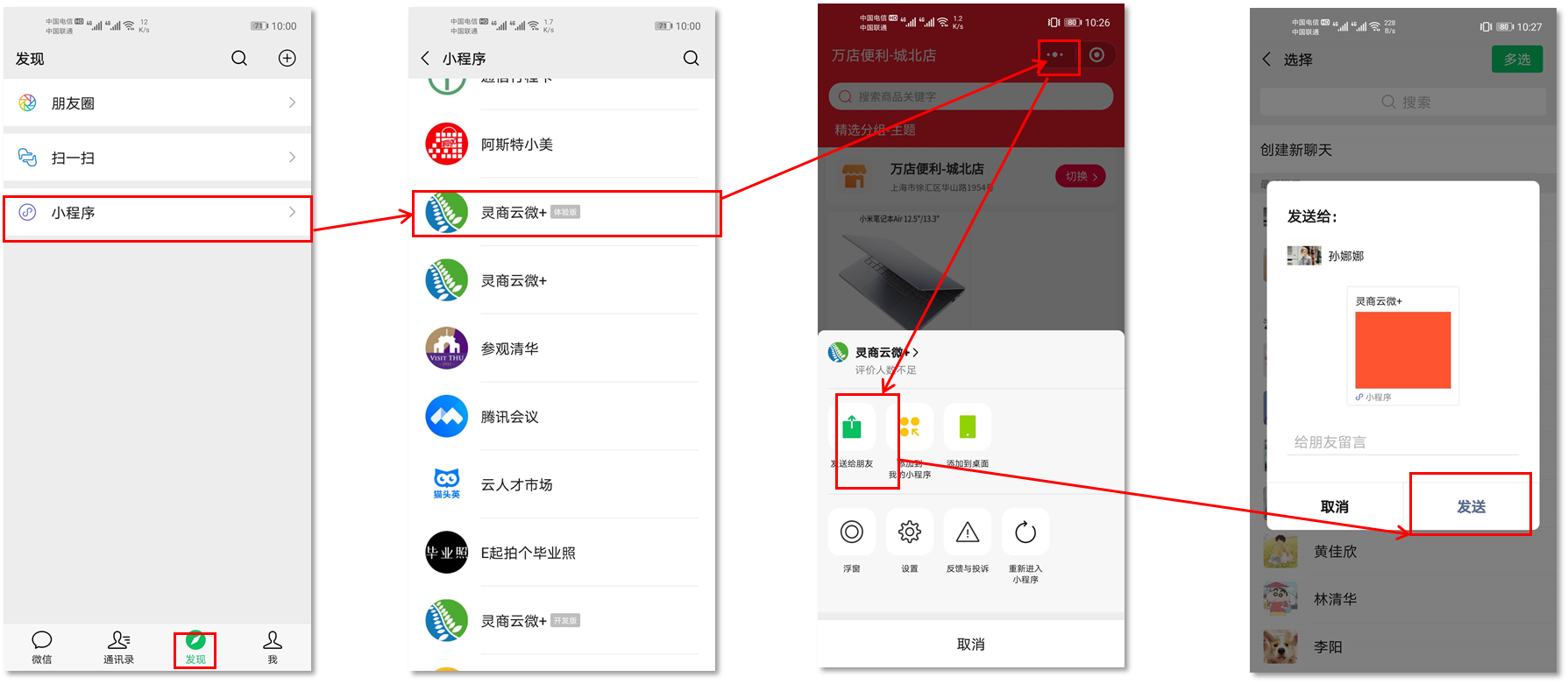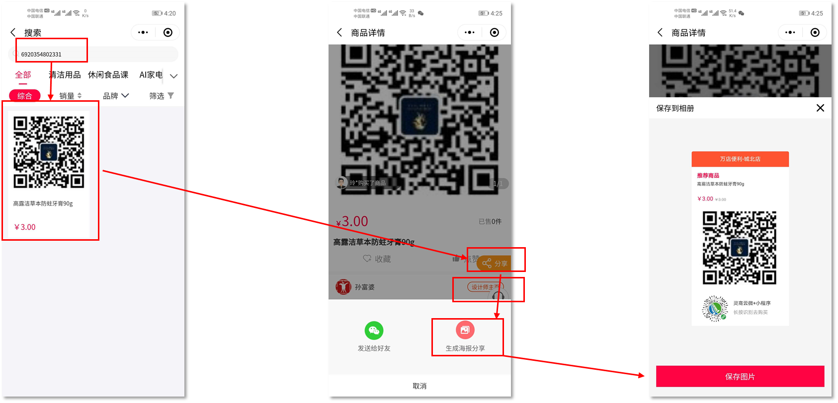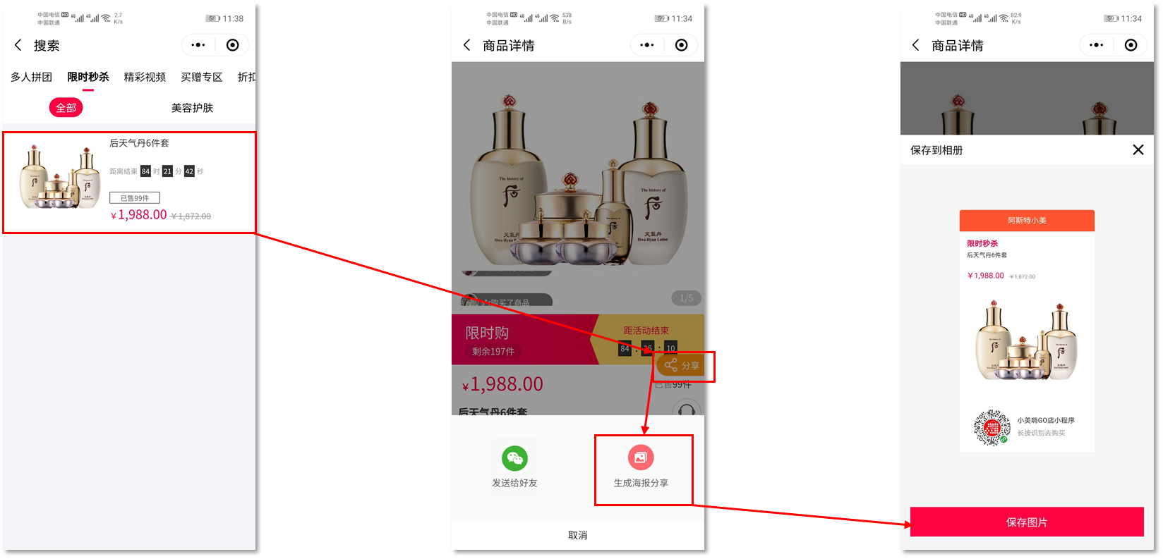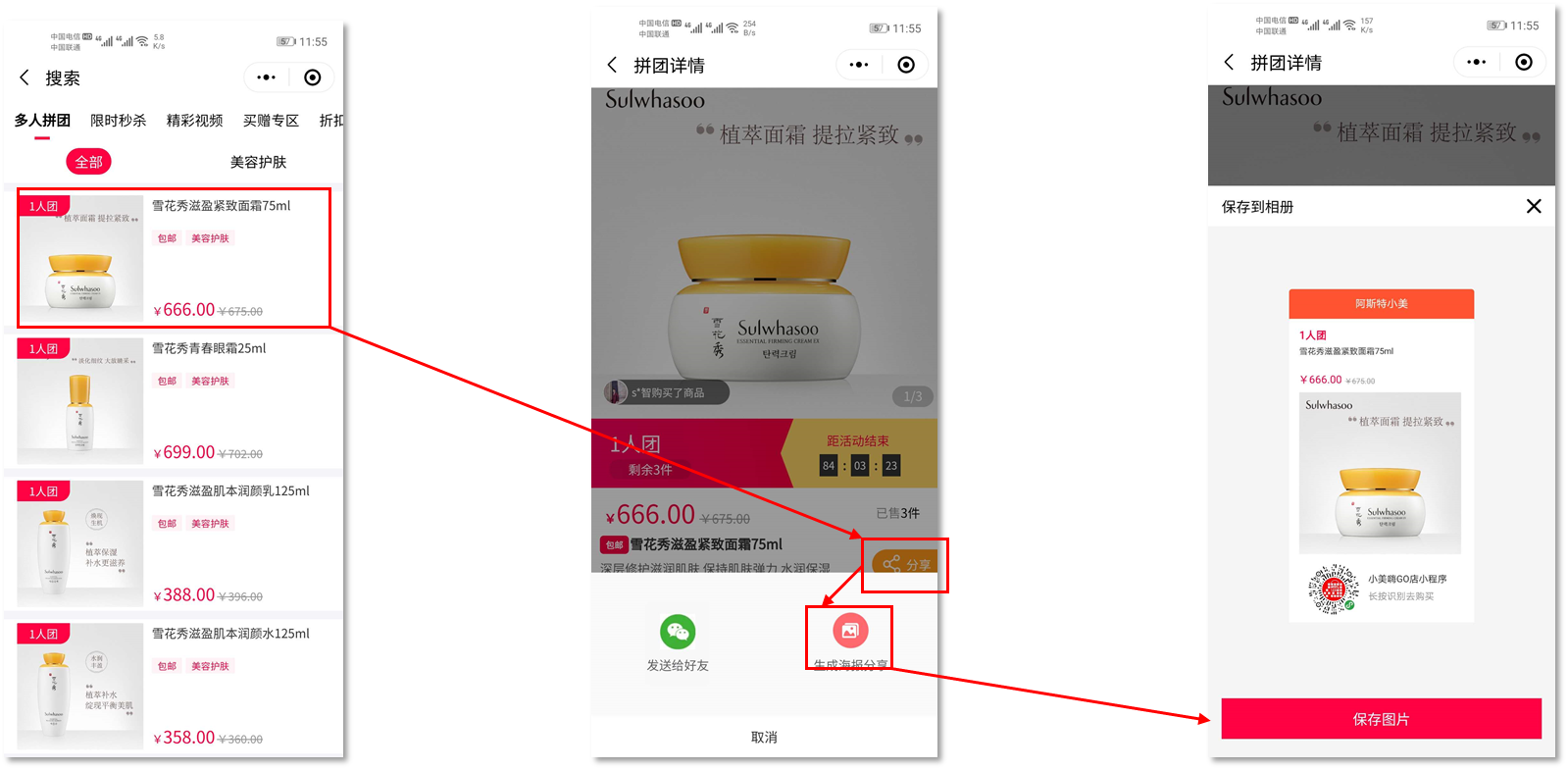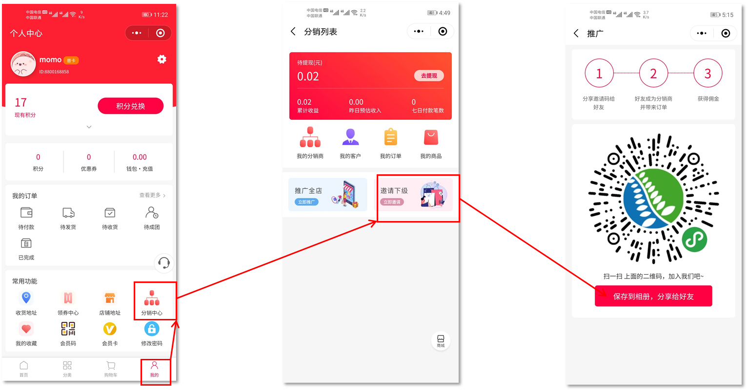 小程序分享-思维导图 思维导图  小程序分享-为什么会分享-线上推广 线上推广:直接转发小程序(微信好友、微信群)。首先您可以在微信页面点击发现”选项,进入“小程序”选项,在页面找到您想分享给朋友 的小程序,然后在该小程序页面右上角的“三点”图标点击选择发送给好友即可。  小程序分享-为什么会分享-线上推广 线上推广: 转发小程序码海报分享(微信好友、微信群),当您把小程序中的图片保存后,在打开您保存的小程序海报分享如图点击选择并发送,当好友收到后即发送成功。  小程序分享-为什么会分享-线下推广 线下推广: 1.附近的小程序,让商家曝光率更高在微信发现页中,小程序自带“附近的小程序”功能,利用LBS定位功能提高商家专属微信小程序的曝光度,用户走进某一个点位时, 就能在附近的小程序中显示出商家的小程序信息,对于增加商业机会有一定的帮助。 2.打开手机微信,向下滑动屏幕就能看到你最近常用的小程序,也可以搜索您要推广的小程序。  小程序分享-为什么会分享-线下推广 线下推广: 3.小程序码或小程序二维码将小程序加在海报、名片、门店、宣传册等,用户扫一扫就能了解详情,吸引用户扫码进入小程序,为门店引流。店铺门前放海报等宣传活动(如图)。而商家只需要在广告宣传单醒目的位置印上小程序码,当然也包括收银台桌贴、货架等用户可以直接触达的地方张贴小程序码,引导用户扫码使用。  小程序分享-如何让人分享-买赠商品如何分享 买赠商品如何分享:直接转发小程序、小程序码海报分享(微信好友、微信群)您可以直接搜索买赠的商品,进入到该商品后点击如图的分享按钮,然后可以分享给好友,或者点击生成海报分享保存图片,再可以把生成的海报发送到微信群或者朋友圈中。  小程序分享-如何让人分享-拼团商品如何分享 拼团商品如何分享:直接转发小程序、小程序码海报分享(微信好友、微信群)您可以直接搜索拼团的商品,进入到该商品后点击如图的分享按钮,然后可以分享给好友,或者点击生成海报分享保存图片,再可以把拼团商品生成的海报发送到微信群或者朋友圈中.  小程序分享-如何让人分享-限时购商品如何分享 限时购商品如何分享:直接转发小程序、小程序码海报分享(微信好友、微信群)例如您可以直接搜索限时购的商品,进入到该商品后点击如图的分享按钮,然后可以分享给好友,或者点击生成海报分享保存图片,再可以把商品生成的海报发送到微信群或者朋友圈中。  小程序分享-如何让人分享-分销商如何推广门店 分销商如何推广门店:您可以在分销中心中点击推广全店,然后保存到相册中,然后将其分享到微信好友、微信群  小程序分享-如何让人分享-分销商如何邀请下级分销商 分销商如何邀请下级分销商:您可以在分销中心中点击邀请下级,然后保存到相册中,然后将其分享到微信好友、微信群  小程序分享-如何让人分享-店家小程序 店家名片:您可以点击个人中心模块,然后选择店铺地址,再点击店铺的信息保存分享成海报形式,如图保存图片即分享成功。  小程序分享-如何让人分享-社群 社群:您可以选择您要分享的群组,也可以在相册里将您保存的小程序海报选中点击确认即发送成功。  小程序分享-如何让人分享-朋友圈海报 朋友圈分享:您可以点击如图的摄像头模块,然后从相册中选择您保存的小程序海报,如图即成功将海报分享到朋友圈中。  小程序分享-如何让人分享-创意服务详情 定制分享海报:您可以在总部模块选择您要定制的商品,例如可以根据商品编码来选择您要定制的商品,选择完成后点击确认。  小程序分享-如何让人分享-创意服务详情 定制分享海报:当您在后台把要选择定制的商品添加后,可以在小程序中通过商品编码搜索您要分享的商品,如图带有设计师图标的就是定制商品,您接下来可以分享该商品生成海报分享。