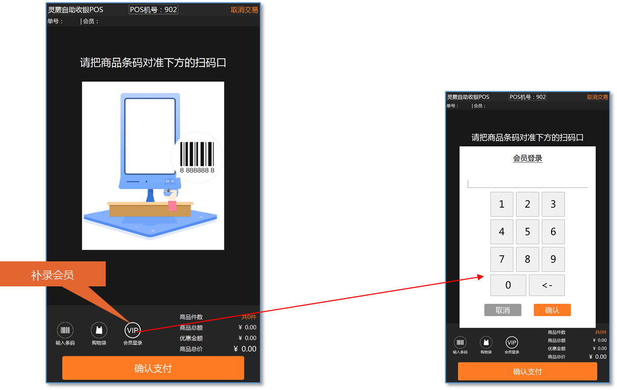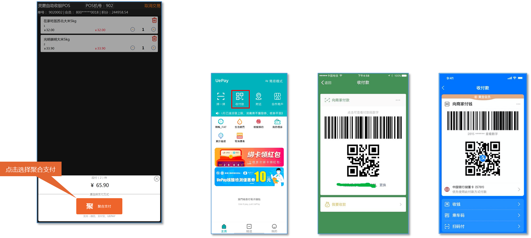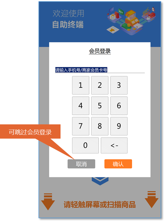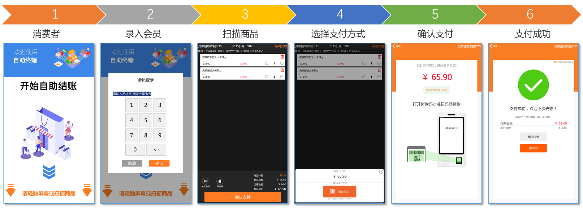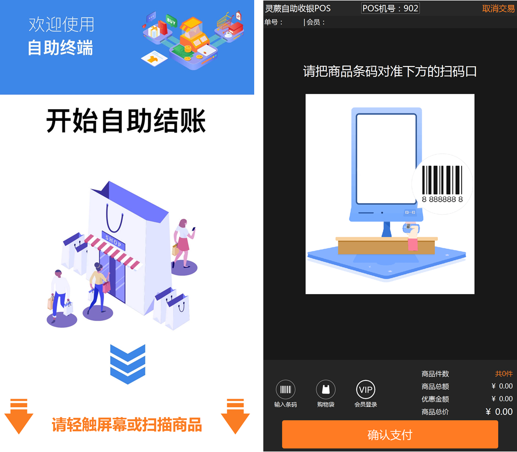 功能介绍 主要用于顾客自助收银,减少收银台人工成本,购物高峰期时可有效分流,大幅减少排队时间  自助POS顾客自主购物流程 让顾客自主完成购物、支付、打包等流程,实现店铺消费效率提升和服务体验优化  自助POS顾客自主购物-首页 •顾客点击屏幕或扫描商品即可进入自助收银 •双击屏幕右上角即可退出自助POS系统  注:每天营业结束后,请双击右上角退出自助POS系统,并且关机 自助POS顾客自主购物-会员登录 •顾客可输入手机号或会员卡号 •顾客不想录入会员号,点击【取消】进入自助扫描界面 •未注册会员,顾客输入手机号后可自动注册 •支持会员自动注册 •国内1开头的11位手机号 •澳门6开头的8位手机号  自助POS顾客自主购物-补录会员 •顾客如果跳过登录页会员登录 •可在商品登录页,点击【会员登录】补录会员信息  自助POS顾客自主购物-扫描商品 •顾客可对准下方的条码扫码口进行商品扫码 •点击商品列右则-+按钮,可增加或减少商品 •点击商品列右则顶部删除按钮,可删除商品 •点击屏幕右上角【取消交易】,可取消当前交易 •点击底部【确认支付】按钮,即可付款  自助POS顾客自主购物-扫描商品 •点击【购物袋】按钮,可选择购物袋到购物车 •点击【快捷商品】按钮,可选择快捷商品到购物车  自助POS顾客自主购物-选择支付方式 •顾客可选择聚合支付付款 •目前UePay聚合支付,支持:微信、支付宝、UePay钱包  自助POS顾客自主购物-扫码支付 •顾客可将付款码对准下方的条码扫码口进行付款 •有300秒的支付等待时间,超时则返回商品展示界面 •扫码提交后,支付过程会等待2-5秒(视网络情况而定)  自助POS顾客自主购物-支付成功/失败 •支付成功后,会显示付款详情 •顾客可点击屏幕中间【重打印小票】重打小票 •支付失败后,顾客可点击屏幕【返回】按钮,返回商品展示界面,重新付款  自助POS顾客自主购物-自助POS功能菜单 双击屏幕左上角【自助终端】即可进入功能菜单  注:需要收银员账号登录,并且有【小票查询】权限 自助POS顾客自主购物-自助POS功能菜单-小票查询 •输入/扫描小票上面的小票订单号即可查询 •小票订单号为空时,查询所有当天小票 •点击小票记录右边【重打印小票】可重打小票  自助POS顾客自主购物-自助POS功能菜单-打印收银汇总单