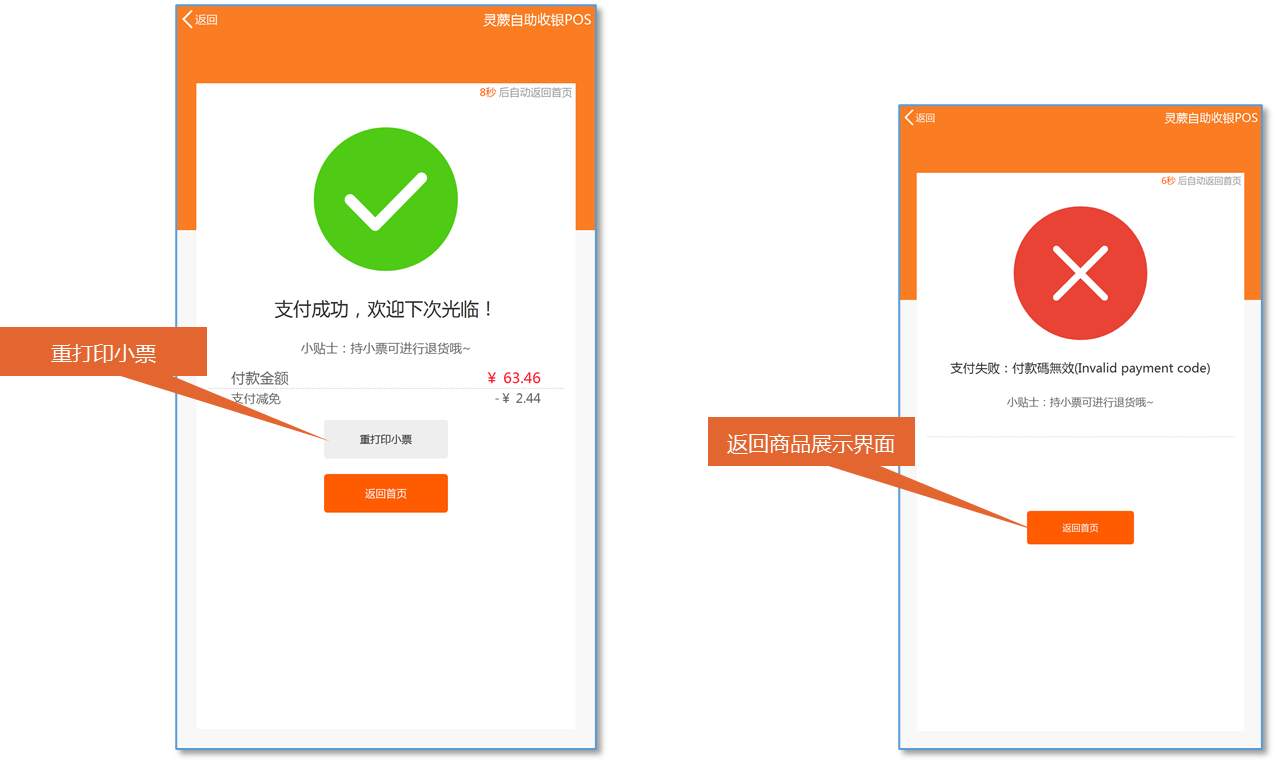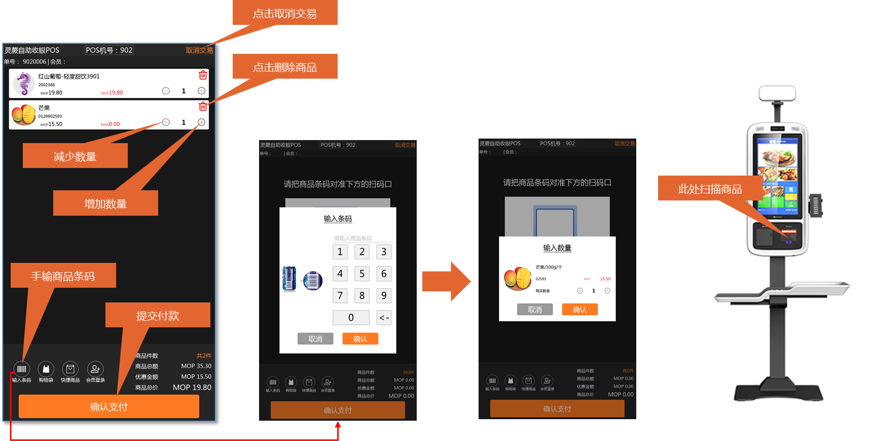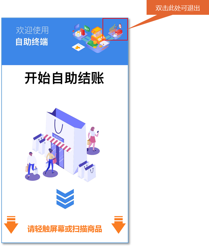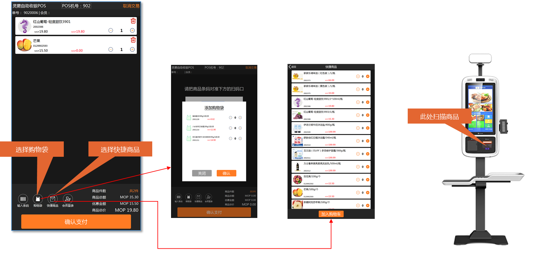 功能介绍 主要用于顾客自助收银,减少收银台人工成本,购物高峰期时可有效分流,大幅减少排队时间  自助POS顾客自主购物流程 让顾客自主完成购物、支付、打包等流程,实现店铺消费效率提升和服务体验优化  自助POS顾客自主购物-首页 •顾客点击屏幕或扫描商品即可进入自助收银 •双击屏幕右上角即可退出自助POS系统  注:每天营业结束后,请双击右上角退出自助POS系统,并且关机 自助POS顾客自主购物-会员登录 •顾客可输入手机号或会员卡号 •顾客不想录入会员号,点击【取消】进入自助扫描界面 •未注册会员,顾客输入手机号后可自动注册 •支持会员自动注册 •国内1开头的11位手机号 •澳门6开头的8位手机号  自助POS顾客自主购物-补录会员 •顾客如果跳过登录页会员登录 •可在商品登录页,点击【会员登录】补录会员信息  自助POS顾客自主购物-扫描商品 •顾客可对准下方的条码扫码口进行商品扫码 •点击商品列右则-+按钮,可增加或减少商品 •点击商品列右则顶部删除按钮,可删除商品 •点击屏幕右上角【取消交易】,可取消当前交易 •点击底部【确认支付】按钮,即可付款  自助POS顾客自主购物-扫描商品 •点击【购物袋】按钮,可选择购物袋到购物车 •点击【快捷商品】按钮,可选择快捷商品到购物车  自助POS顾客自主购物-选择支付方式 •顾客可选择聚合支付付款 •目前UePay聚合支付,支持:微信、支付宝、UePay钱包  自助POS顾客自主购物-扫码支付 •顾客可将付款码对准下方的条码扫码口进行付款 •有300秒的支付等待时间,超时则返回商品展示界面 •扫码提交后,支付过程会等待2-5秒(视网络情况而定)  自助POS顾客自主购物-支付成功/失败 •支付成功后,会显示付款详情 •顾客可点击屏幕中间【重打印小票】重打小票 •支付失败后,顾客可点击屏幕【返回】按钮,返回商品展示界面,重新付款  自助POS顾客自主购物-自助POS功能菜单 双击屏幕左上角【自助终端】即可进入功能菜单  注:需要收银员账号登录,并且有【小票查询】权限 自助POS顾客自主购物-自助POS功能菜单-小票查询 •输入/扫描小票上面的小票订单号即可查询 •小票订单号为空时,查询所有当天小票 •点击小票记录右边【重打印小票】可重打小票  自助POS顾客自主购物-自助POS功能菜单-打印收银汇总单