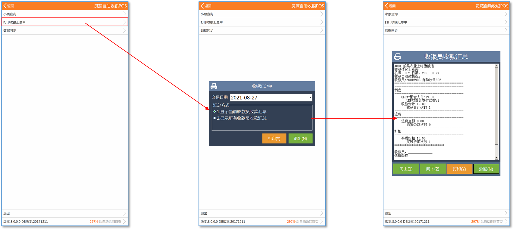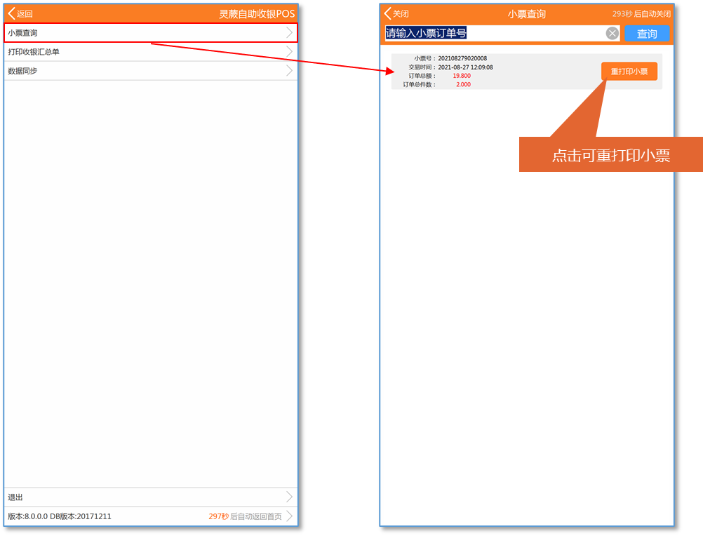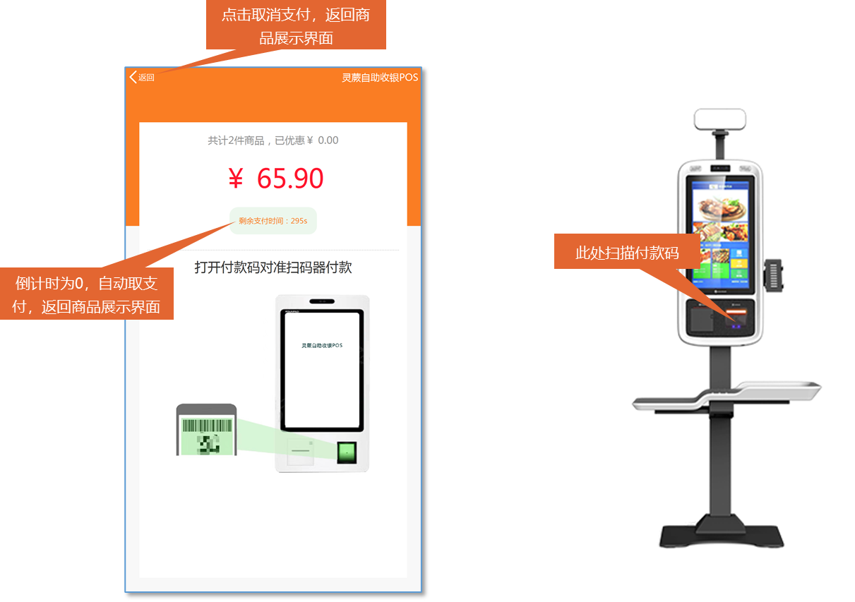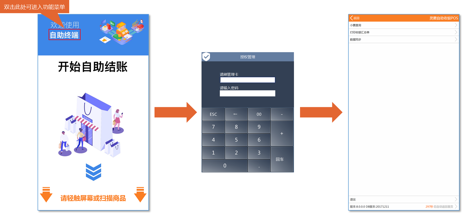 功能介绍 主要用于顾客自助收银,减少收银台人工成本,购物高峰期时可有效分流,大幅减少排队时间  自助POS顾客自主购物流程 让顾客自主完成购物、支付、打包等流程,实现店铺消费效率提升和服务体验优化  自助POS顾客自主购物-首页 •顾客点击屏幕或扫描商品即可进入自助收银 •双击屏幕右上角即可退出自助POS系统  注:每天营业结束后,请双击右上角退出自助POS系统,并且关机 自助POS顾客自主购物-会员登录 •顾客可输入手机号或会员卡号 •顾客不想录入会员号,点击【取消】进入自助扫描界面 •未注册会员,顾客输入手机号后可自动注册 •支持会员自动注册 •国内1开头的11位手机号 •澳门6开头的8位手机号  自助POS顾客自主购物-补录会员 •顾客如果跳过登录页会员登录 •可在商品登录页,点击【会员登录】补录会员信息  自助POS顾客自主购物-扫描商品 •顾客可对准下方的条码扫码口进行商品扫码 •点击商品列右则-+按钮,可增加或减少商品 •点击商品列右则顶部删除按钮,可删除商品 •点击屏幕右上角【取消交易】,可取消当前交易 •点击底部【确认支付】按钮,即可付款  自助POS顾客自主购物-扫描商品 •点击【购物袋】按钮,可选择购物袋到购物车 •点击【快捷商品】按钮,可选择快捷商品到购物车  自助POS顾客自主购物-选择支付方式 •顾客可选择聚合支付付款 •目前UePay聚合支付,支持:微信、支付宝、UePay钱包  自助POS顾客自主购物-扫码支付 •顾客可将付款码对准下方的条码扫码口进行付款 •有300秒的支付等待时间,超时则返回商品展示界面 •扫码提交后,支付过程会等待2-5秒(视网络情况而定)  自助POS顾客自主购物-支付成功/失败 •支付成功后,会显示付款详情 •顾客可点击屏幕中间【重打印小票】重打小票 •支付失败后,顾客可点击屏幕【返回】按钮,返回商品展示界面,重新付款  自助POS顾客自主购物-自助POS功能菜单 双击屏幕左上角【自助终端】即可进入功能菜单  注:需要收银员账号登录,并且有【小票查询】权限 自助POS顾客自主购物-自助POS功能菜单-小票查询 •输入/扫描小票上面的小票订单号即可查询 •小票订单号为空时,查询所有当天小票 •点击小票记录右边【重打印小票】可重打小票  自助POS顾客自主购物-自助POS功能菜单-打印收银汇总单