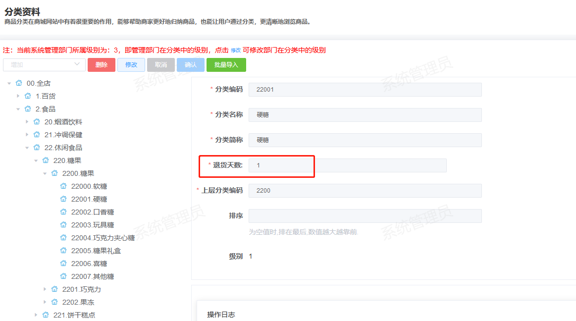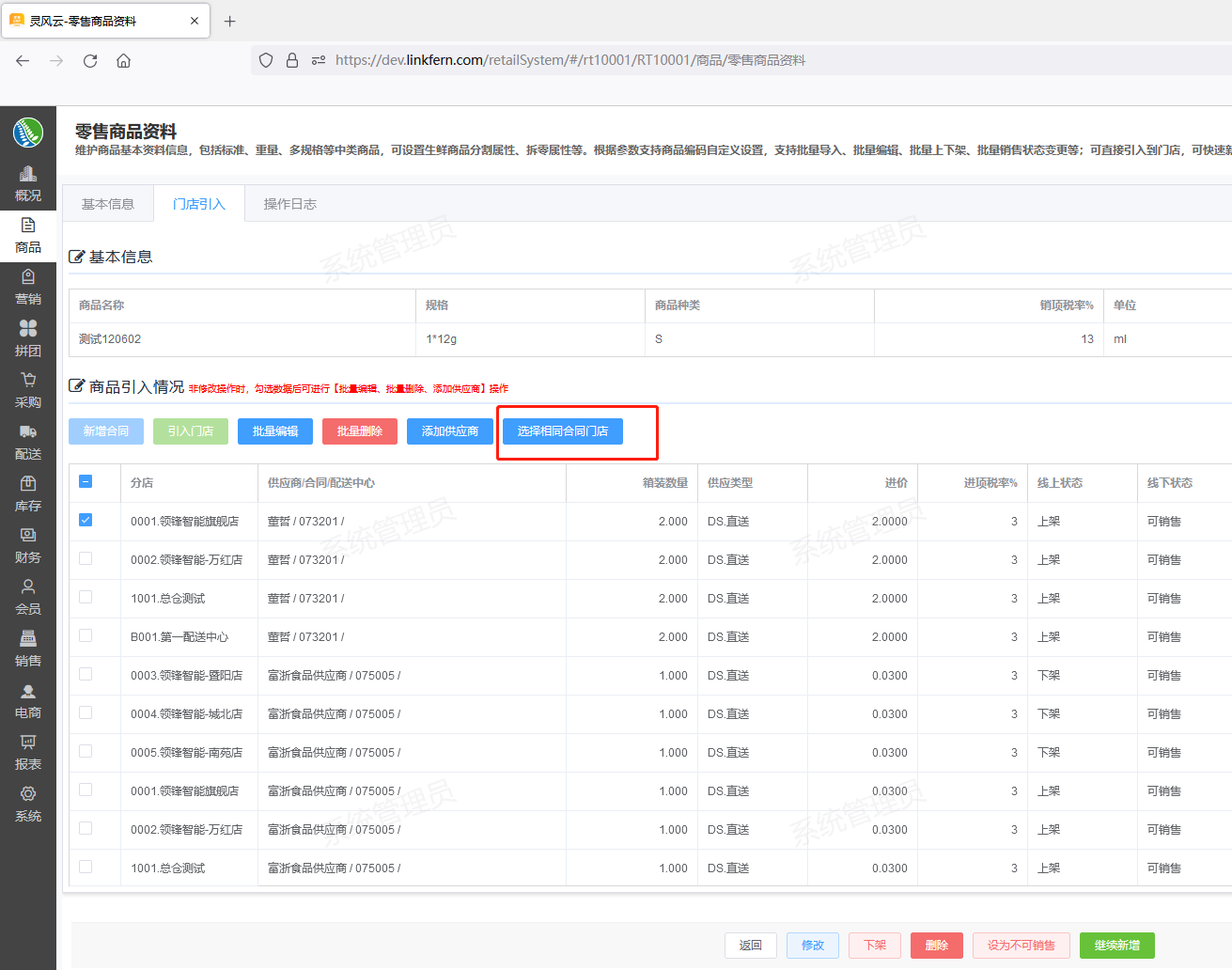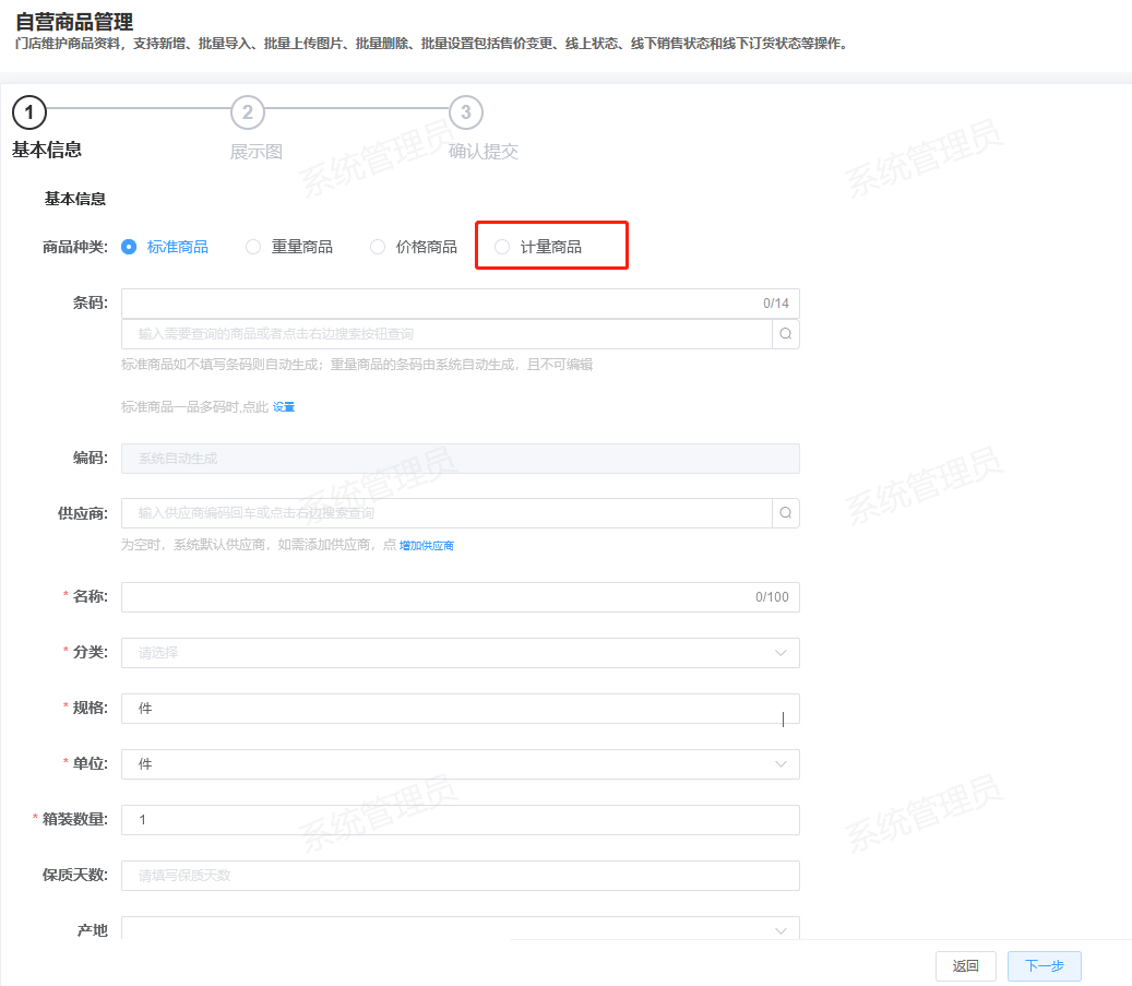 ## 新零售业务中台(单店版)更新 1.RT10002.商品管理:增加「计量商品」种类添加,增加箱装、保质天数等字段 模块路径:门店 - 商品/自营商品管理 验证内容: 1.批量导入-增加计量商品导入 2.新增/修改详情页增加商品种类「计量商品」单选按钮   ## 新零售总部管理中台更新 1.RT10001.零售商品资料:门店引入页增加「勾选相同合同分店」按钮 模块路径:总部 - 商品/零售商品资料 验证内容: 1.非修改操作时,勾选一条数据后,「勾选相同合同分店」按钮可用,点击后,可勾选同已选分店相同合同的门店记录  2.10005.分类资料.开放"退货天数" 模块路径:总部 - 商品-基础资料/零售商品资料 验证内容: 1.超过这个天数小程序不显示售后服务按钮,时间计算:签收日后的第二天零时起开始计算时间