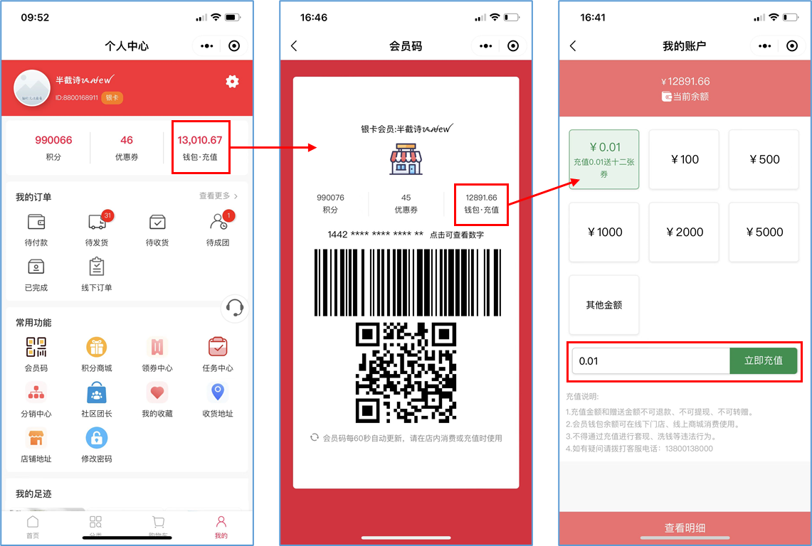 ## 一、活动案例 活动主题:除夕充值好礼-充值送12月礼券包 活动时间:12.30-12.31 ## 二、活动设置步骤 ### 1)设置优惠券券包 #### 【示例】按月份设置包含12张优惠券的券包 #### 【操作】 1.进入零售总部-会员-卡券-优惠券券包模块,新增一个按月份设置生效时间且包含12张优惠券的券包  ### 2)设置充值送券包活动 #### 【示例】设置充值0.1送12月礼券包 #### 【操作】 1.进入零售总部-会员-储值-储值卡充值活动设置模块,新增一个充值0.01元送一个12个月优惠券的券包的活动  ## 三、活动使用场景 ### 商城充值送券包 #### 【示例】顾客商城充值赠送优惠券券包 #### 【操作】 1.进入商城小程序-个人中心-钱包充值中进行充值,充值成功立即赠送优惠券券包  ### 查看优惠券 1.进入商城小程序个人中心,点击优惠券查看优惠券  ### 查看优惠券消息 1.在灵蕨科技微信公众号中查看优惠券到账消息  ## 四、活动结果(相关报表,数据截图) 1.进入零售总部->会员->储值->储值卡充值明细查询报表可查看充值记录  2.进入零售总部->会员->卡券->优惠券信息查询报表可查看优惠券信息