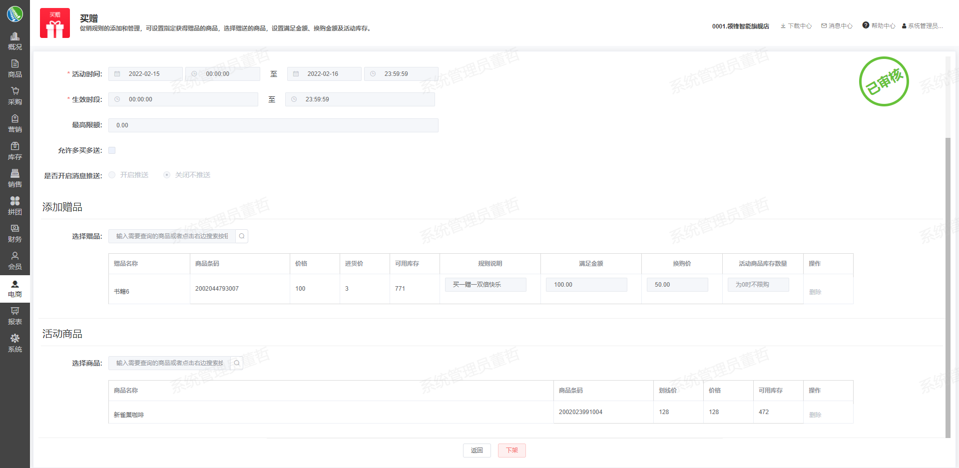 ## 一、活动案例  ## 二、活动设置步骤 ### 1)设置买一赠一活动 #### 【示例】设置线上商城的买一赠一多个商品活动 #### 【操作】 1.进入门店->电商->营销->买赠模块,新增一个买一赠一的活动  ### 2)设置后台发放的优惠券券包 #### 【示例】设置含3张优惠券的券包,渠道为:其他渠道,优惠券限定使用商品,限买一赠一活动商品才可使用 #### 【操作】 1.进入门店->会员->卡券->优惠券券包,新增一个包含三张券,发放渠道为其它渠道,优惠券使用限制为指定的买一赠一活动商品的券包  ### 3)直接筛选会员并发放券包 #### 【示例】筛选银卡会员,直接发放1个优惠券券包 #### 【操作】 1.进入门店->会员->卡券->会员电子券发放,新增一个发券单,直接发放一个优惠券券包给指定的会员客户   ## 三、活动使用场景 ### 顾客收到发放券包通知,查看优惠券 #### 【操作】 1.顾客关注的灵蕨科技微信公众号会自动发送优惠券到账消息  ### 顾客购买买一赠一商品并用券 #### 【示例】顾客通过搜索、扫码、分享链接进入商城小程序,注册并下单提货 #### 【操作】 1.顾客注册登录商城小程序,搜索到买一赠一活动商品下单并使用优惠券  #### 查看积分记录 1.进入商城小程序个人中心,点击积分查看积分记录  #### 查看优惠券 1.进入商城小程序个人中心,点击优惠券查看优惠券  ## 四、活动结果(相关报表,数据截图) 1.进入门店->会员->积分报表->会员卡积分流水,查看会员积分记录  2.进入门店->会员->卡券->优惠券信息查询报表查看优惠券