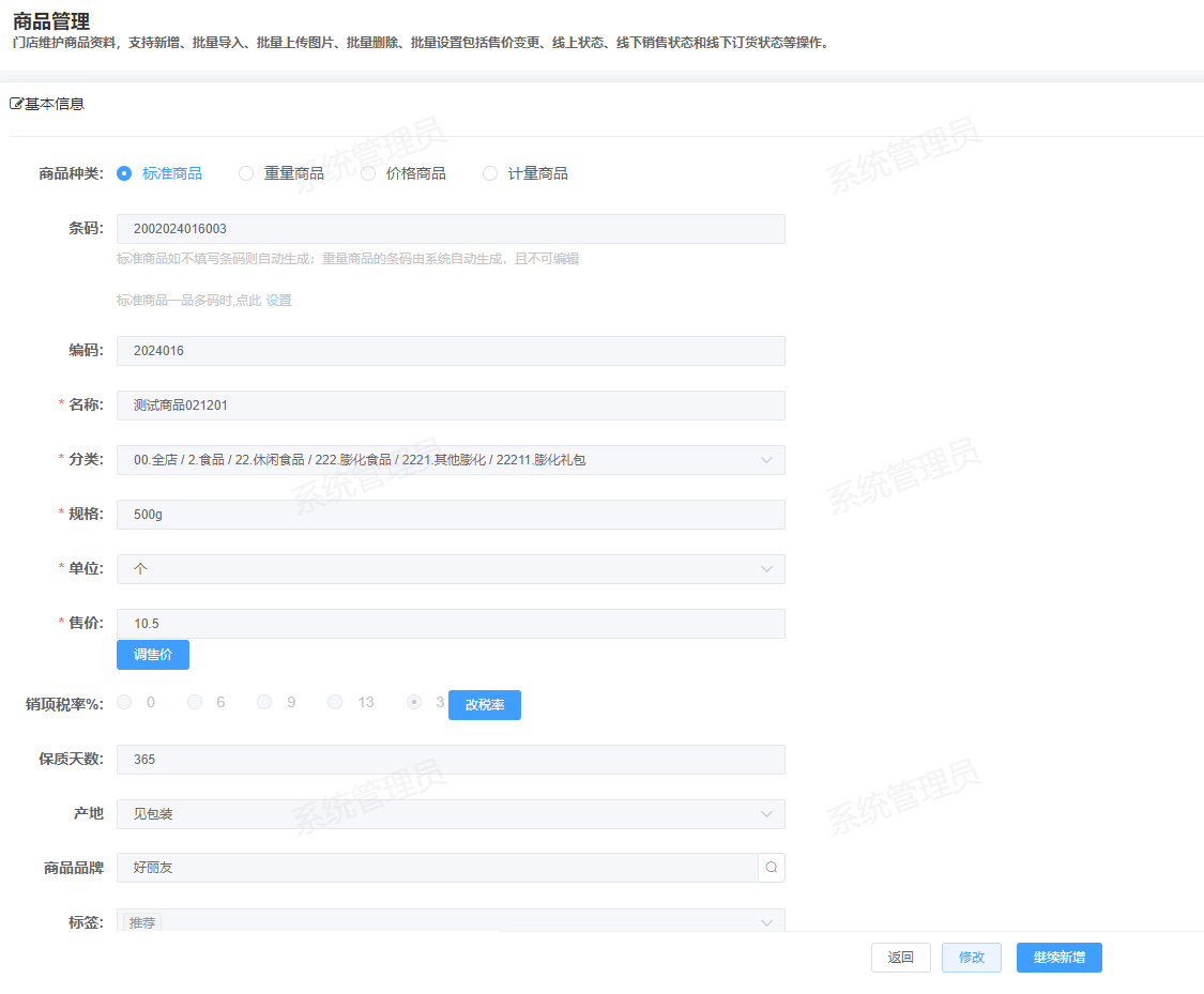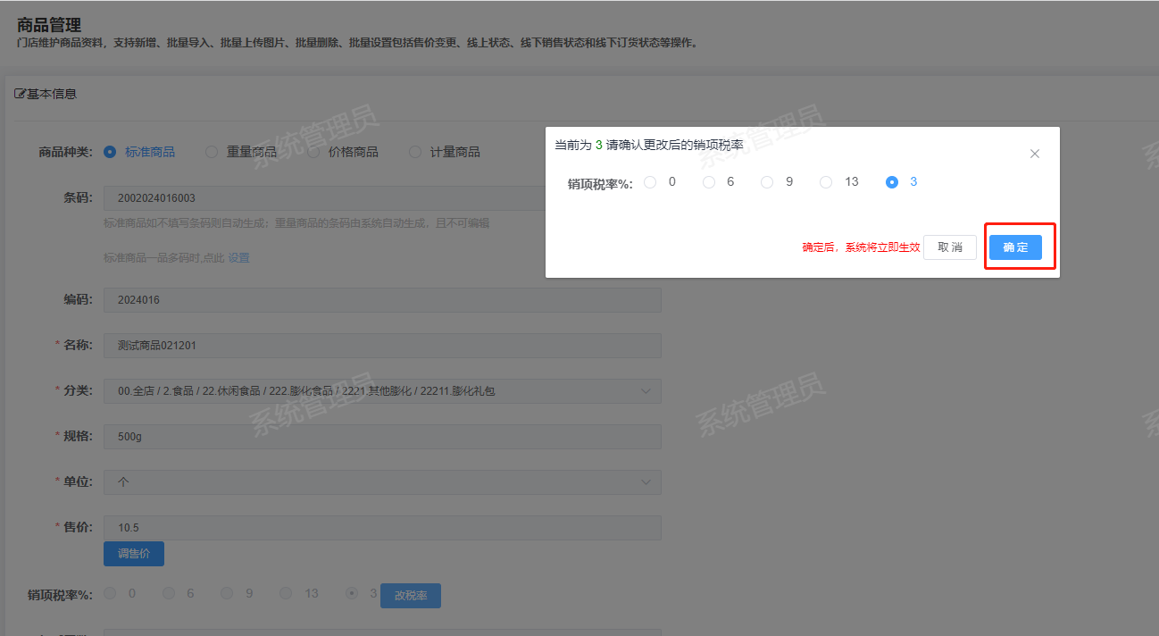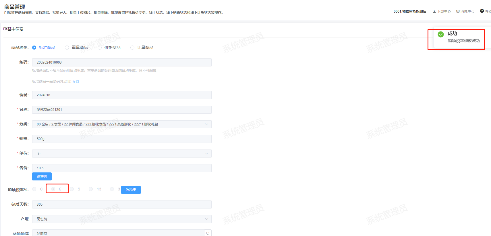 ## 案例说明 修改商品销项税率  ## 使用场景 ### 功能路径 灵风云新零售零售业务门店系统->商品->商品管理 ### 修改销项税率 1.选择商品,进入详情页  2.点击改税率,选择新税率后确定  3.商品修改税率成功