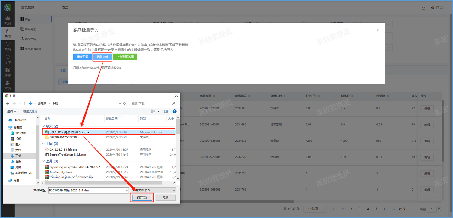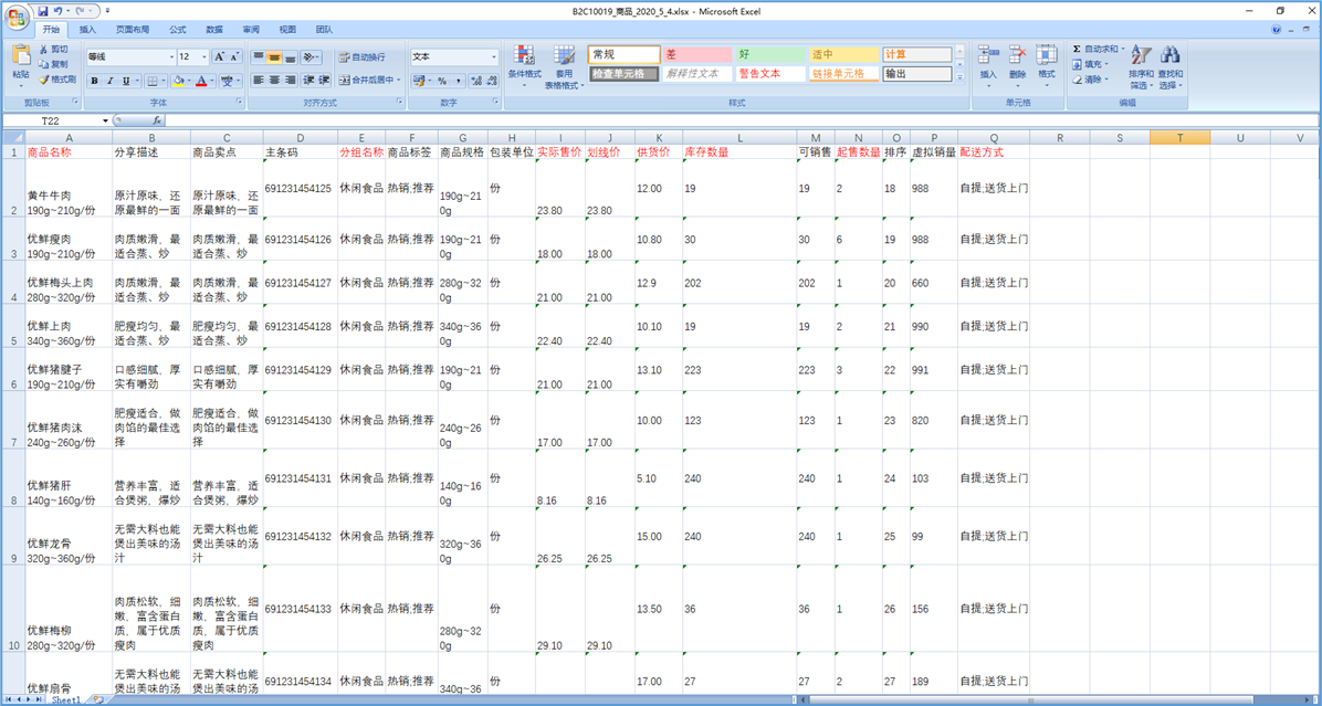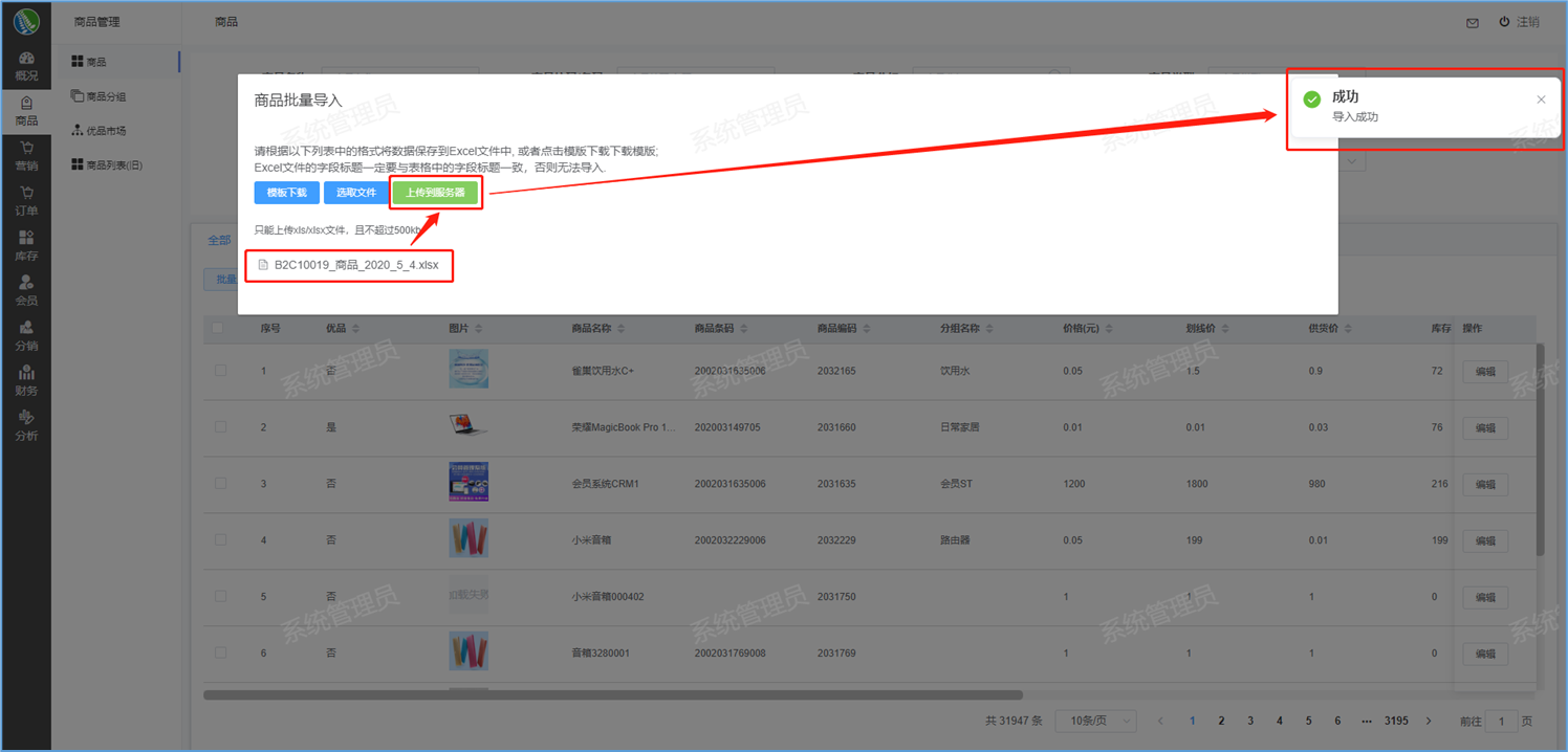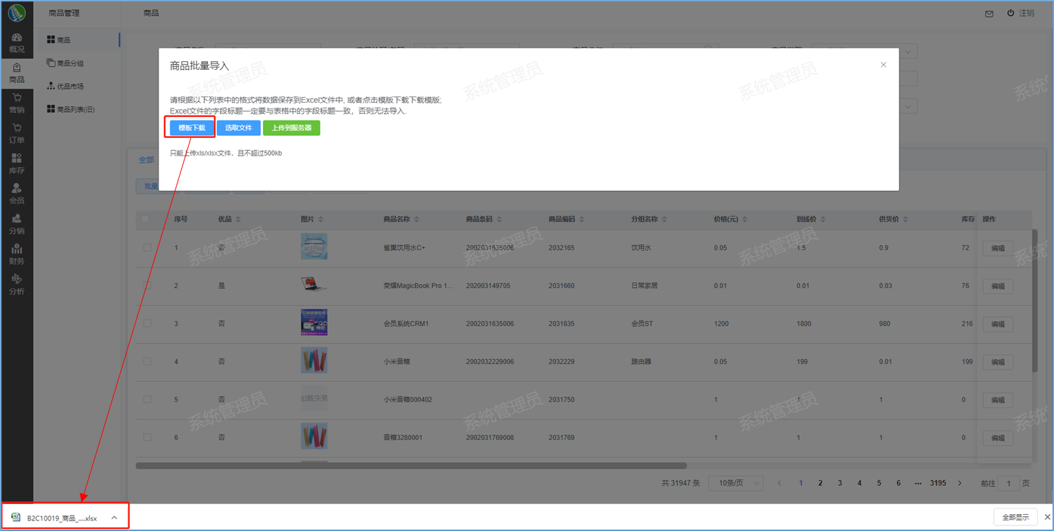 批量导入商品-功能介绍 通过批量导入商品功能,以 Excel 的形式将商品批量导入到系统中。  批量导入商品-功能路径 B2C 门店运营管理后台-> 商品-> 商品-> 商品批量导入  批量导入商品-操作流程-模板下载 模板下载:您可以在这里点击模板下载,当您下载成功后会显示在浏览器左下角(如图)。  批量导入商品-操作流程-添加商品基本信息 填写商品信息:当您下载好模板后打开模板,然后根据提示填写相关信息。当您填写完成后保存该模板。 ① 导入文件单元格必须都为文本格式; ② 当商品名称多项取值时,使用英文分号间隔。示例:热销;推荐 ③ 当配送方式多项取值时,使用英文分号间隔。示例:自提;邮寄快递 ④ 可销售的设置值,为 0 或空表示暂不售卖,放入仓库;为 1 表示立即上架售卖;为空 ⑤ 导入必填项字段如下(红色字段):商品名称、分组名称、实际售价、划线价、供货价、库存数量、起售数量、配送方式 注:文档中第一条商品信息描述部分不可更改 ,且红色字段为必填字段。  批量导入商品-操作流程-选择文件 将填写好的表格上传:当您完成模板的填写后,点击选择文件,如图所示将保存好的文档选中然后点击打开。 注:文件上传的时候只能上传 xls/xlsx 文件,并且不能超过 500kb。  批量导入商品-操作流程-上传服务器 上传到服务器:当您选择的文件选择成功后会显示在如图部分,再点击上传服务器,弹出导入成功的字样即您的商品批量导入成功了。  批量导入商品-操作流程-编辑导入成功的商品 当您的商品导入成功后,您可以在商品模块搜索您导入成功的商品,也点击“编辑”按钮对商品信息进行修改。  批量导入商品-操作流程-上架商品 当您所有的商品信息都填写完成后,下滑到商品信息底部,点击“修改”按钮,点击“立即上架商品”,即可将商品上架到小程序商城中。