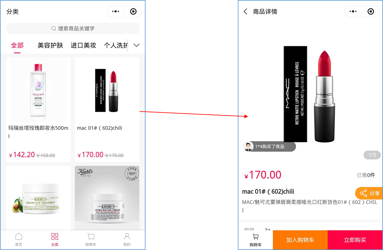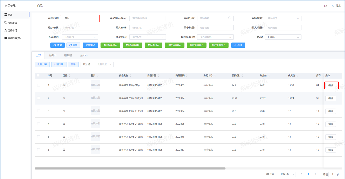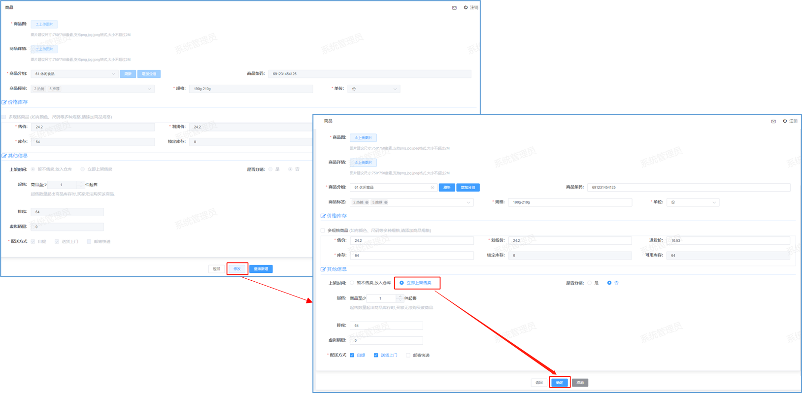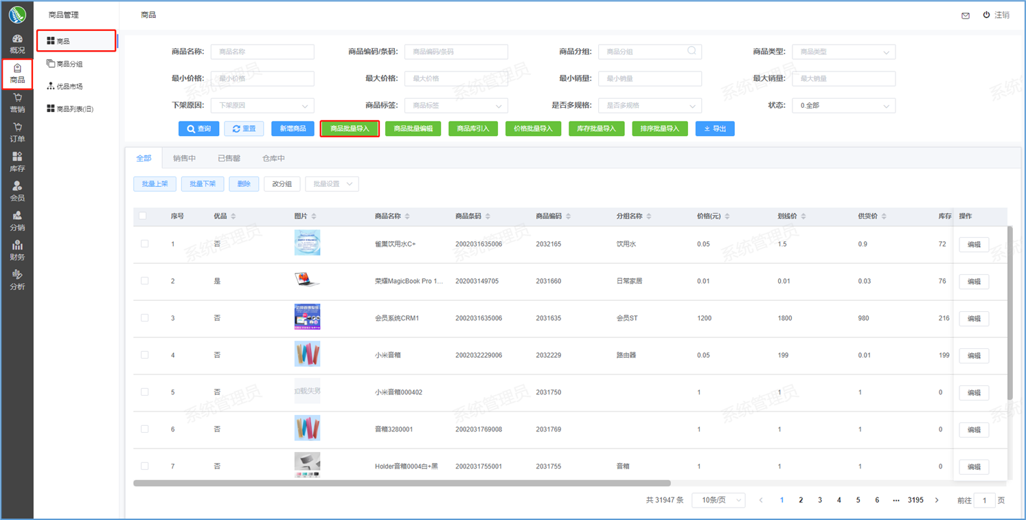 批量导入商品-功能介绍 通过批量导入商品功能,以 Excel 的形式将商品批量导入到系统中。  批量导入商品-功能路径 B2C 门店运营管理后台-> 商品-> 商品-> 商品批量导入  批量导入商品-操作流程-模板下载 模板下载:您可以在这里点击模板下载,当您下载成功后会显示在浏览器左下角(如图)。  批量导入商品-操作流程-添加商品基本信息 填写商品信息:当您下载好模板后打开模板,然后根据提示填写相关信息。当您填写完成后保存该模板。 ① 导入文件单元格必须都为文本格式; ② 当商品名称多项取值时,使用英文分号间隔。示例:热销;推荐 ③ 当配送方式多项取值时,使用英文分号间隔。示例:自提;邮寄快递 ④ 可销售的设置值,为 0 或空表示暂不售卖,放入仓库;为 1 表示立即上架售卖;为空 ⑤ 导入必填项字段如下(红色字段):商品名称、分组名称、实际售价、划线价、供货价、库存数量、起售数量、配送方式 注:文档中第一条商品信息描述部分不可更改 ,且红色字段为必填字段。  批量导入商品-操作流程-选择文件 将填写好的表格上传:当您完成模板的填写后,点击选择文件,如图所示将保存好的文档选中然后点击打开。 注:文件上传的时候只能上传 xls/xlsx 文件,并且不能超过 500kb。  批量导入商品-操作流程-上传服务器 上传到服务器:当您选择的文件选择成功后会显示在如图部分,再点击上传服务器,弹出导入成功的字样即您的商品批量导入成功了。  批量导入商品-操作流程-编辑导入成功的商品 当您的商品导入成功后,您可以在商品模块搜索您导入成功的商品,也点击“编辑”按钮对商品信息进行修改。  批量导入商品-操作流程-上架商品 当您所有的商品信息都填写完成后,下滑到商品信息底部,点击“修改”按钮,点击“立即上架商品”,即可将商品上架到小程序商城中。