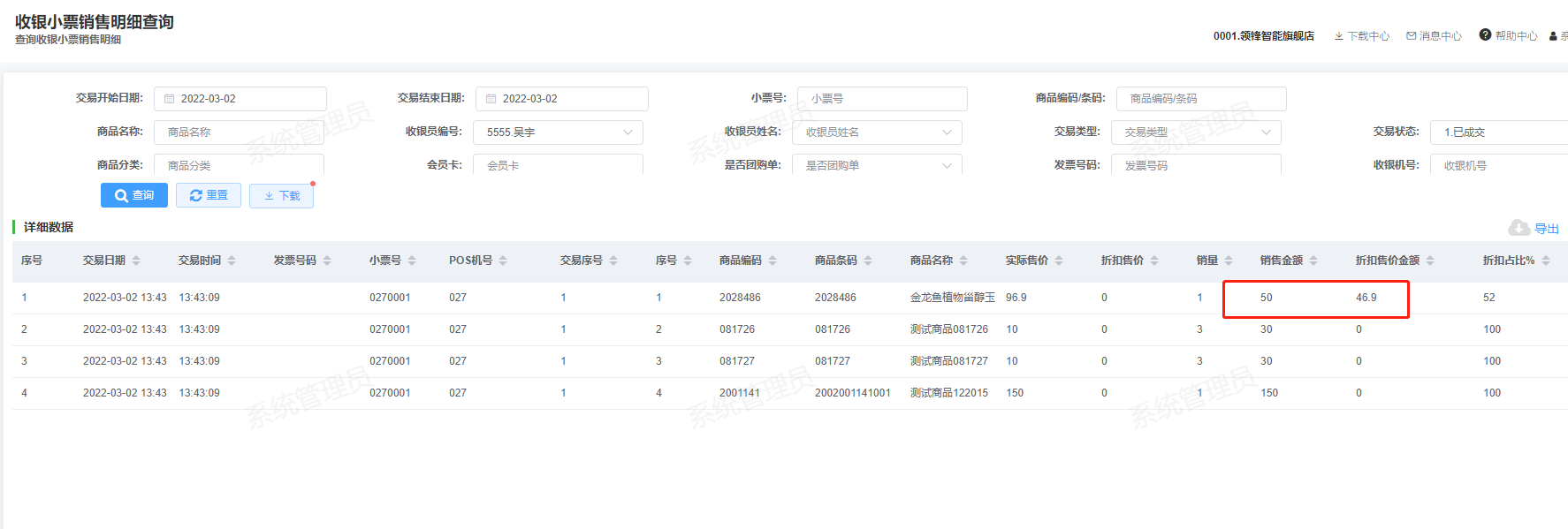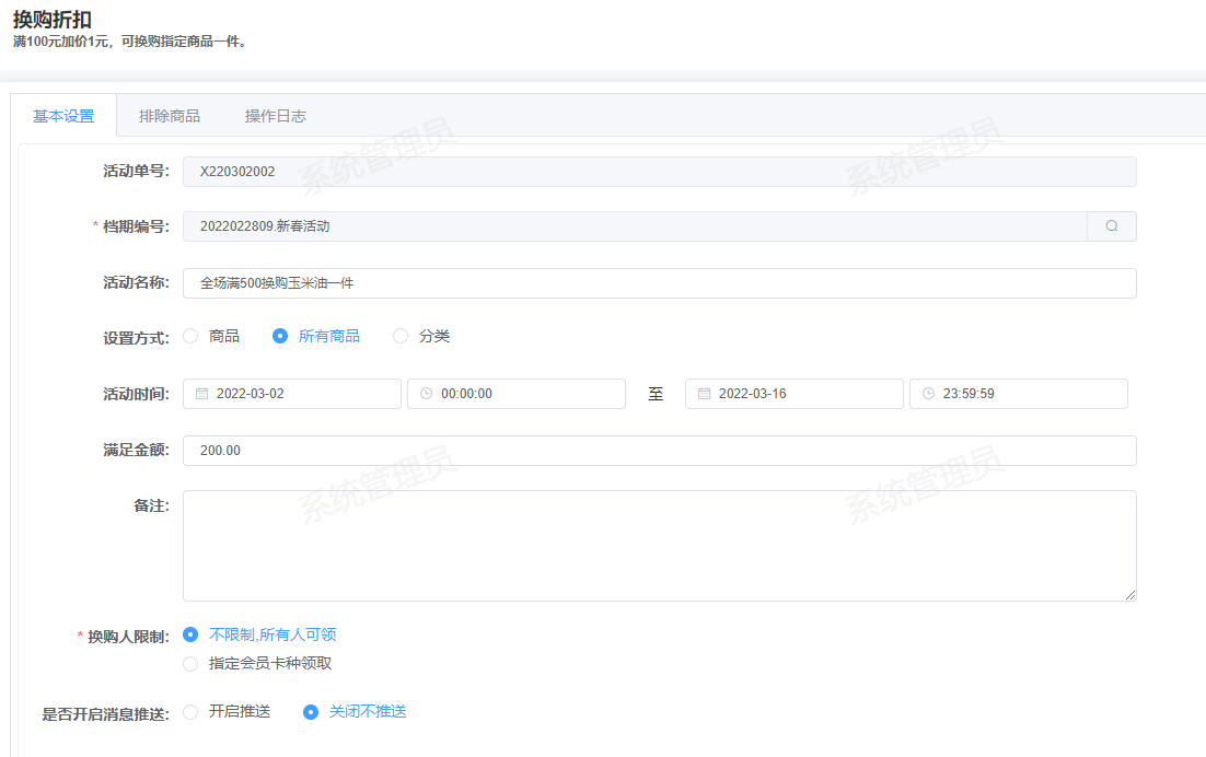 ## 一、活动案例 活动主题:全场满200换购玉米油一件 活动内容:活动期间店内消费,购买金额商品,可在指定时间段享受换购优惠 活动时间:3.2~3.16 ## 二、活动设置步骤 设置换购折扣,如设置全场商品限时购满200换购,购买指定金额参与换购活动 1.进入模块路径:新零售门店运营系统后台-营销-换购折扣 2.设置基本信息,活动名称、设置方式、满足金额  3.设置换购商品  4.设置排除商品,保存并上架  ## 三、活动使用场景 顾客到门店交易,购满指定金额参与换购 1.登录POS,开单交易,购买换购商品和其他商品,并满足金额  2.付款显示折扣价   ## 四、活动结果(相关报表,数据截图) 1.进入模块路径:新零售门店运营系统后台-报表-收银报表查询-收银小票销售明细查询