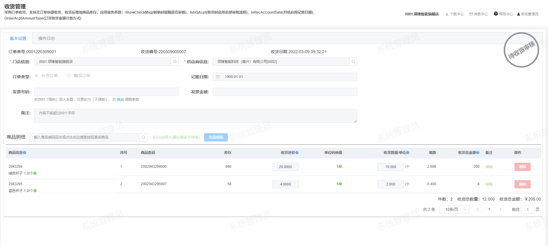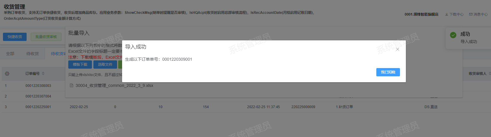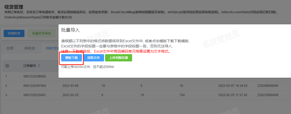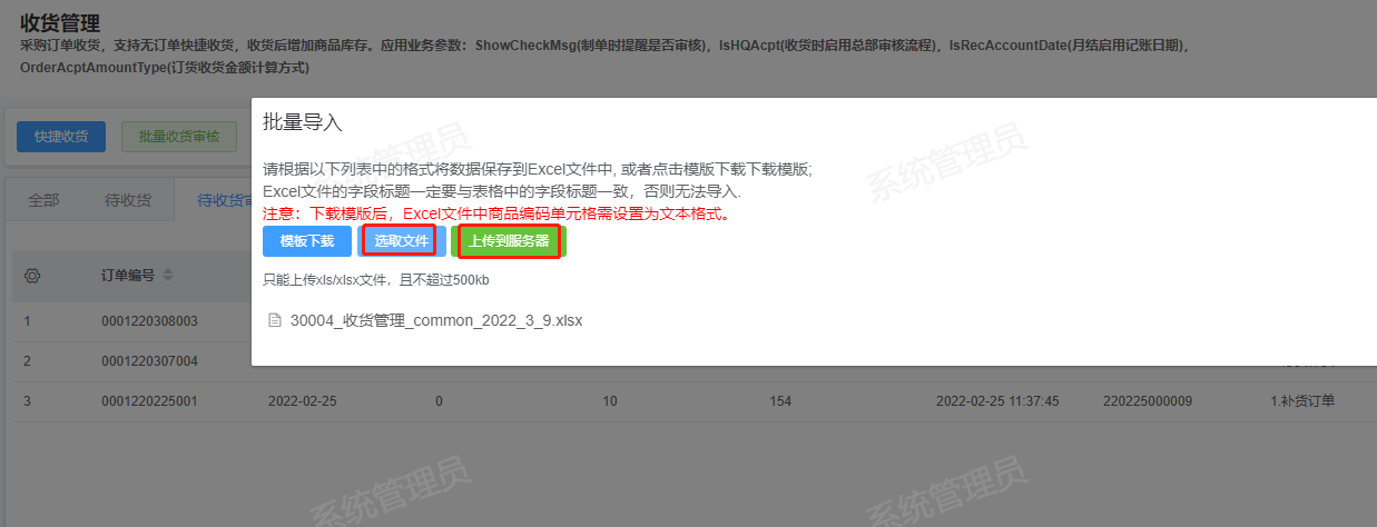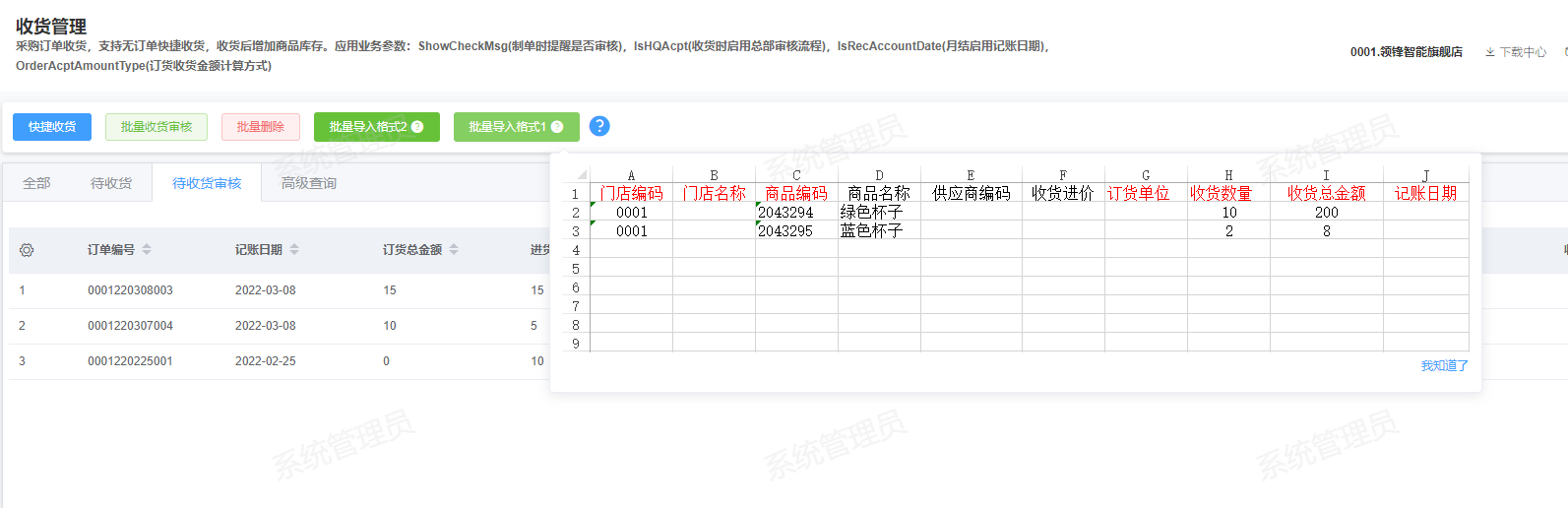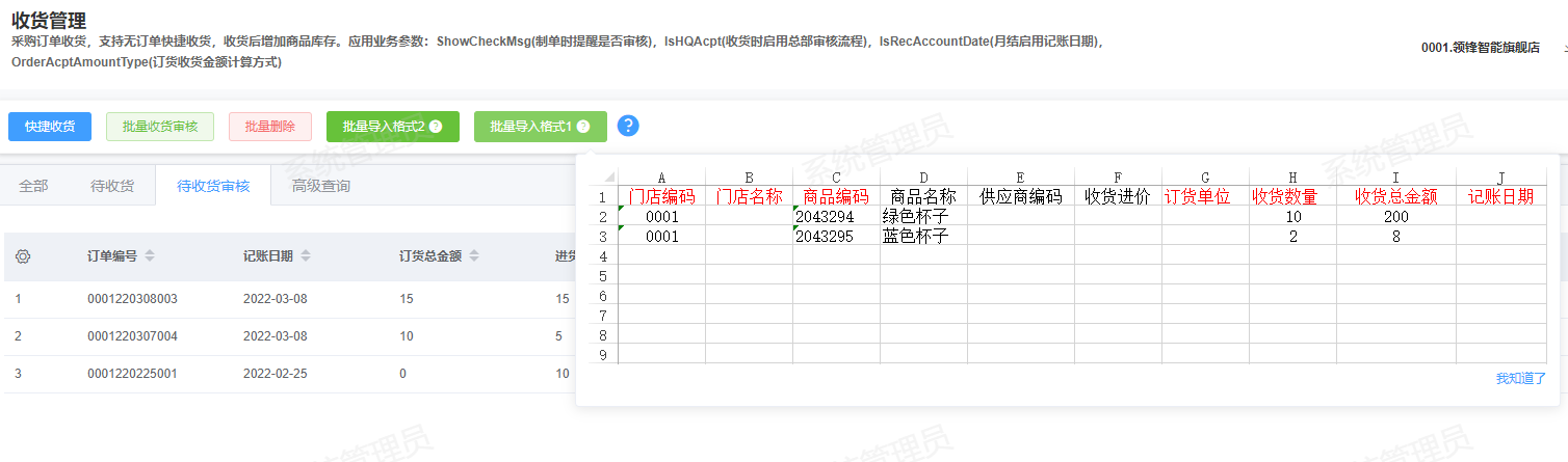 [收货](https://help.linkfern.com/project-11/doc-283/ "收货") / ## 案例说明 无订单快捷收货,收货后增加商品库存  ## 使用场景 ### 功能路径 灵风云新零售零售业务门店系统->采购->收货管理 ### 导入采购订单 1.下载文件,点击批量导入-模板下载,鼠标放在批量导入按钮会显示模板格式   2.填写模板,填写门店,商品编码、收货数量和总金额  3.点击选取文件,选择填写好的模板后上传到服务器   4.查看导入的收货单