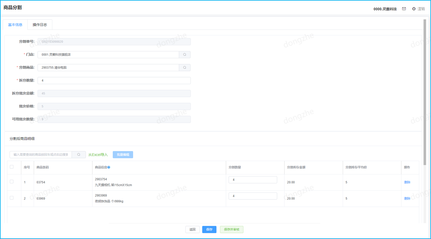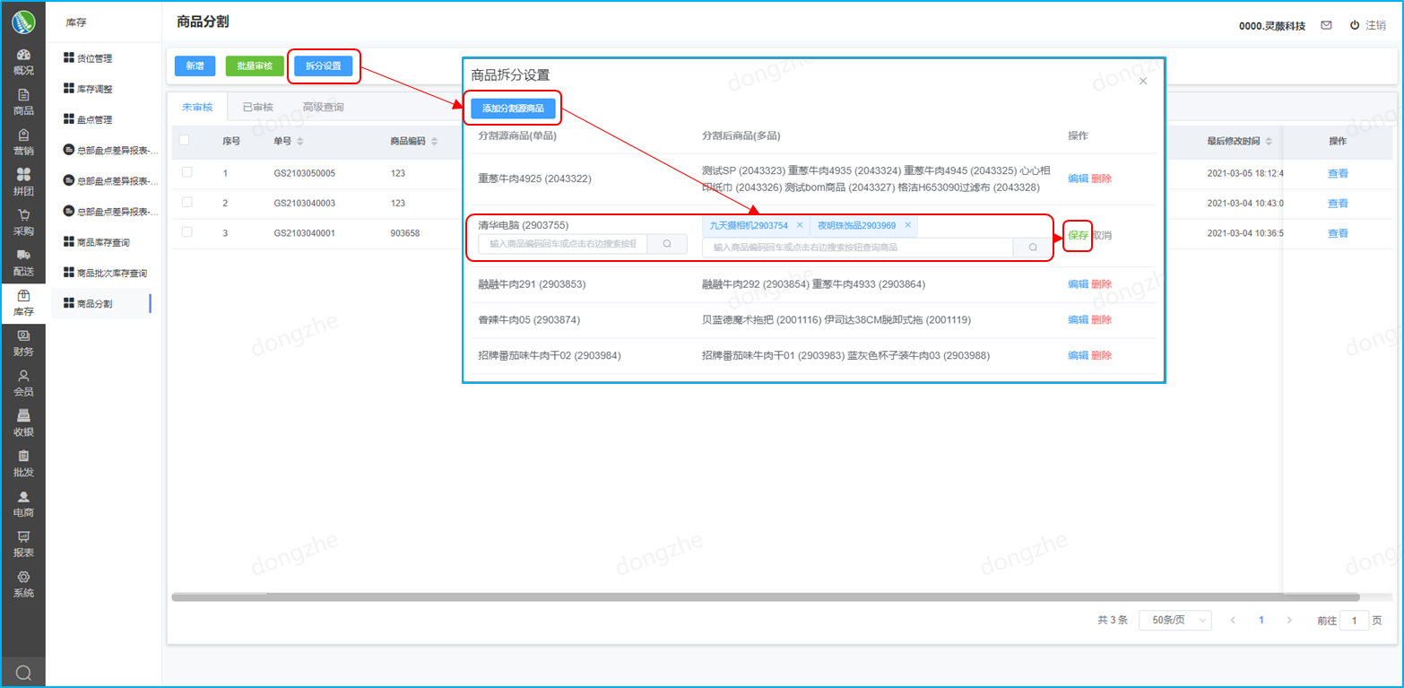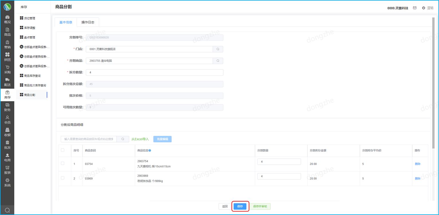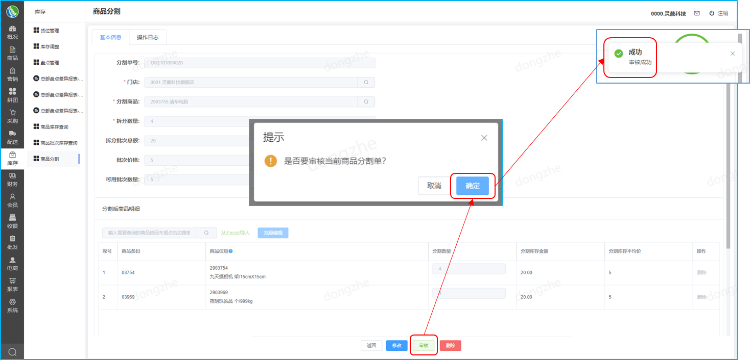 ## 商品分割-功能介绍 将一个商品的库存分割到多个指定商品,原商品库存扣减批次,指定商品按分割数量增加批次。  ### 功能路径 零售门店->库存->商品分割 ### 操作流程-进行商品分割拆分设置 1.点击拆分设置,弹出商品拆分设置弹窗。 2.点击添加分割源商品,选择分割源商品和分割后商品。 3.点击保存。  ### 操作流程-新增商品分割单 1.填写基本信息,选择分割后商品。 2.点击保存。  3.保存成功,点击审核。 4.弹出是否审核弹窗,点击确定。 5.审核成功。  ### 操作流程-查看商品库存是否正确 1. 库存->商品库存查询中通过查询条件查看已进行商品分割的商品库存。  ### 名词解释 门店:指要进行商品分割的商品所属门店。 分割商品:指要进行商品分割的原商品。 拆分数量:指进行商品分割的原商品将要扣减的库存数量。
