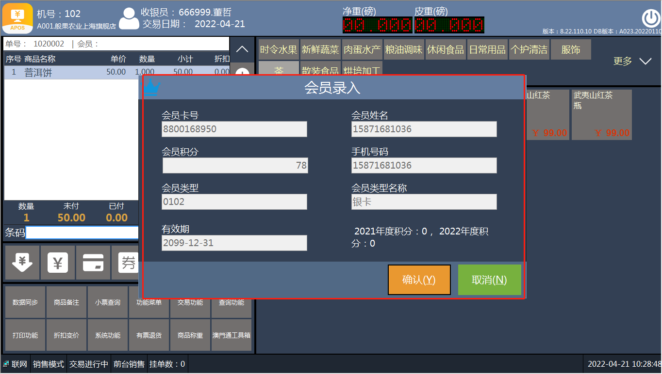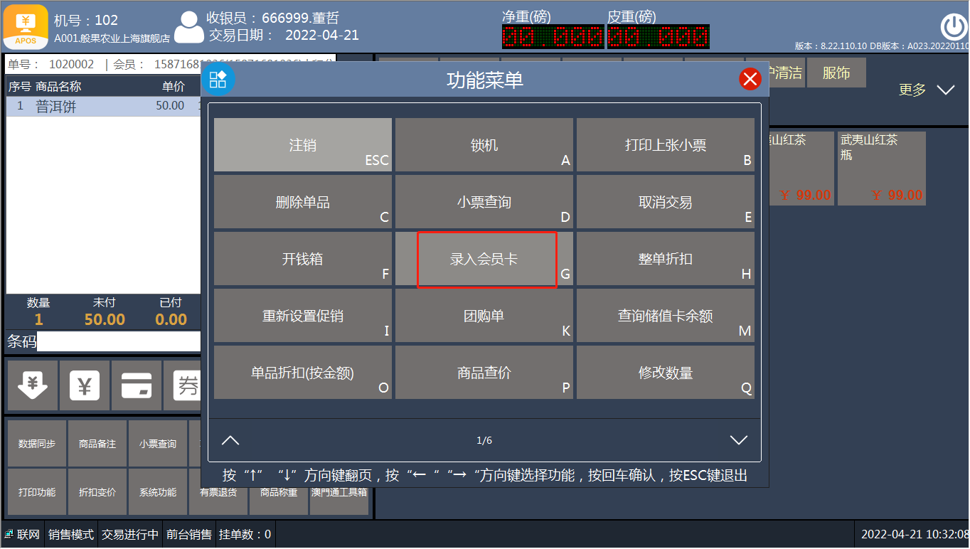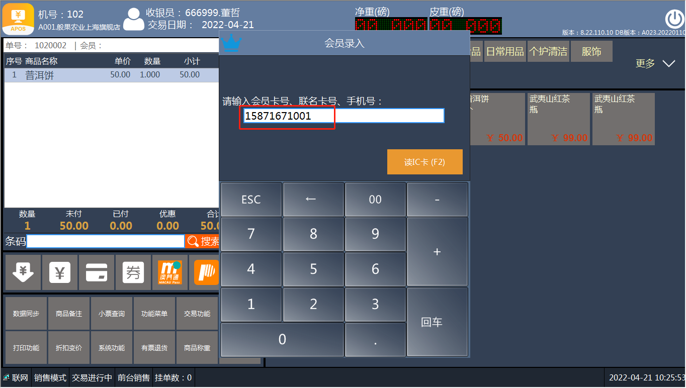 [交易处理](https://help.linkfern.com/project-11/doc-391/ "交易处理") / ## 案例说明 录入顾客的会员信息,购物享受积分、折扣等优惠  ## 使用场景 ### 录入会员 1.方法一:录入第一个商品系统自动弹窗录入会员,没有会员点击【ESC】关闭窗口  2.方法二:点击【功能菜单】-选择录入会员卡   3.会员录入框,输入【会员卡号、手机号】-回车   4.确认会员信息,点【确认】录入成功