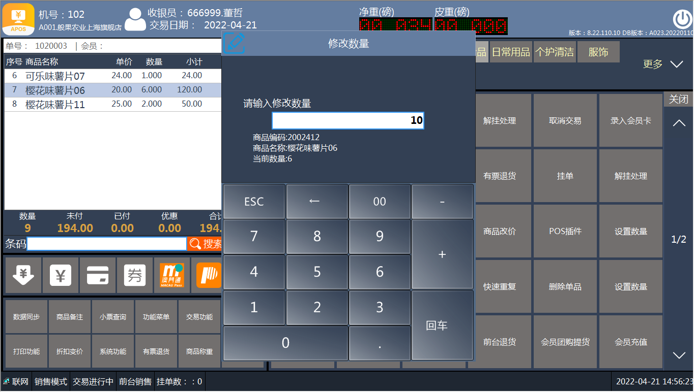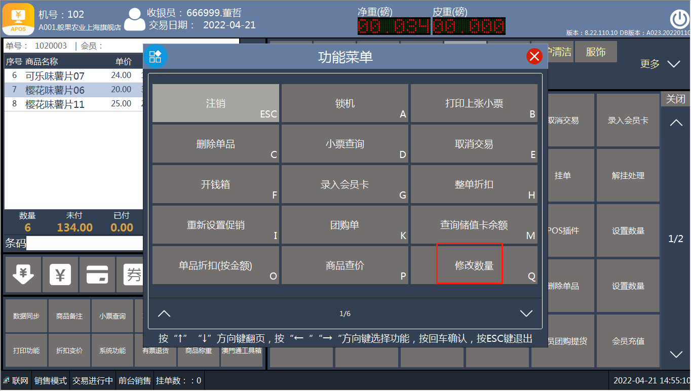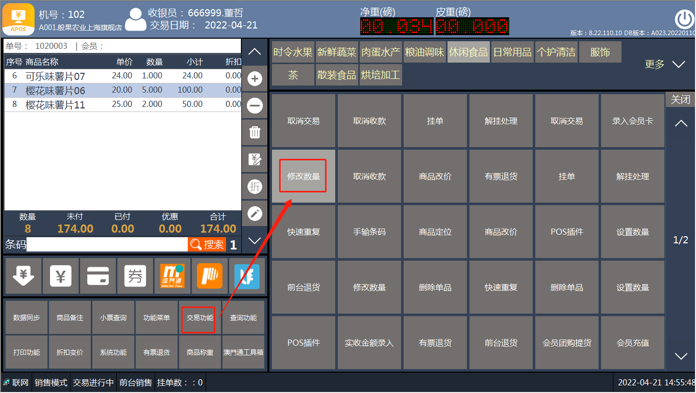 [交易处理](https://help.linkfern.com/project-11/doc-391/ "交易处理") / ## 案例说明 购买列表中,商品数量需要修改时,使用此功能 ## 使用场景 ### 修改数量 1.顾客购买商品,收银员添加商品到购买列表  2.增加商品数量,选中商品点‘+’  3.减少商品数量,选中商品点‘-’  4.直接修改商品数量 方法一:选中商品,点【功能菜单】-【修改数量】,输入正确数量    方法二:选中商品,点【交易功能】-【修改数量】,输入正确数量