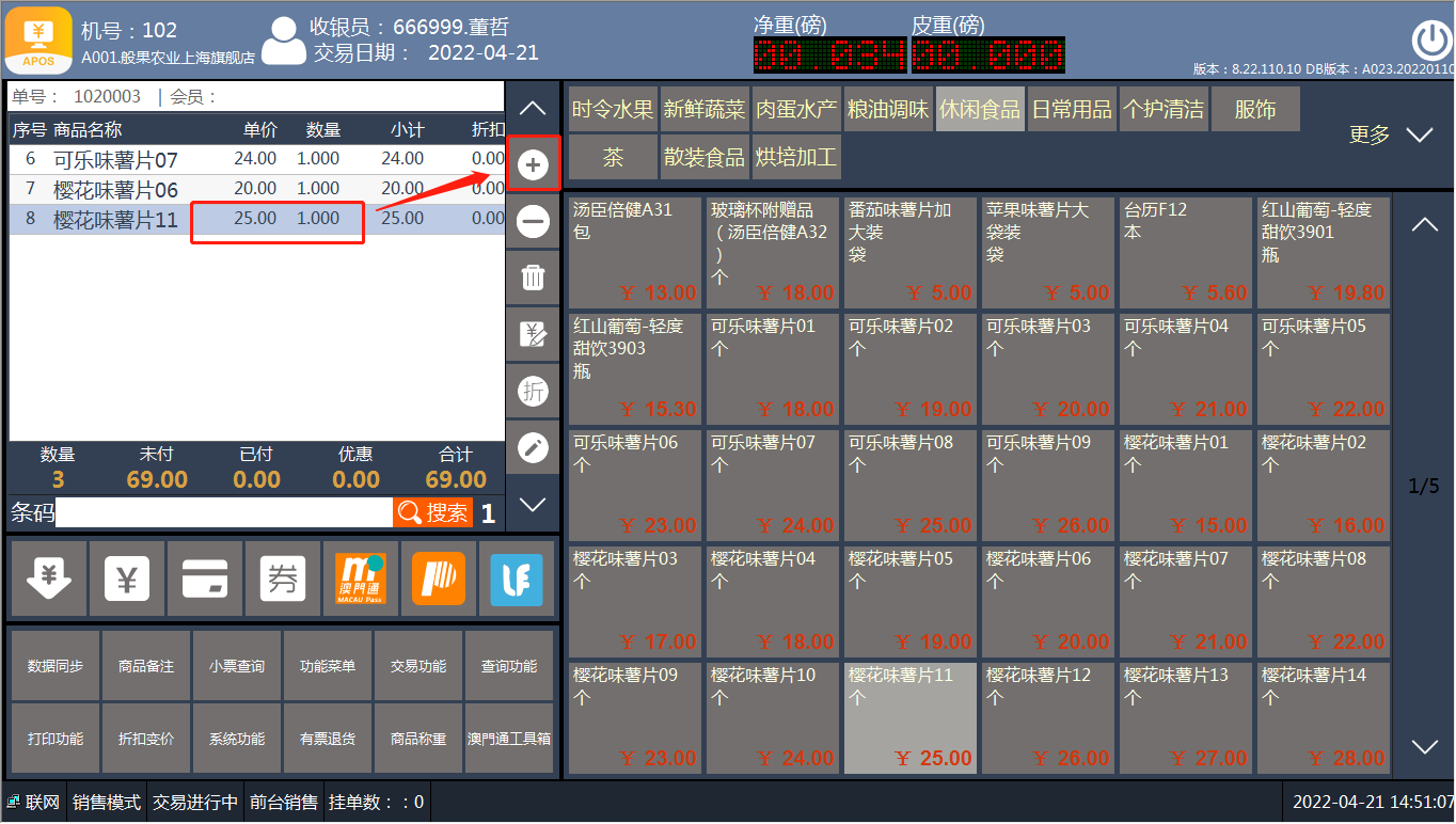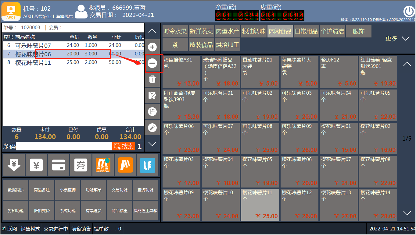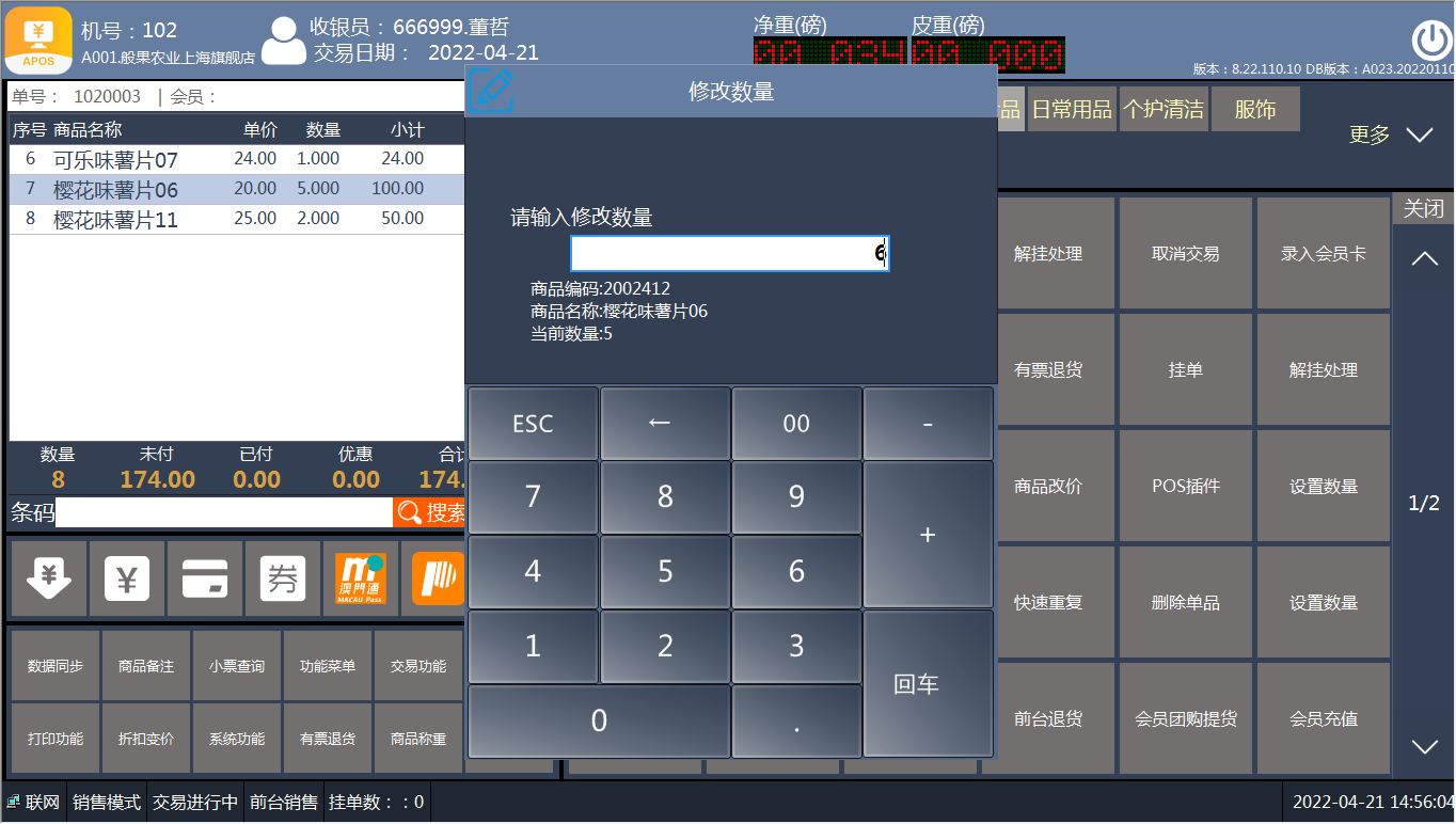 [交易处理](https://help.linkfern.com/project-11/doc-391/ "交易处理") / ## 案例说明 购买列表中,商品数量需要修改时,使用此功能 ## 使用场景 ### 修改数量 1.顾客购买商品,收银员添加商品到购买列表  2.增加商品数量,选中商品点‘+’  3.减少商品数量,选中商品点‘-’  4.直接修改商品数量 方法一:选中商品,点【功能菜单】-【修改数量】,输入正确数量    方法二:选中商品,点【交易功能】-【修改数量】,输入正确数量