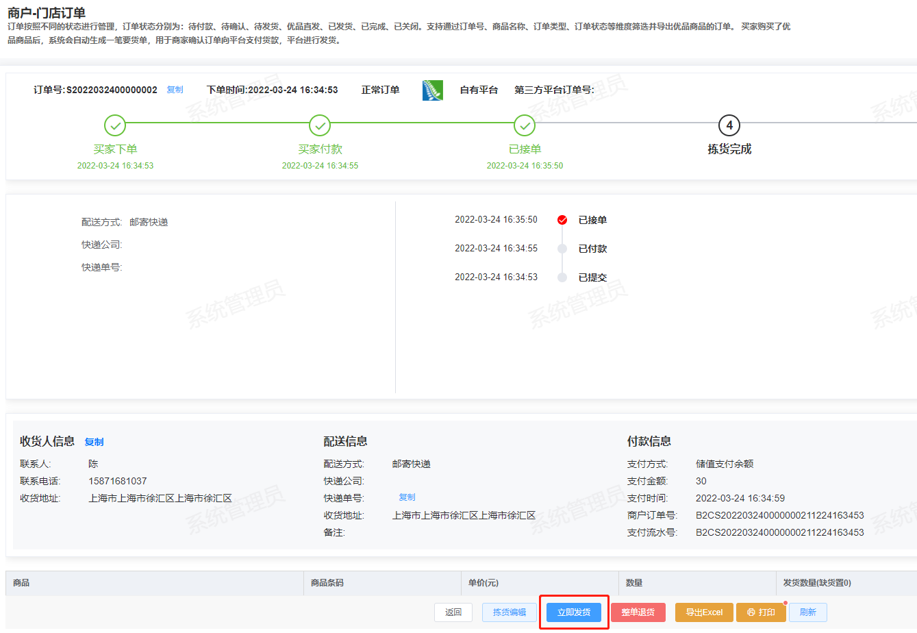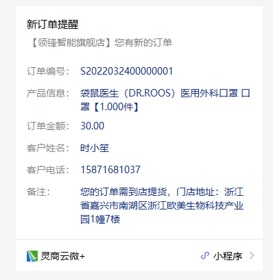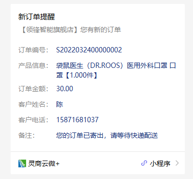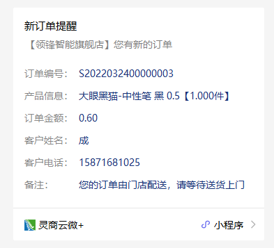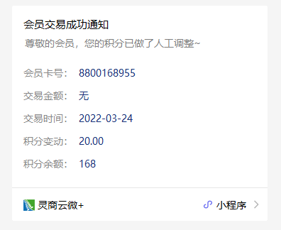 ## 发货通知:新订单提醒-邮寄快递 ### 使用场景 商城下快递配送订单,后台发货后,系统推送会员订单的新订单提醒消息。 #### 操作平台 下单:小程序商城 发货:后台-电商-商户-门店订单   ### 消息示例  ## 发货通知:新订单提醒-送货上门 ### 使用场景 商城下单,系统推送会员订单的新订单提醒消息。  ### 消息示例  ## 发货通知:新订单提醒-门店自提 ### 使用场景 当您在商城下单并付款后,系统自动确认发货(非拣货模式),自动推送会员订单的新订单提醒消息。 #### 操作平台 下单:小程序商城  ### 消息示例  ##### 拓展阅读 ## 交易及积分通知:会员交易成功通知-积分账户变动 ### 使用场景 后台按会员调整积分,并确认审核后,系统将推送积分更新的会员交易成功通知消息。 #### 操作平台 更新积分:后台-会员-积分帐户调整  ### 消息示例  #### 拓展阅读