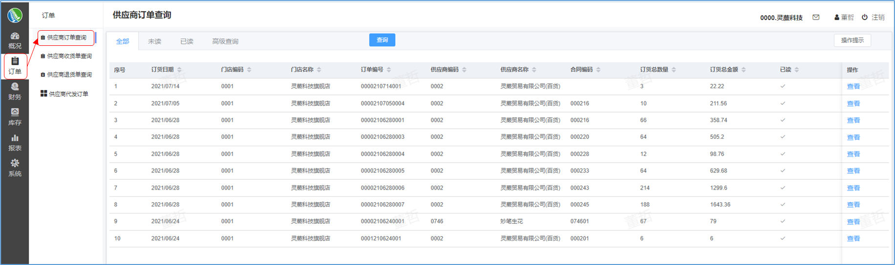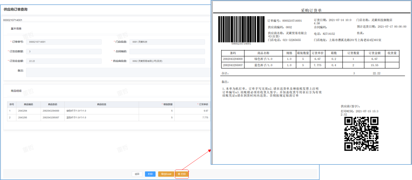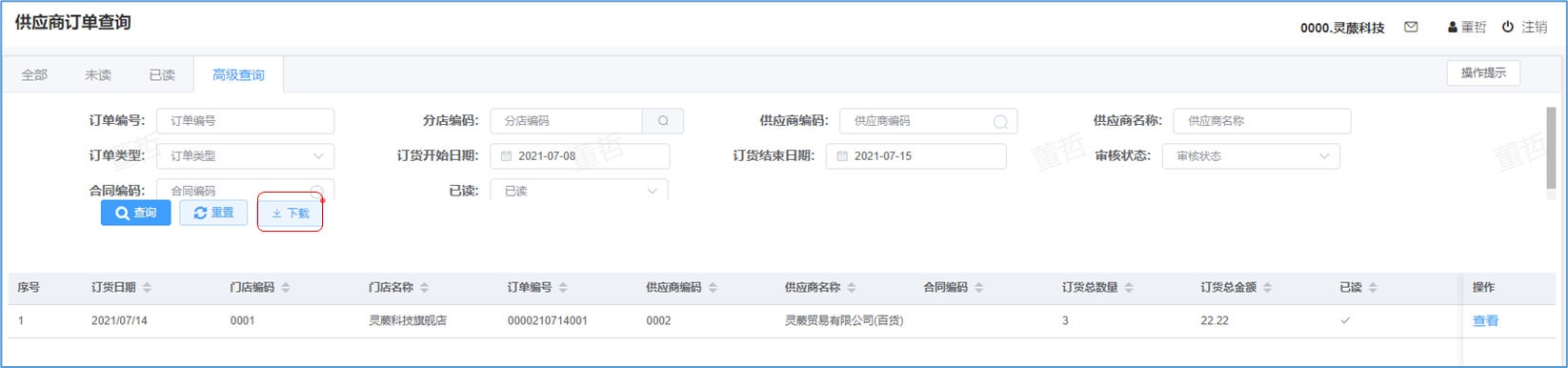### 功能介绍 供应商根据条件查询、打印、导出、下载门店订单信息  ### 功能路径 供应链管理系统->订单->供应商订单查询  ### 操作流程 #### 查询单据 1.首页默认查询30天内的单据信息  2.点击高级查询页签,高级查询页可直接输入订单编号条件查询对应单据信息 3.分店编码:输入门店编码可按照门店查询单据信息,或点击放大镜查询门店并选择 4.也可根据供应商编码、名称、订单类型、审核状态、合同编码、是否已读查询订单信息  #### 下载 1.高级查询页查询出订单信息后,点击【下载】,可一键下载当前查询出的所有订单信息  #### 打印 1.查询出订单后,点击【查看】,进入订单详情页,点击【打印】,打印订单  #### 导出Excel 1.在首页查询单据后,点击【查看】,进入单据详情页,点击【导出Excel】,导出单据信息