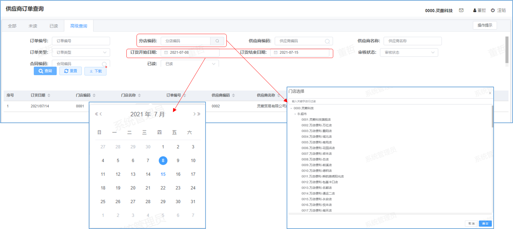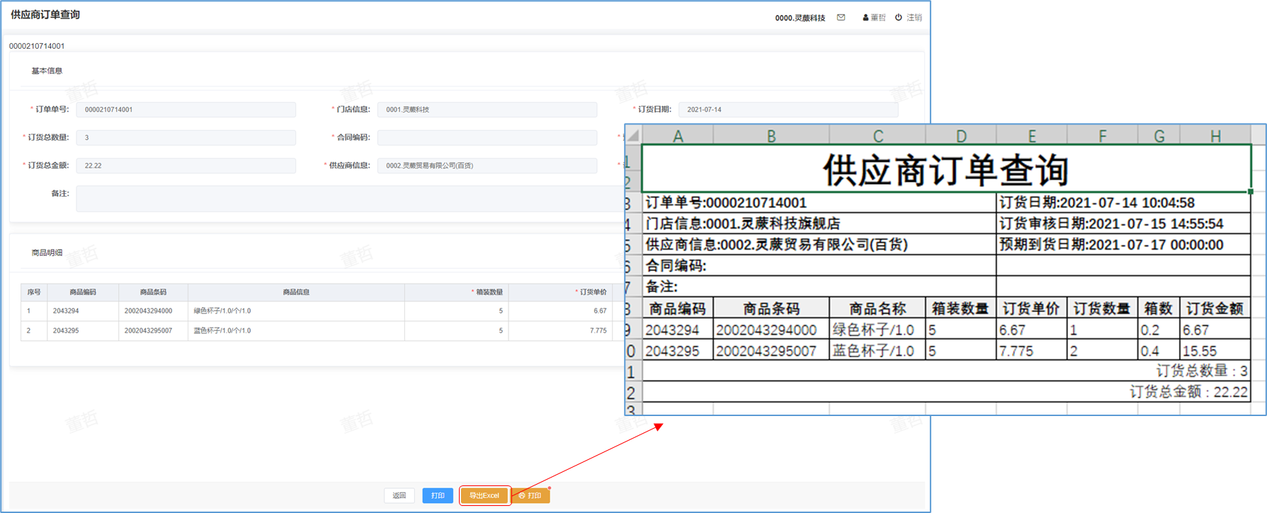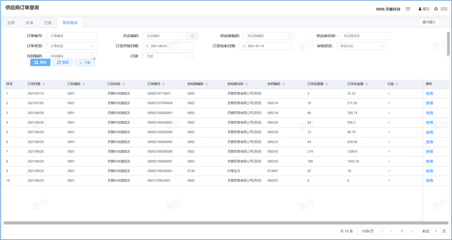 ### 功能介绍 供应商根据条件查询、打印、导出、下载门店订单信息  ### 功能路径 供应链管理系统->订单->供应商订单查询  ### 操作流程 #### 查询单据 1.首页默认查询30天内的单据信息  2.点击高级查询页签,高级查询页可直接输入订单编号条件查询对应单据信息 3.分店编码:输入门店编码可按照门店查询单据信息,或点击放大镜查询门店并选择 4.也可根据供应商编码、名称、订单类型、审核状态、合同编码、是否已读查询订单信息  #### 下载 1.高级查询页查询出订单信息后,点击【下载】,可一键下载当前查询出的所有订单信息  #### 打印 1.查询出订单后,点击【查看】,进入订单详情页,点击【打印】,打印订单  #### 导出Excel 1.在首页查询单据后,点击【查看】,进入单据详情页,点击【导出Excel】,导出单据信息