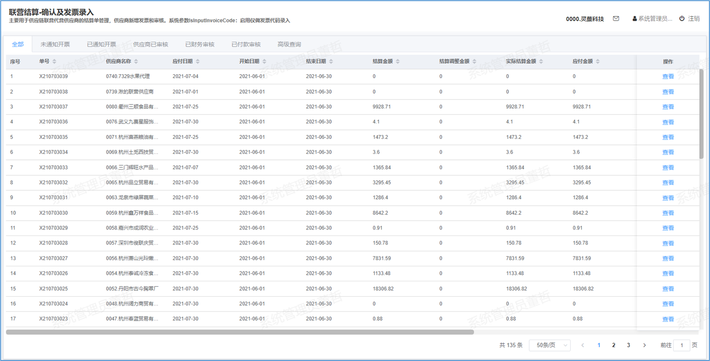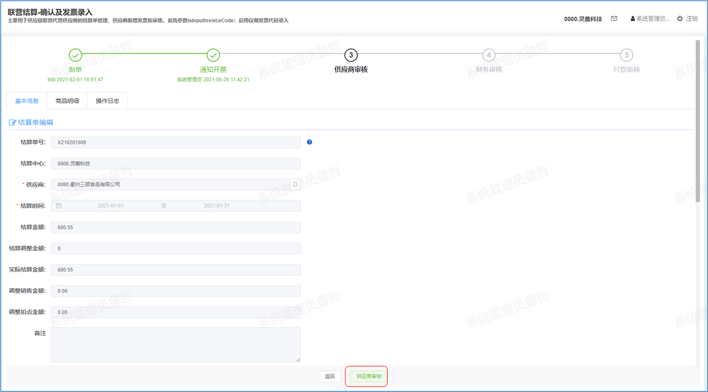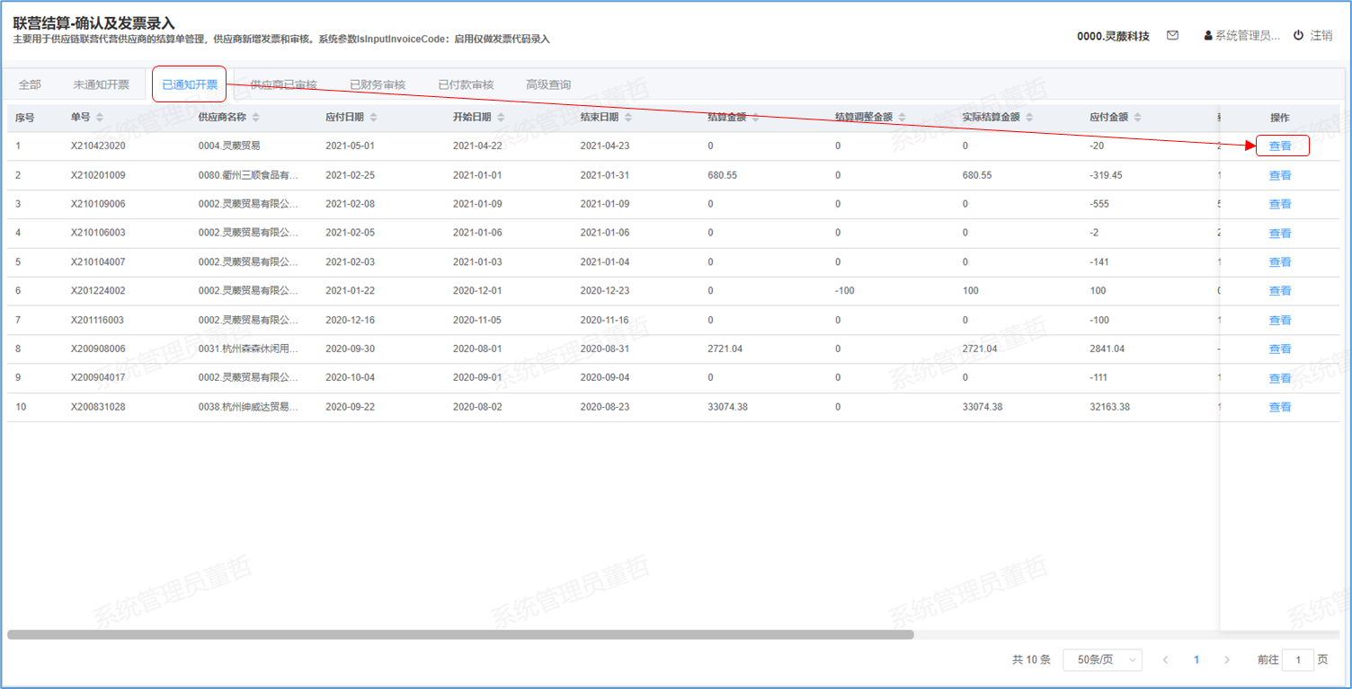 ### 功能介绍 主要用于供应链联营代营供应商的结算单管理,供应商新增发票和审核。系统参数IsInputInvoiceCode:启用仅做发票代码录入  ### 功能路径 供应链管理系统->财务->联营结算-确认及发票录入  ### 操作流程 1.进入首页点击已通知开票页签 2.选择需要供应商确认及发票录入的结算单,点击查看按钮  3.进入结算单详情页,若需要录入发票则点击新增发票单按钮录入发票  4. 结算单详情页中点击供应商审核按钮,确认完成供应商审核  5. 若误操作完成了供应商审核,可继续点击供应商反审核按钮,取消供应商审核