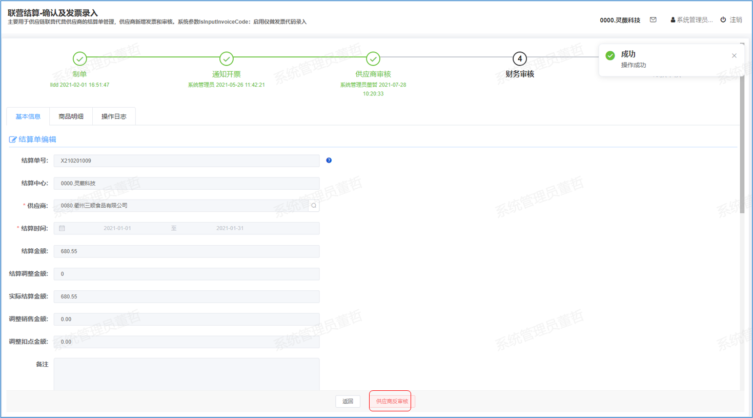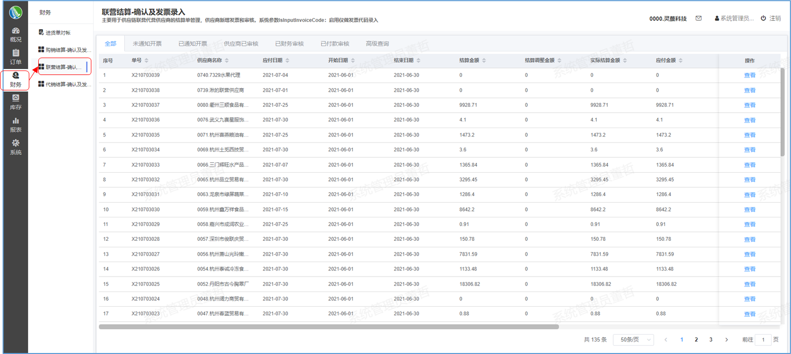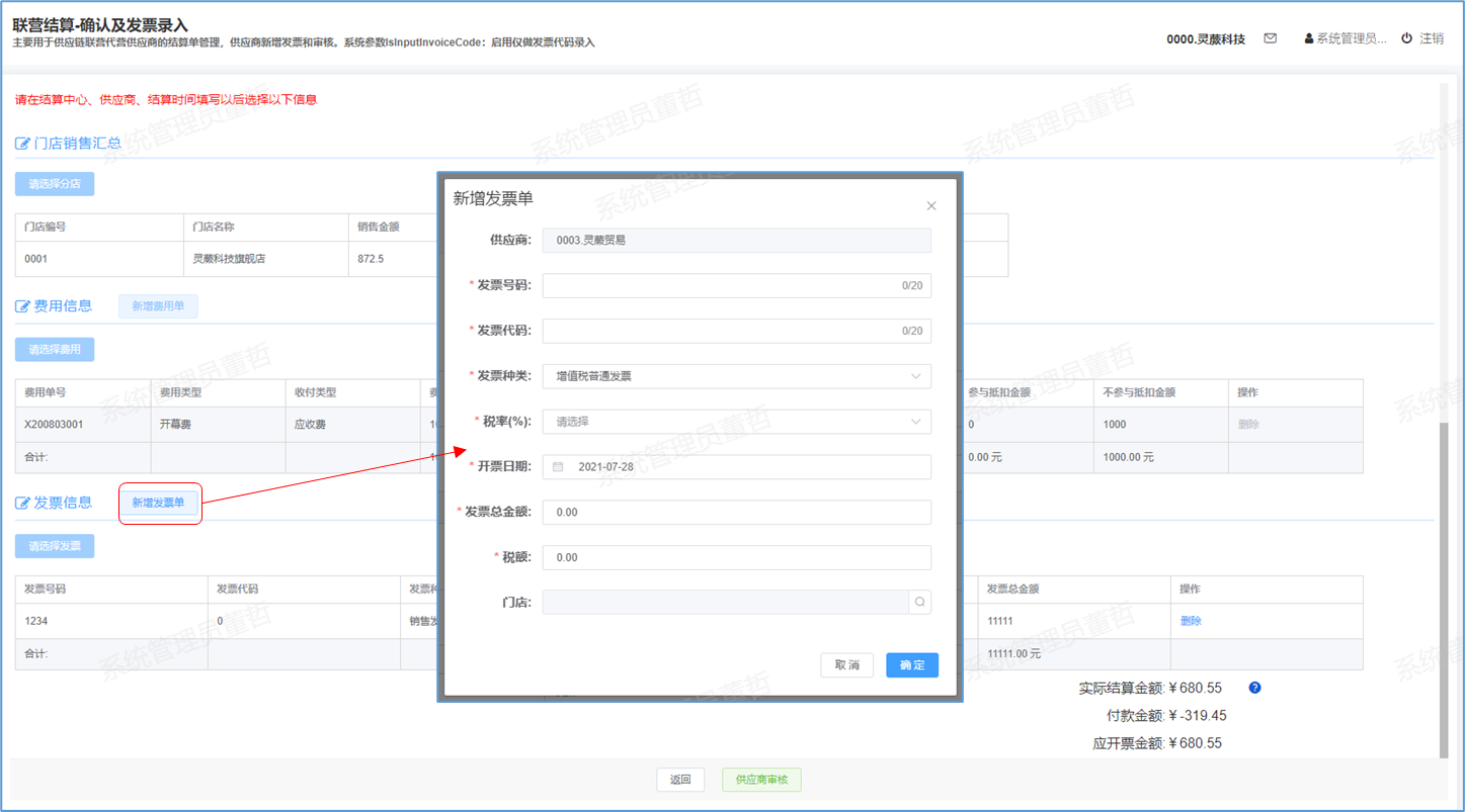 ### 功能介绍 主要用于供应链联营代营供应商的结算单管理,供应商新增发票和审核。系统参数IsInputInvoiceCode:启用仅做发票代码录入  ### 功能路径 供应链管理系统->财务->联营结算-确认及发票录入  ### 操作流程 1.进入首页点击已通知开票页签 2.选择需要供应商确认及发票录入的结算单,点击查看按钮  3.进入结算单详情页,若需要录入发票则点击新增发票单按钮录入发票  4. 结算单详情页中点击供应商审核按钮,确认完成供应商审核  5. 若误操作完成了供应商审核,可继续点击供应商反审核按钮,取消供应商审核