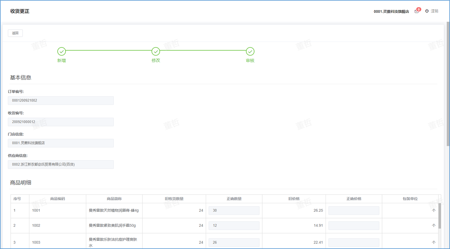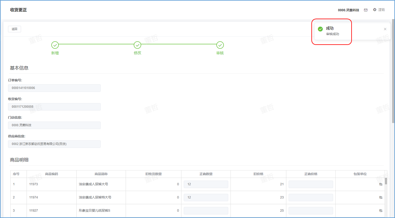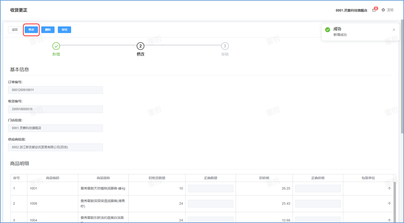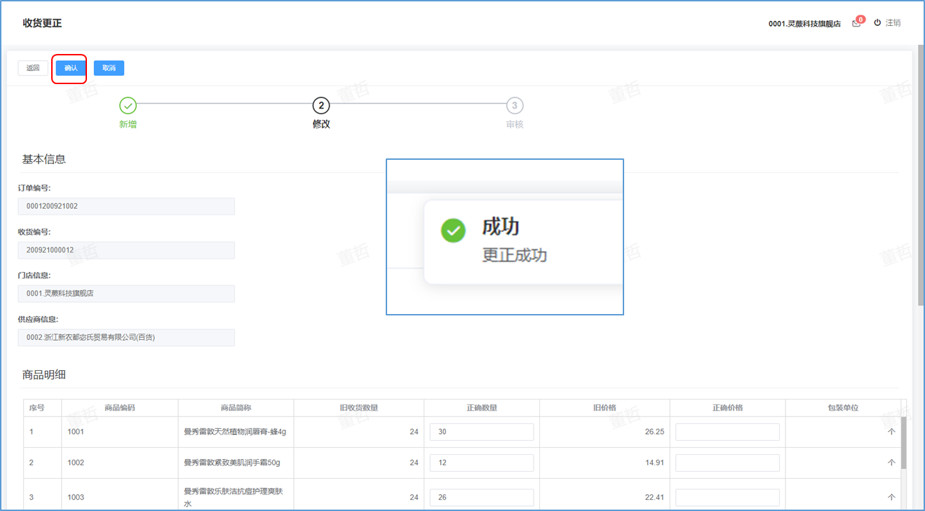 ## 收货更正-功能介绍 收货更正就是对已经收货的商品进行再次整理更正数据。  ### 功能路径 零售门店->采购->收货更正 ### 操作流程-新增收货更正 1. 点击【新增】按钮进入新增收货更正页。  1. 输入好收货更正信息后点击【下一步】按钮。  1. 新增成功后点击【修改】更正收货明细 。  1. 更正收货明细后点击【确认】按钮 。 2. 成功后提示更正成功。  1. 更正后点击【审核】按钮。 2. 弹出确认窗口,点击【确定】。  1. 成功后提示审核成功。