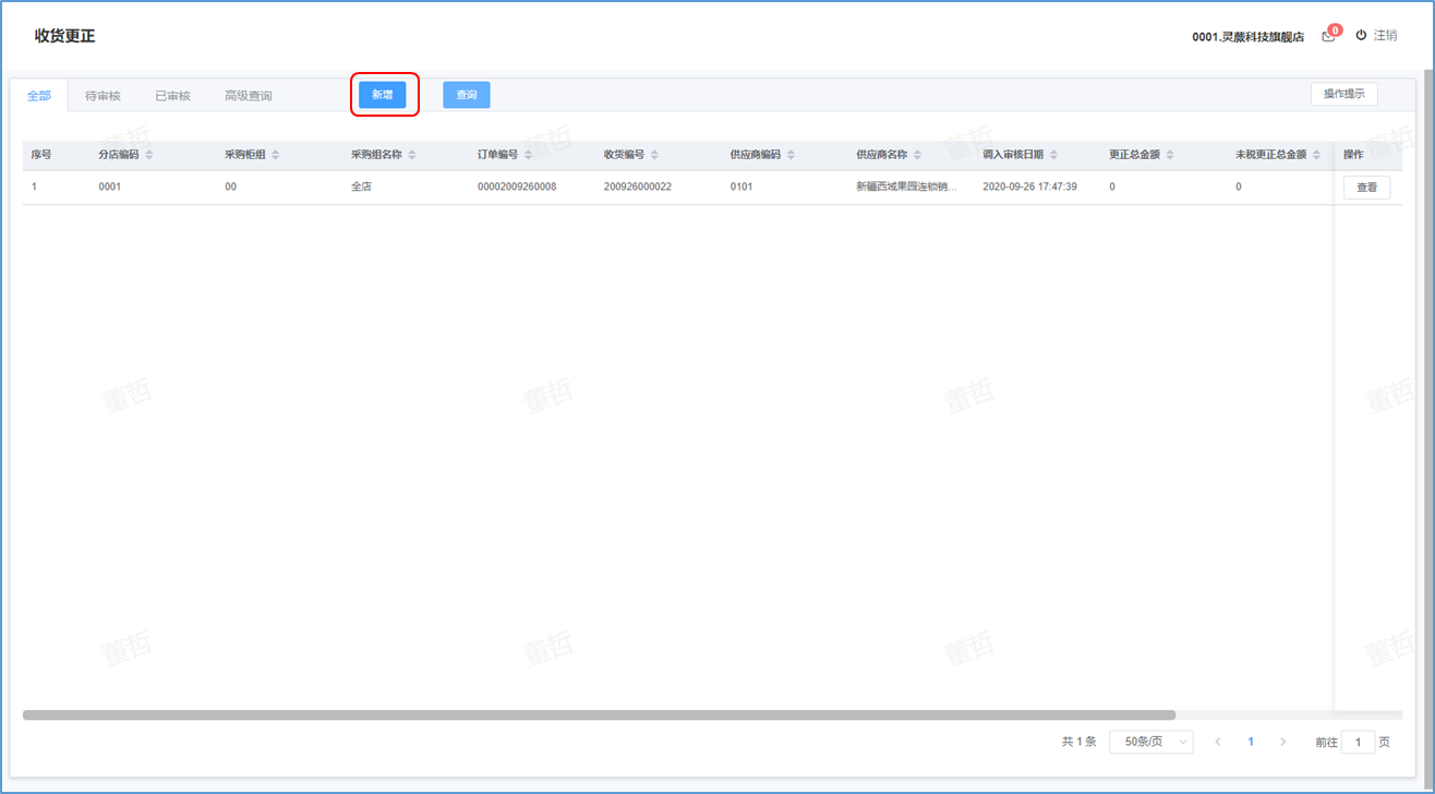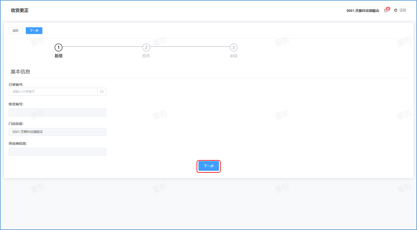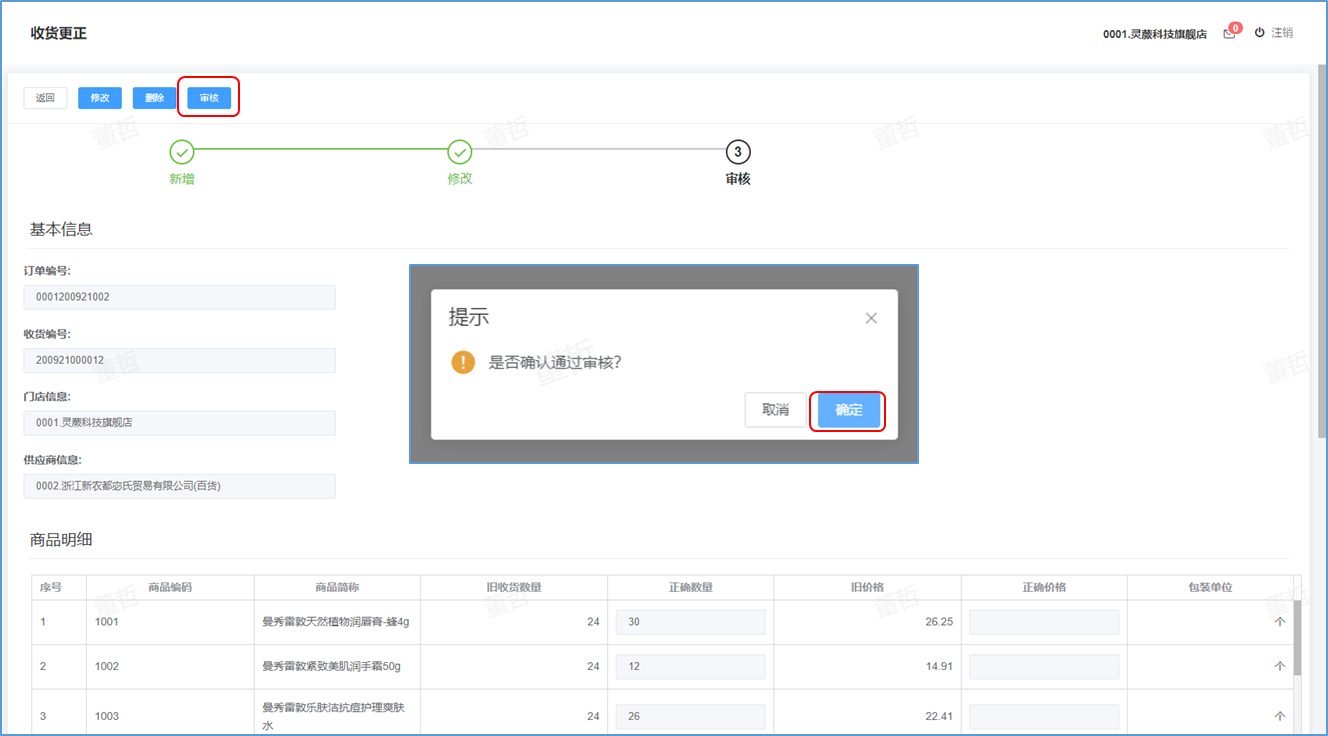 ## 收货更正-功能介绍 收货更正就是对已经收货的商品进行再次整理更正数据。  ### 功能路径 零售门店->采购->收货更正 ### 操作流程-新增收货更正 1. 点击【新增】按钮进入新增收货更正页。  1. 输入好收货更正信息后点击【下一步】按钮。  1. 新增成功后点击【修改】更正收货明细 。  1. 更正收货明细后点击【确认】按钮 。 2. 成功后提示更正成功。  1. 更正后点击【审核】按钮。 2. 弹出确认窗口,点击【确定】。  1. 成功后提示审核成功。