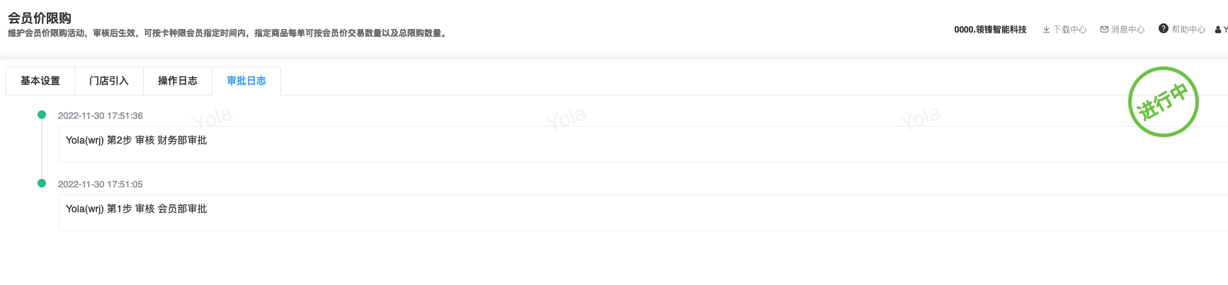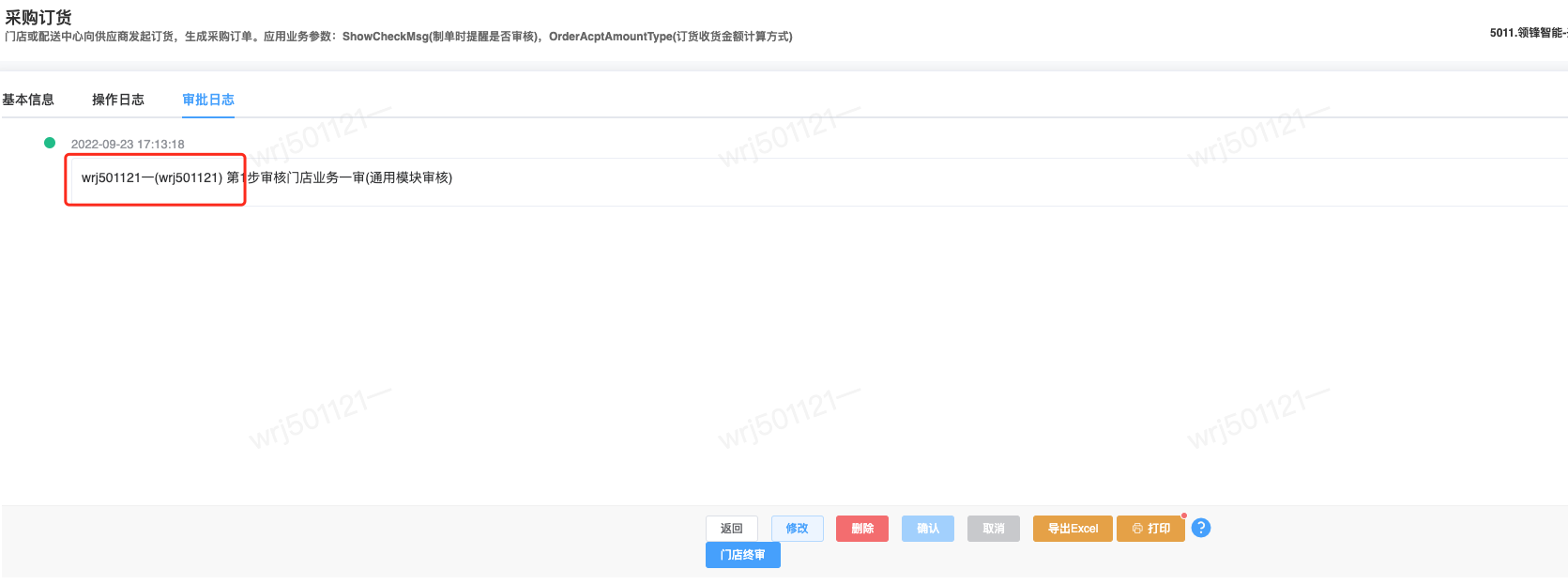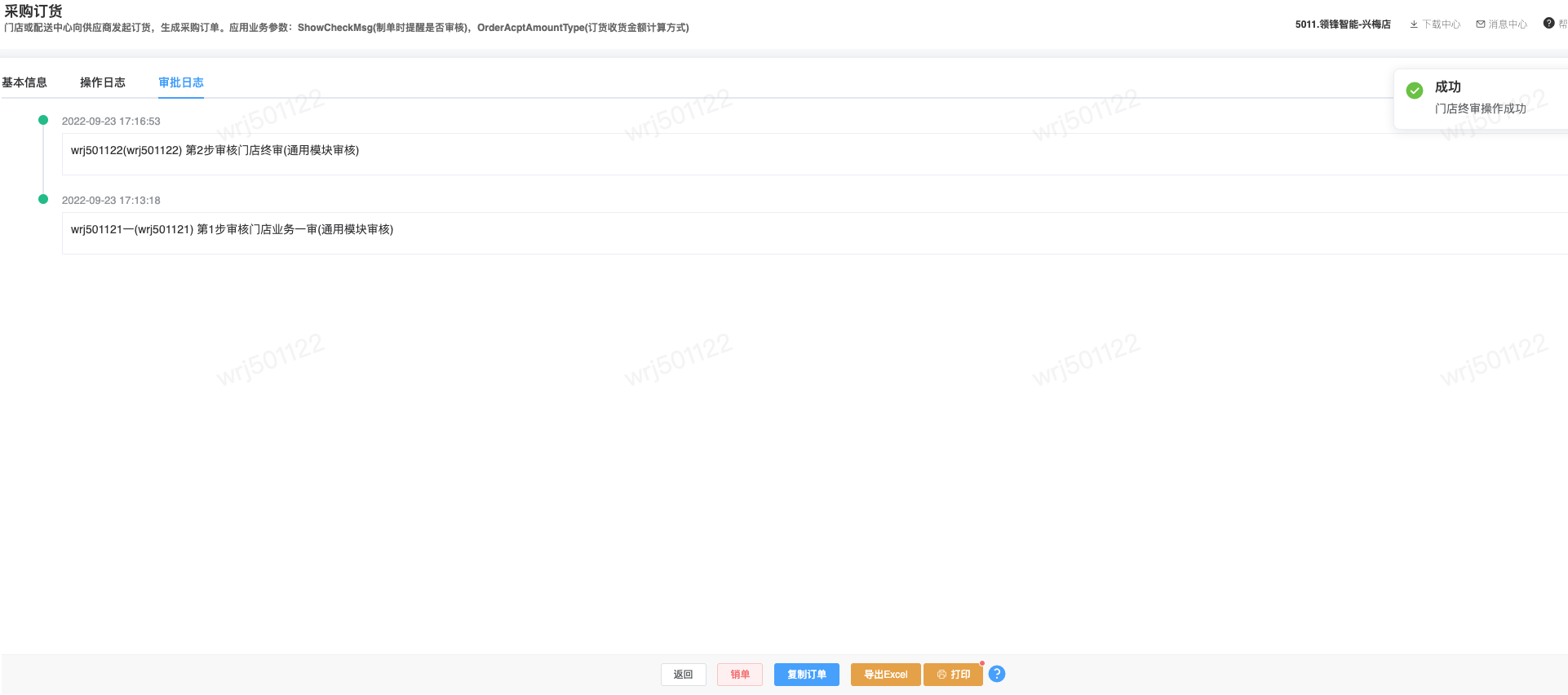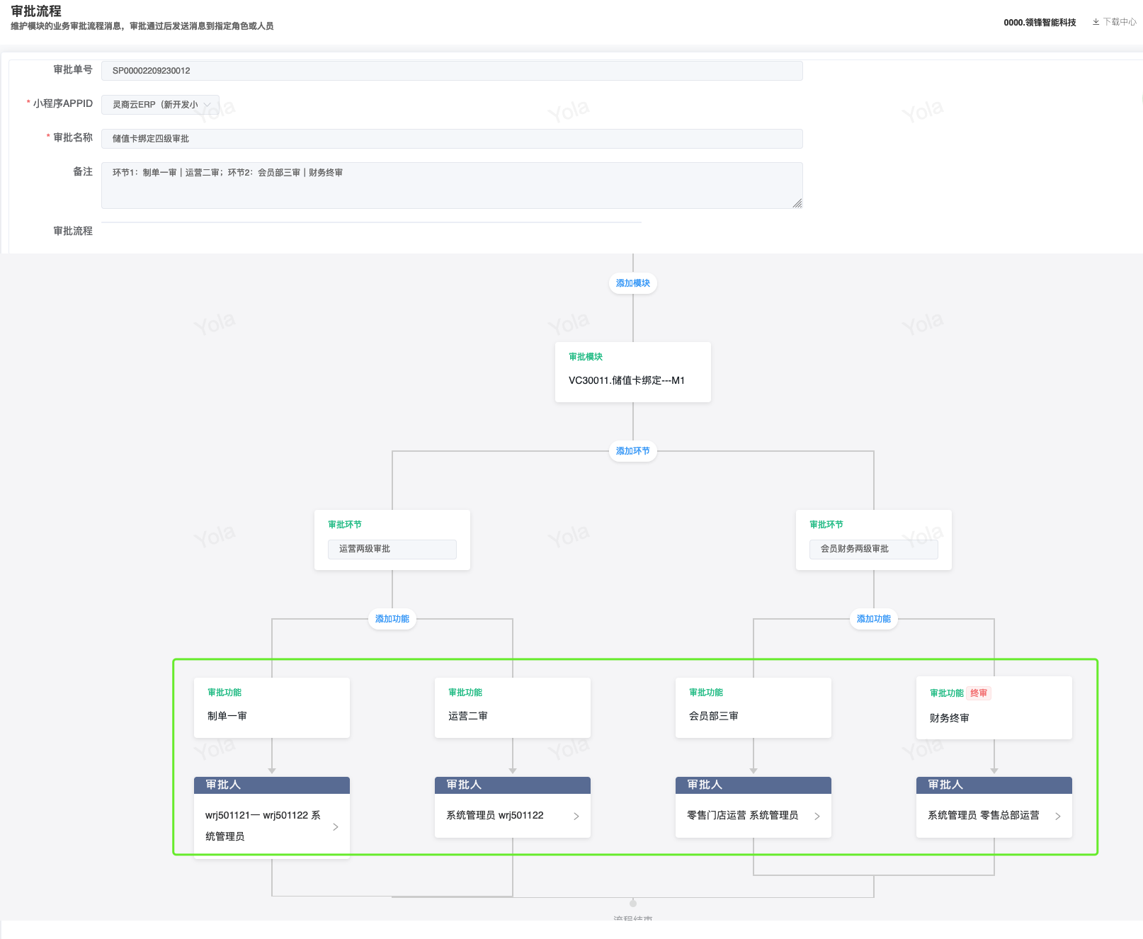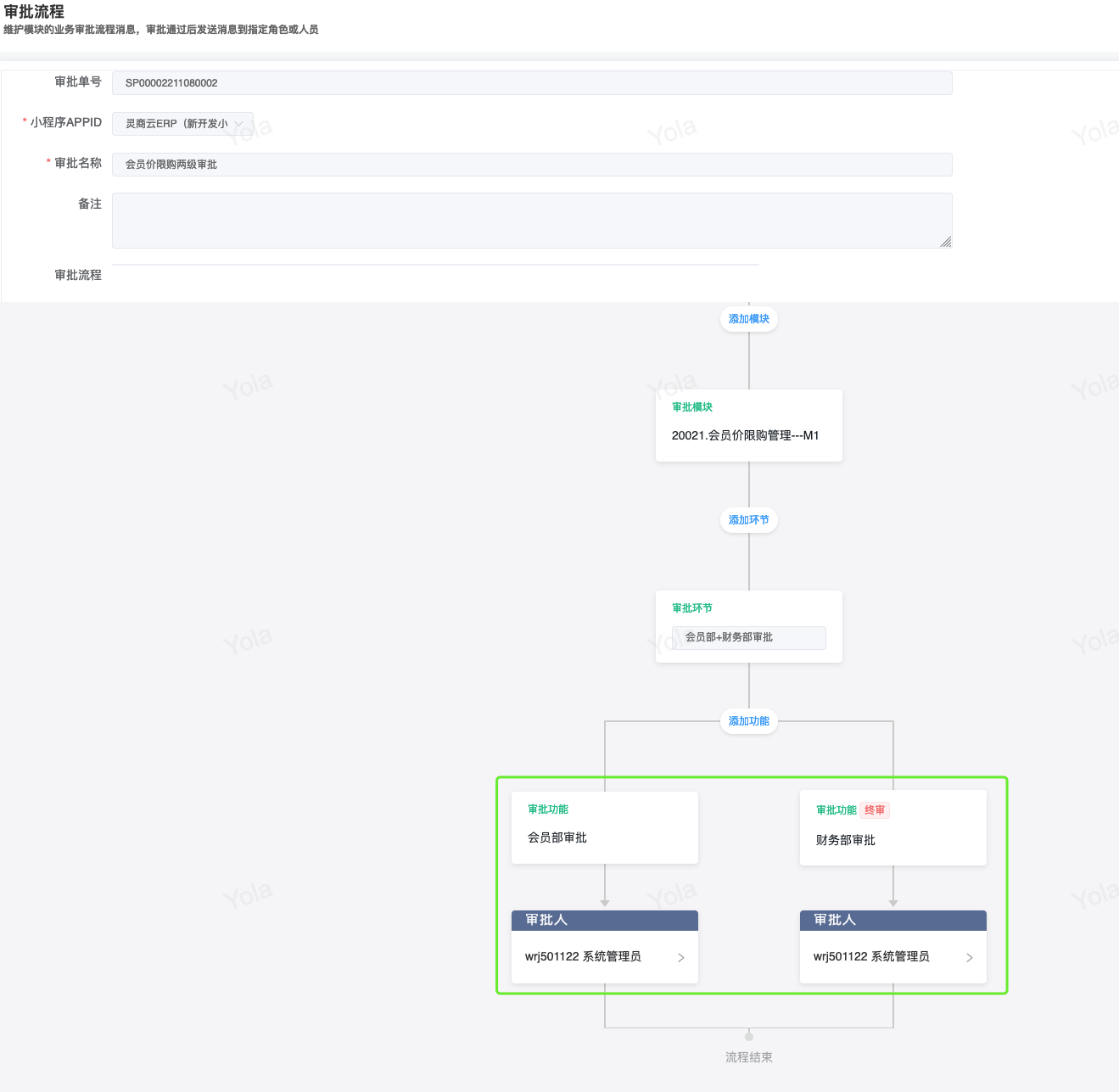 ## 已对接审批流程步骤审批模块 - 采购/采购订单 - 会员/储值/储值卡绑定 - 会员/营销/会员价限购 - 库存/库存调整 ## 采购两级审批|审批流程+公众号消息 <img src="https://help.linkfern.com/media/202209/审批流程-公众号消息_1663058806.png" width="600"> ### 详细操作步骤 #### 一、配置审批用户|用户管理 系统/用户管理:配置可登录管家的门店账号,并且登录管家小程序,登录成功,用户详情「绑定状态」;如:wrj501122</p>   #### 二、确认消息模板|消息模板设置 会员/配置/消息模板设置:配置通用业务消息(B2CCommonMsg)的微信模板ID「FcotcjL0-wnH9XhcpxmHwe91HPOe_oZNnJxA-ZSl-a8」 </p> #### 三、启用审批流程|审批流程 系统/人员配置/审批流程:新增并配置【采购/采购订单】模块审批流程,并启用;如终审审批人含账号;wrj501122</p> 1.点新增,选择管家小程序、填写审批名称; 2.点「审批模块」,选择需配置审批流程的模块,点确定 3.点「审批功能」,依次设置审批层级,如采购订单设定「门店业务一审」,点确定  4.点「审批人」,设置需操作当前审批功能的审批人,即「门店业务一审」的审批人,在采购订单【提交审批】后,通知该审批人;  5.点【添加功能】,重复步骤3、4,设置多级审批; 6.点【添加功能】,点「审批功能」,开启【当前环节是否终审】,选择【终审业务标识】,设置终审的【审核按钮名称】,点确定,点【审批人」设置终审审批人。 7.点【确定】保存审批流程,点【启用】,审批流程生效; #### 四、采购单提交审核查看消息|采购订单 【采购/采购订单】模块,验证新采购单,点【提交审核】即单据提交审批流程,如:终审前一步审核人审批后,即发送终审审批人的审批消息。</p> 注意:启用审批流程时,审批流程的审批人才拥有权限操作对应审核按钮。       <img src="https://help.linkfern.com/media/202209/2022-09-23_171905_7014350.8392670889000258.png" width="200"> ## 其他多级审批示例 ### 储值卡绑定四级审批|审批流程+公众号消息 【会员/储值/储值卡绑定】模块,验证新单据四级审核,点【提交审核】即单据提交审批流程。    <img src="https://help.linkfern.com/media/202211/2022-11-30_185113_0877400.9399162233297408.png" width="200"> ### 会员价限购两级审核|审批流程+公众号消息     <img src="https://help.linkfern.com/media/202211/2022-11-30_175813_3981210.43038538842730556.png" width="200"> ### 库存调整分别两级审核|审批流程+公众号消息      <img src="https://help.linkfern.com/media/202211/2022-11-30_175805_1064920.5685559001714108.png" width="200">