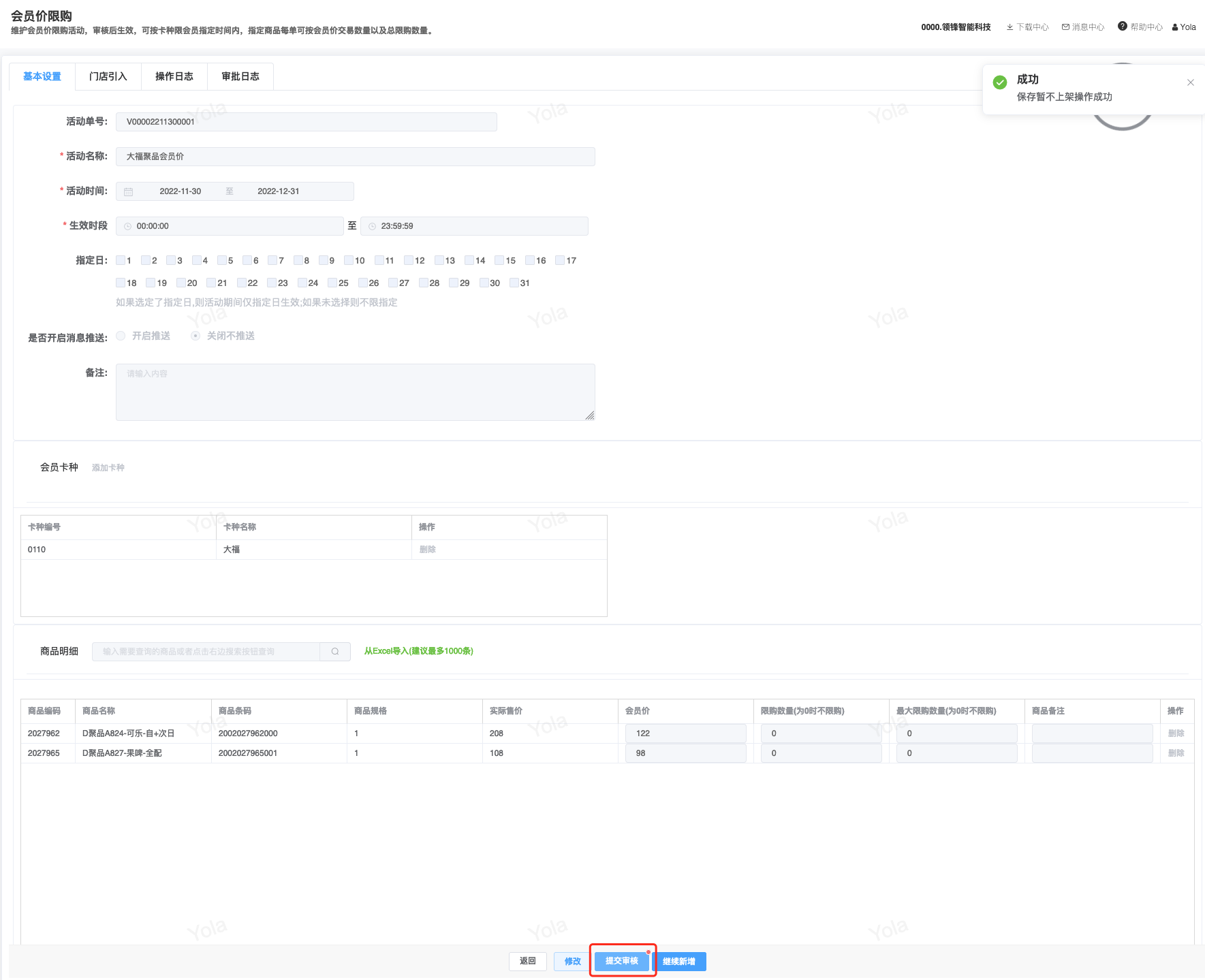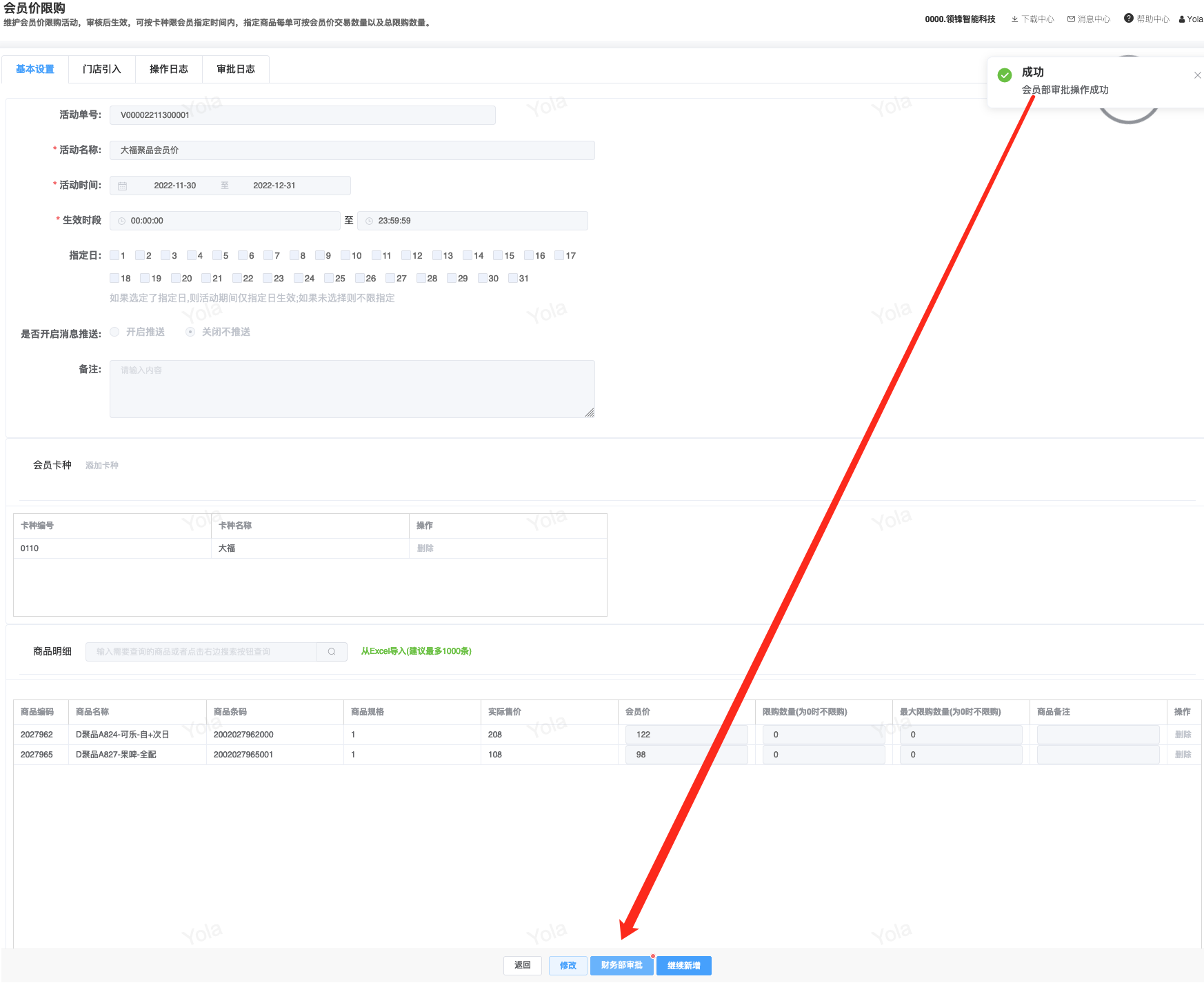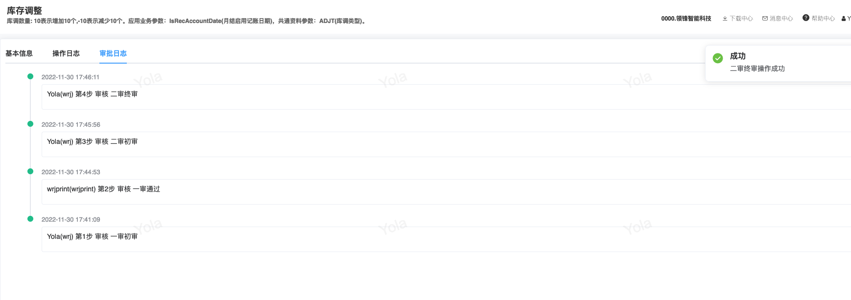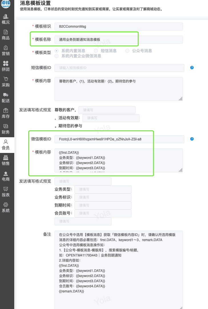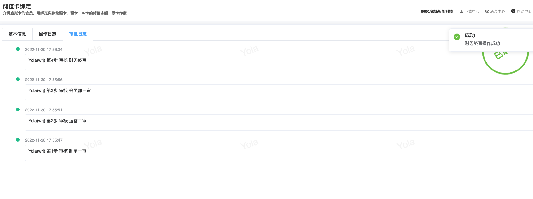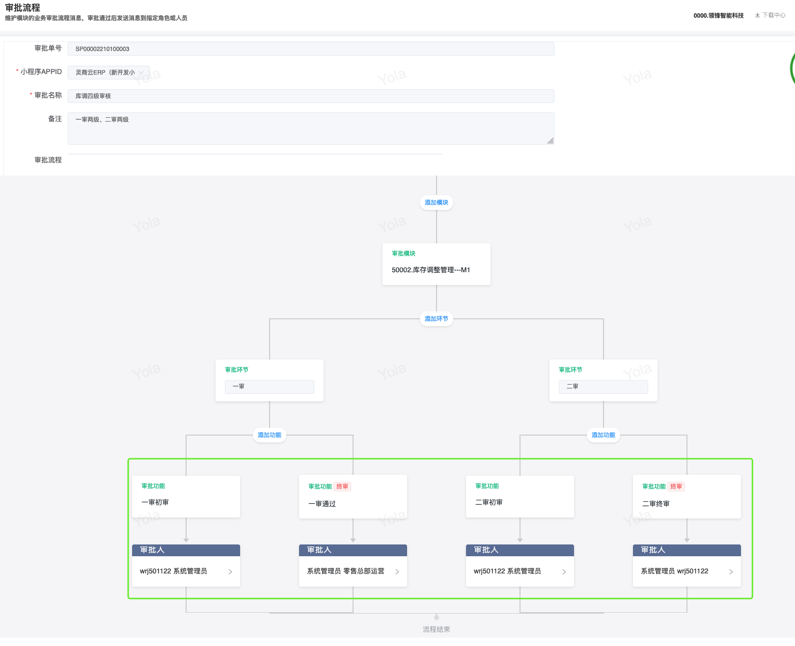 ## 已对接审批流程步骤审批模块 - 采购/采购订单 - 会员/储值/储值卡绑定 - 会员/营销/会员价限购 - 库存/库存调整 ## 采购两级审批|审批流程+公众号消息 <img src="https://help.linkfern.com/media/202209/审批流程-公众号消息_1663058806.png" width="600"> ### 详细操作步骤 #### 一、配置审批用户|用户管理 系统/用户管理:配置可登录管家的门店账号,并且登录管家小程序,登录成功,用户详情「绑定状态」;如:wrj501122</p>   #### 二、确认消息模板|消息模板设置 会员/配置/消息模板设置:配置通用业务消息(B2CCommonMsg)的微信模板ID「FcotcjL0-wnH9XhcpxmHwe91HPOe_oZNnJxA-ZSl-a8」 </p> #### 三、启用审批流程|审批流程 系统/人员配置/审批流程:新增并配置【采购/采购订单】模块审批流程,并启用;如终审审批人含账号;wrj501122</p> 1.点新增,选择管家小程序、填写审批名称; 2.点「审批模块」,选择需配置审批流程的模块,点确定 3.点「审批功能」,依次设置审批层级,如采购订单设定「门店业务一审」,点确定  4.点「审批人」,设置需操作当前审批功能的审批人,即「门店业务一审」的审批人,在采购订单【提交审批】后,通知该审批人;  5.点【添加功能】,重复步骤3、4,设置多级审批; 6.点【添加功能】,点「审批功能」,开启【当前环节是否终审】,选择【终审业务标识】,设置终审的【审核按钮名称】,点确定,点【审批人」设置终审审批人。 7.点【确定】保存审批流程,点【启用】,审批流程生效; #### 四、采购单提交审核查看消息|采购订单 【采购/采购订单】模块,验证新采购单,点【提交审核】即单据提交审批流程,如:终审前一步审核人审批后,即发送终审审批人的审批消息。</p> 注意:启用审批流程时,审批流程的审批人才拥有权限操作对应审核按钮。       <img src="https://help.linkfern.com/media/202209/2022-09-23_171905_7014350.8392670889000258.png" width="200"> ## 其他多级审批示例 ### 储值卡绑定四级审批|审批流程+公众号消息 【会员/储值/储值卡绑定】模块,验证新单据四级审核,点【提交审核】即单据提交审批流程。    <img src="https://help.linkfern.com/media/202211/2022-11-30_185113_0877400.9399162233297408.png" width="200"> ### 会员价限购两级审核|审批流程+公众号消息     <img src="https://help.linkfern.com/media/202211/2022-11-30_175813_3981210.43038538842730556.png" width="200"> ### 库存调整分别两级审核|审批流程+公众号消息      <img src="https://help.linkfern.com/media/202211/2022-11-30_175805_1064920.5685559001714108.png" width="200">