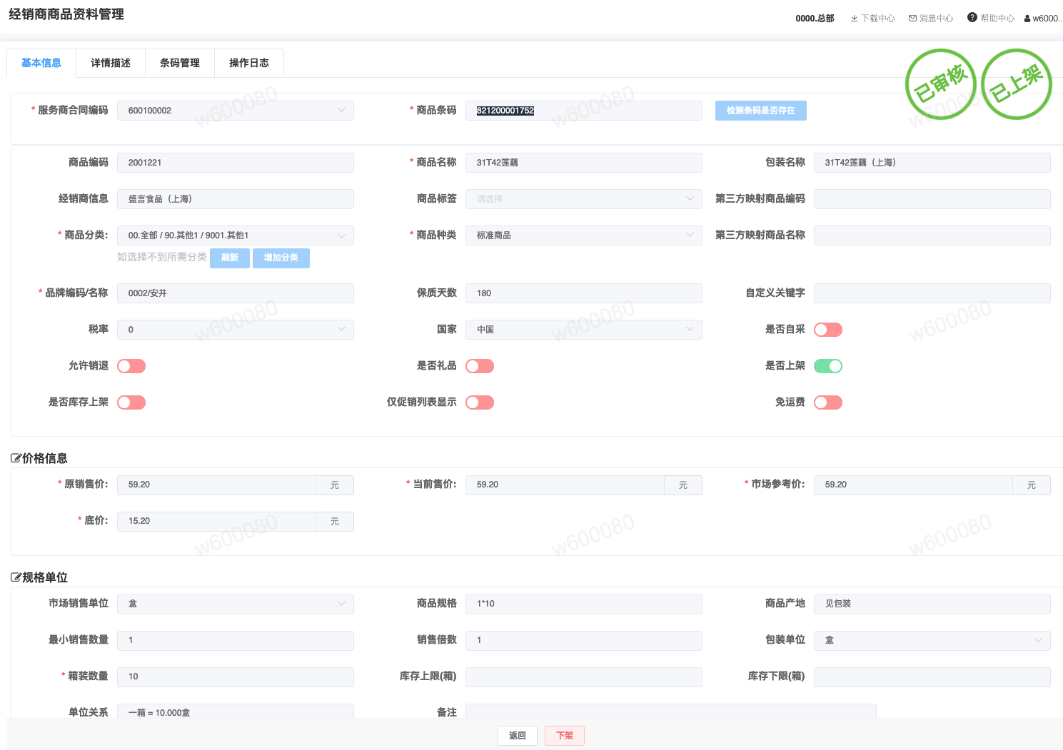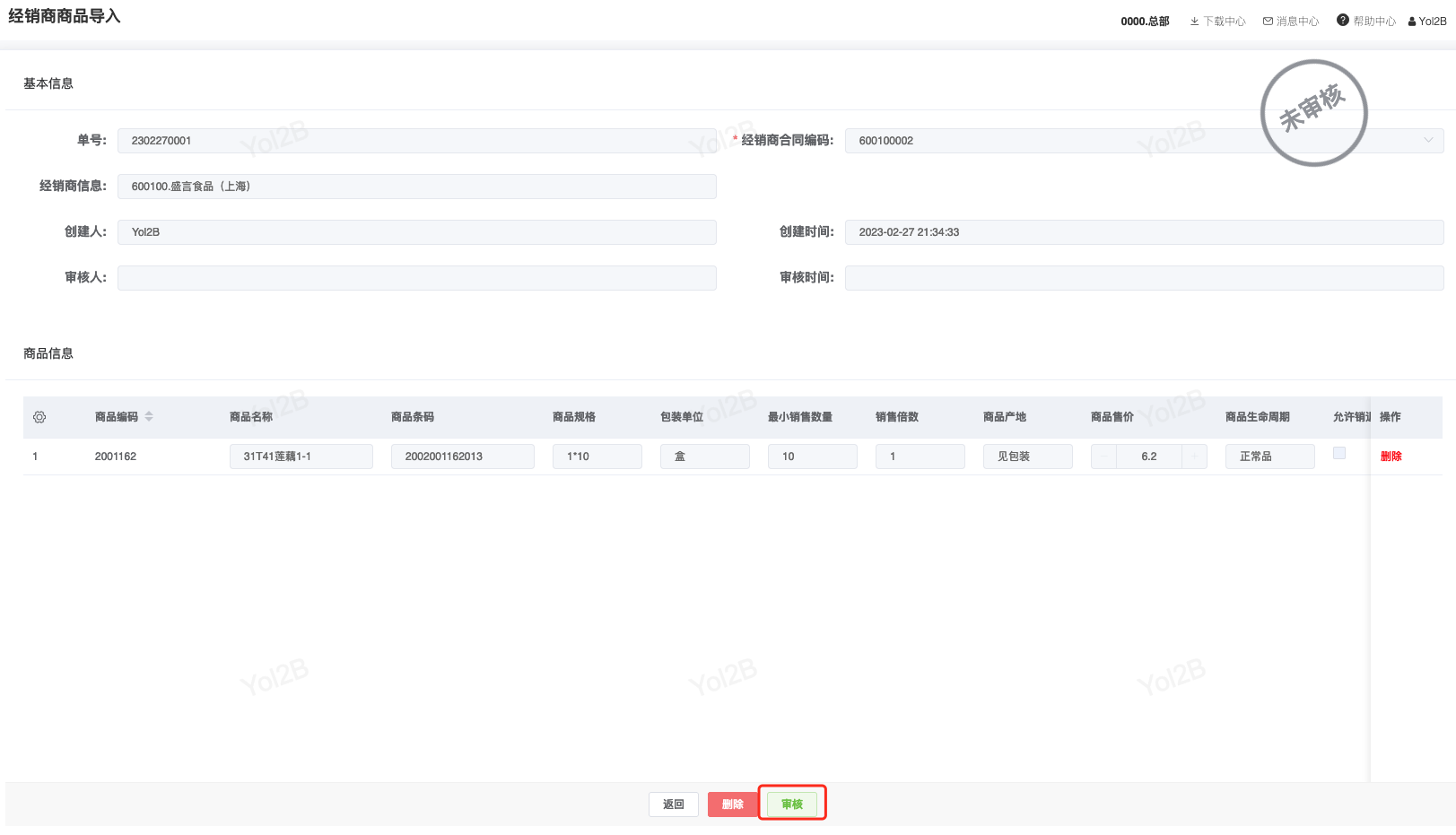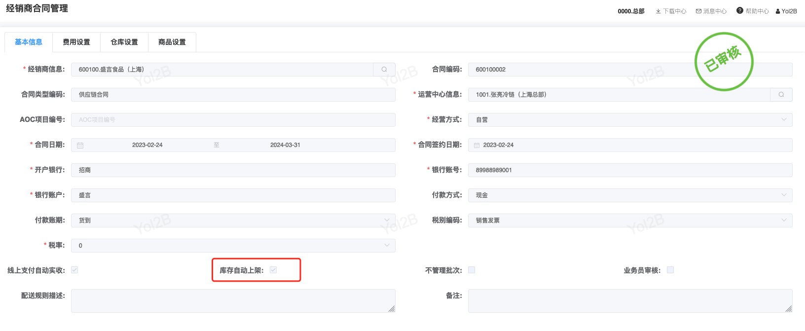 1.3-资料提报|经销商商品提报流程 ## 一、创建仓库 ### 路径:经销商/经销商仓库资料 点【新增】,填写仓库资料,确认后,即新增仓库成功。  ## 二、创建及审核合同 ### 路径:经销商/经销商合同管理 ==注意:经销商的每个仓库需创建不同合同,即按仓库+商品维护经销商合同。== 1. 点【新增】,填写基本信息,如「库存自动上架」开启,即采购入库后,即自动同步上架线上库存数量。 2. 确认后,点【修改】在【仓库设置】点【增加】,选择仓库,填写费用信息,无费用,可设置为0. 3. 确认后,即新增经销商合同成功。 4. 资料确认后,点【审核】,新增经销商合同审核生效。   ## 三、导入经销商商品 ### 路径:经销商/经销商商品导入、经销商端|商品/经销商商品导入 1. 点【批量导入】按表格格式,填写商品数据,可自定义商品编码,选择文件,确认上传服务器后,即成功批量导入商品数据。 2. 点【查询】,查看详情,点【审核】即可导入并审核经销商商品资料。    ## 四、新增、审核及上架经销商商品 ### 路径:经销商/经销商商品资料管理、经销商端|商品/经销商商品资料管理 1. 点【新增】,选择经销商合同、填写商品条码,点【检测条码是否存在】,如已存在,将自动导入商品库资料; 2. 填写完成后,确认后,即新增商品成功。 3. 资料确认完成,点【审核】,即同步商品资料到商品库,状态为已审核。 4. 点【上架】,即可发布商品到订货端。 ==注意:资料、价格变更时,经销商商品同步订货端,由任务调度定时同步,如需立即执行 [如何立即同步已更新资料到订货端(搜索引擎刷新) ](https://help.linkfern.com/project-16/doc-646/ "如何立即同步已更新资料到订货端(搜索引擎刷新) ")==