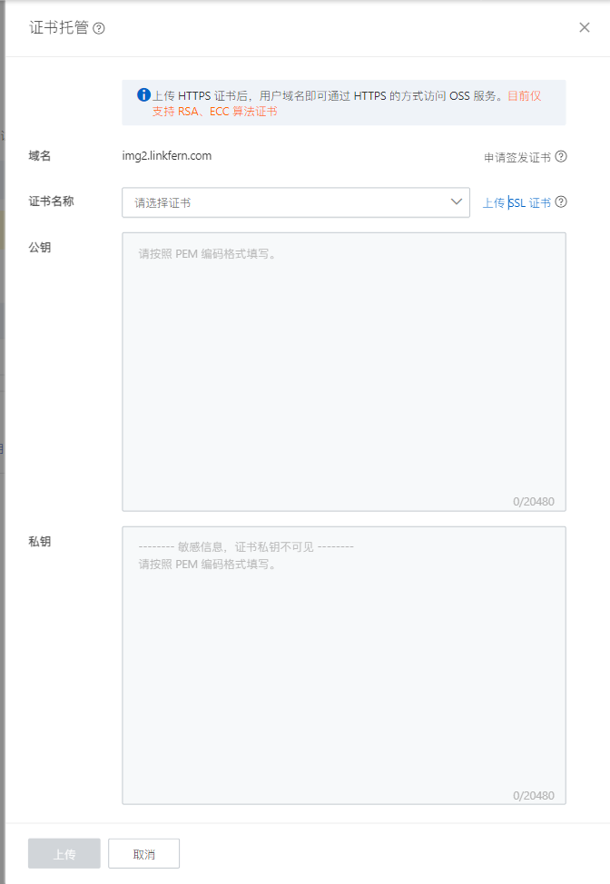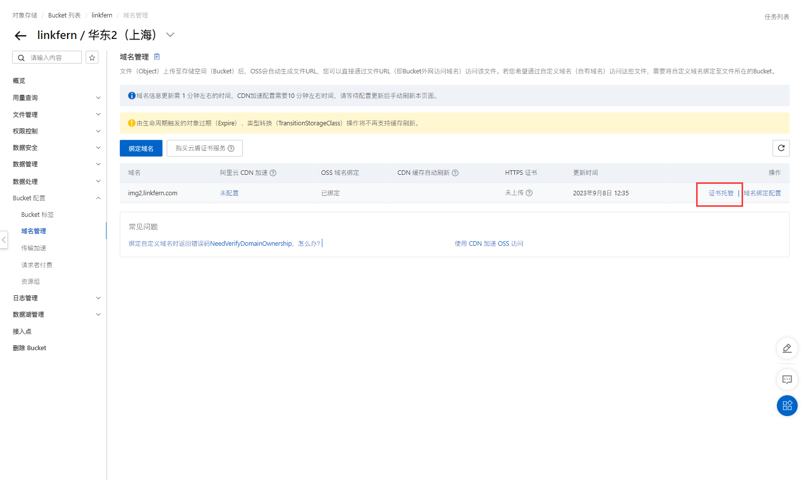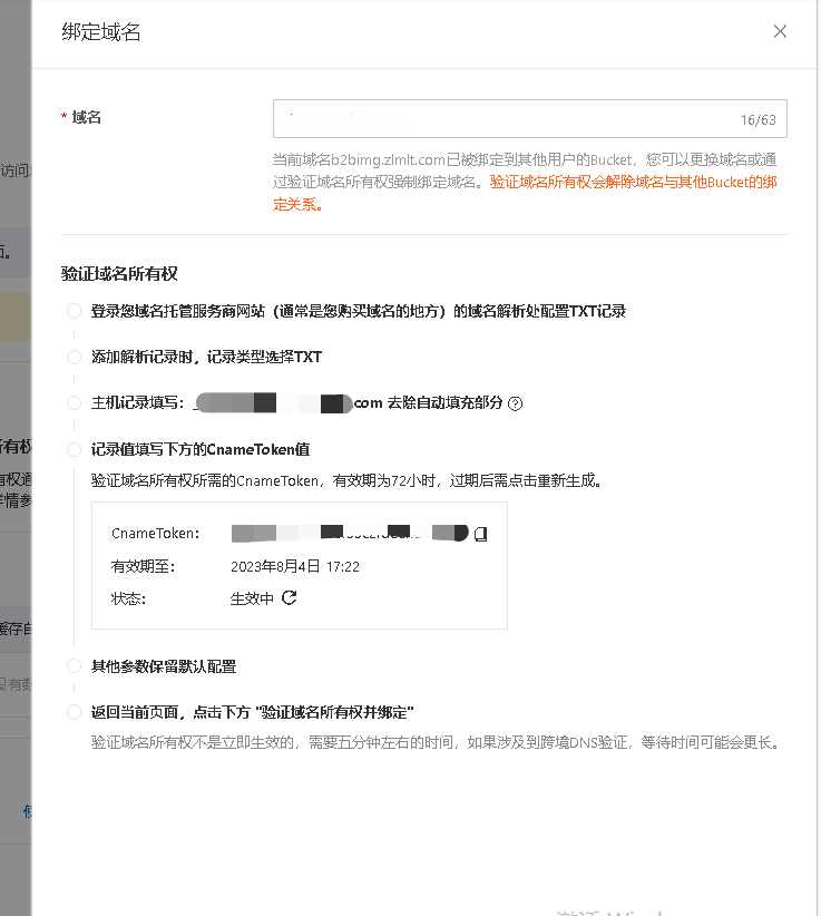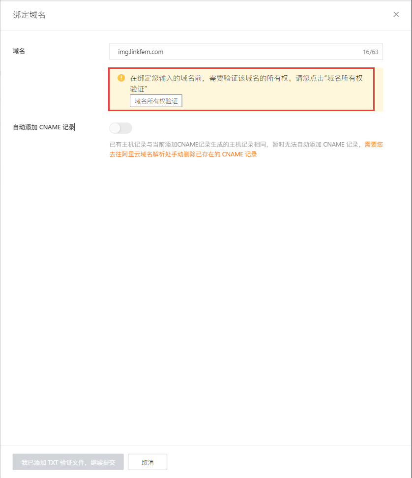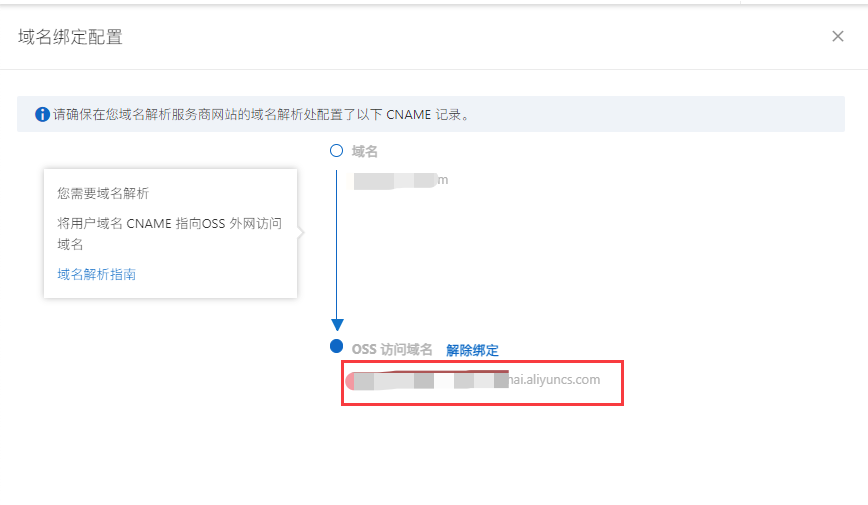 ## 阿里云OSS域名绑定检查 新的oss bucket需要绑定一下域名,麻烦在主域名的解析里添加一个TXT记录;主机记录填写和记录值CnameToken; 还需要把图片服务器域名的CNAME解析地址改为OSS外网访问域名如:service01.oss-cn-shanghai.aliyuncs.com 1.OSS控制台绑定域名,路径:Bucket配置-域名管理,点【绑定域名】     2.绑定域名后,点【证书托管】,上传SSL证书,绑定成功后,状态为「已绑定」    3.最后,点【域名绑定配置】,完成CNAME解析地址配置