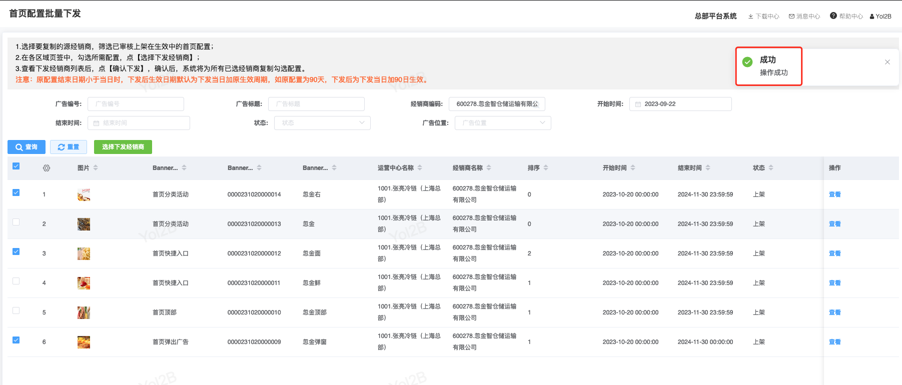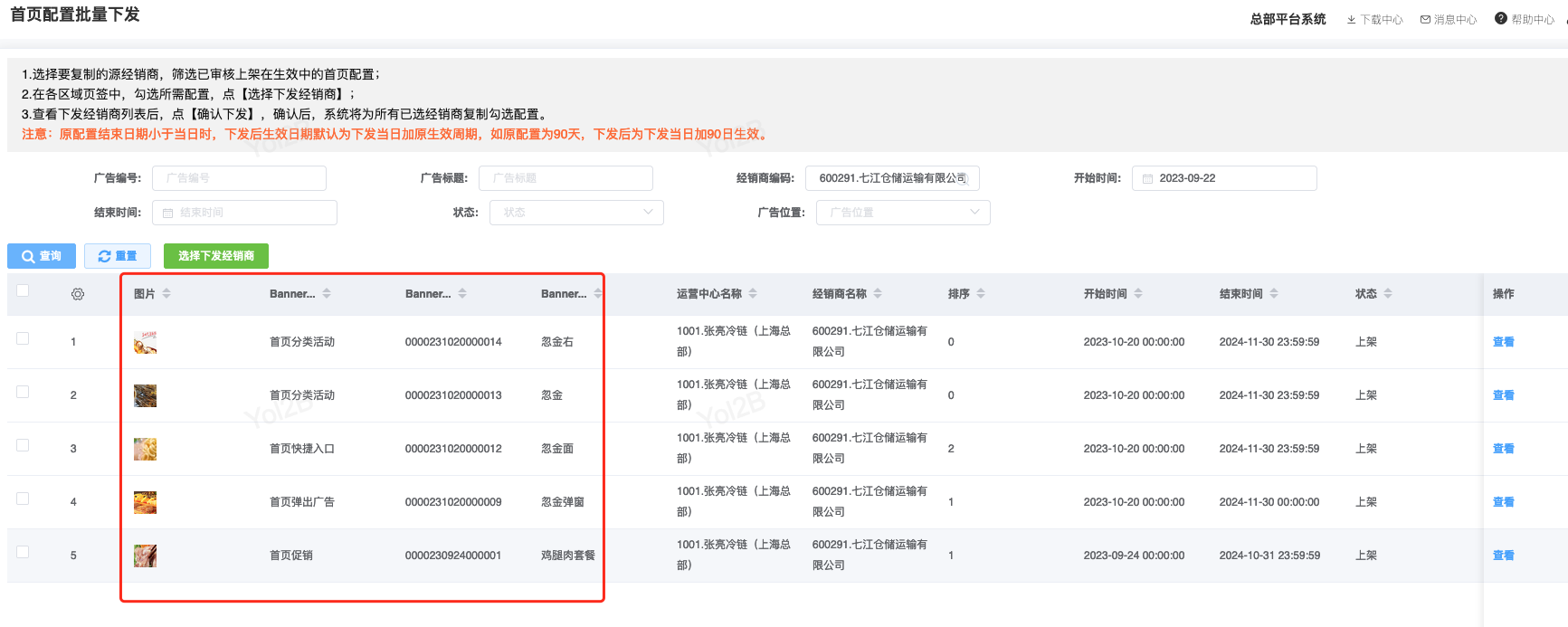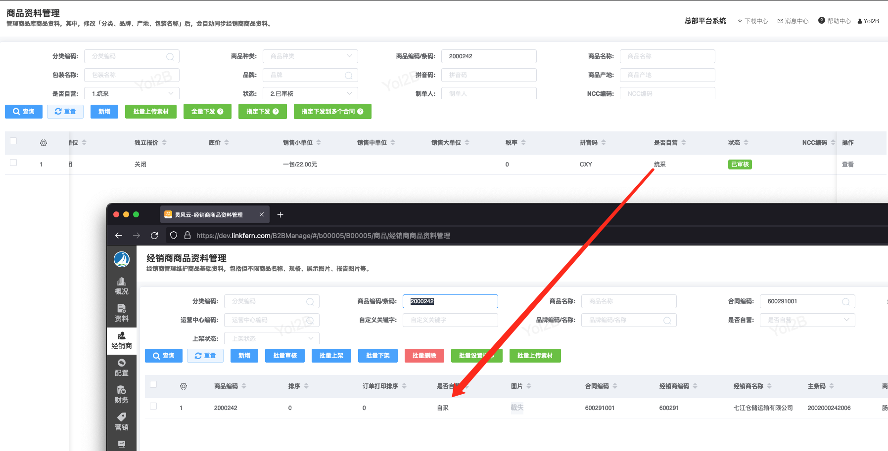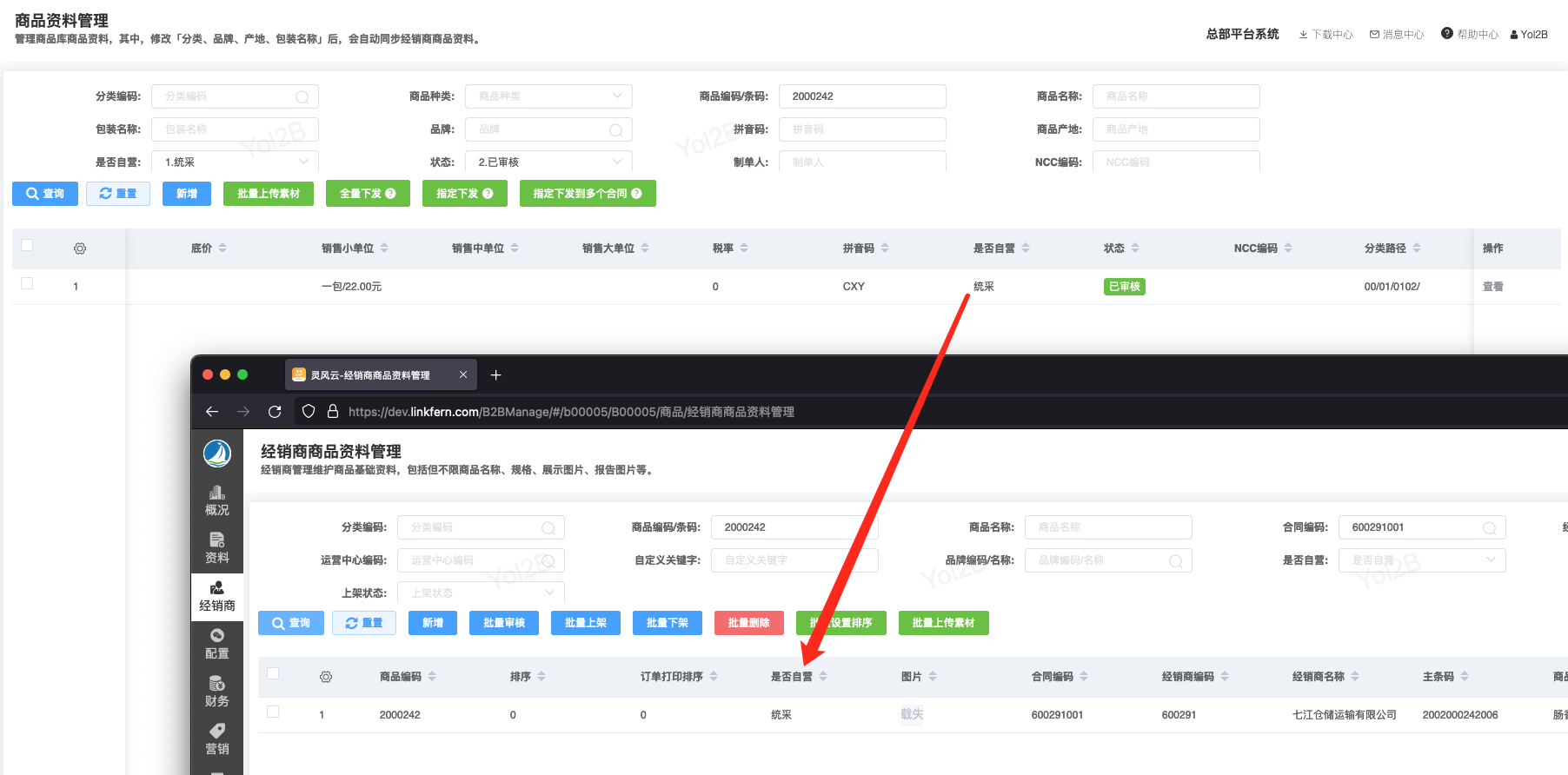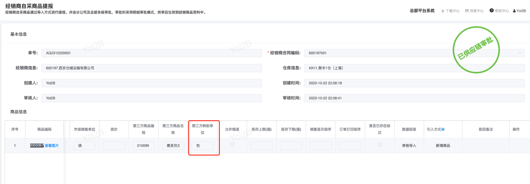 ## B2B平台及订货端|20231023版本 ### B2B平台系统 #### 1.总部-配置/首页配置批量下发:新增模块,用于批量勾选下发到多个指定经销商      #### 2.A10006/资料/商品资料管理:指定下发、指定下发到多个合同-确认提交-增加处理同步更新自营属性   #### 3.B00008/商品/经销商商品变更维护:首页查询结果调整、详情多单位显示问题 - 首页查询结果按最后修改时间降序、状态「审核中、已提交」状态标签区分颜色显示 - 修复详情明细无多单位显示开启问题  #### 4.B00055/商品/经销商自采商品提报:批量导入增加「第三方映射单位」(自定义字段1)字段  #### 5.B20003/库存/库存更正:详情明细增加【线上库存锁定】显示  #### 6.T20002/商品销售/商品销售按客户汇总:增加【是否自营】查询条件及结果  #### 7.D10002/加盟商/加盟商资料、D10003/加盟商/加盟店管理:审核为认证失败后,授权该门店的B2B用户不做冻结处理,仅全部解绑即可 #### 8.B80032/订单/待退款任务表:增加【原订单主单号、原订单子单号】查询条件及结果字段  #### 9.资料更新增加微服务处理实时同步到订货端,涉及经销商商品资料、营销等模块 A10006/资料/商品资料管理:全量下发、指定下发 B00008/商品/经销商商品变更维护:ACGoodsAlterCheck 复核-审批流程终审 B20003/库存/库存更正:审核 营销模块:审核、终止业务 B10022/营销/批量折扣 B10023/营销/包装折扣 B10024/营销/组合折扣 B10027/营销/满减促销 B10028/营销/换购促销 B10026/营销/限时秒杀 #### 10.B80013/经营报表/经销商线上订单收款查询:查询条件增加「支付平台订单号、商户订单号」筛选  ### 订货端 #### 1.B2B小程序端:订单详情-一个换购活动有多个换购商品,详情显示重复商品问题 <img src="https://help.linkfern.com/media/202310/2023-10-22_215527_4701740.004951816660770714.png" width="200">