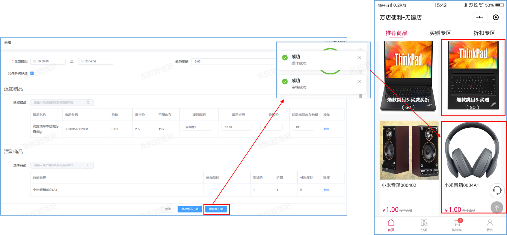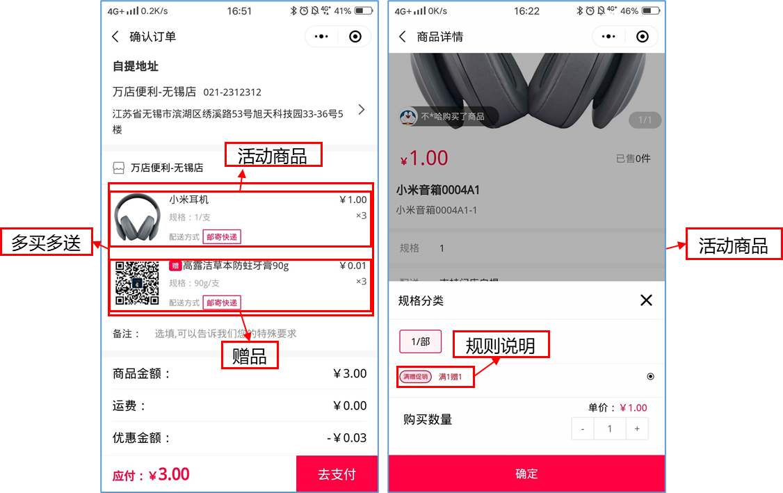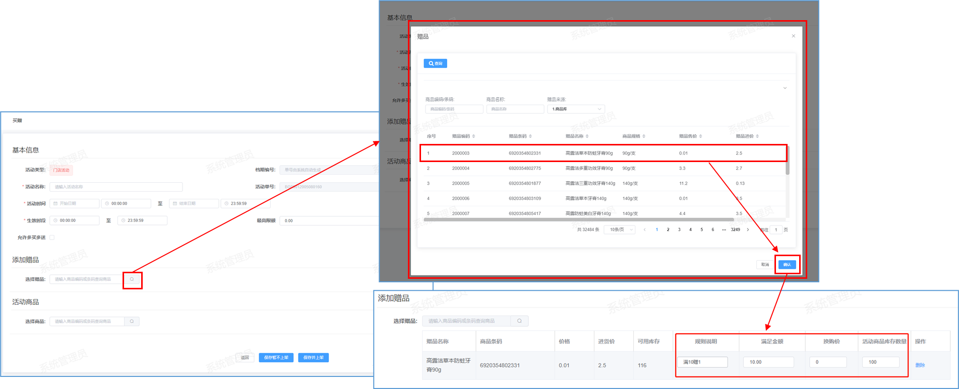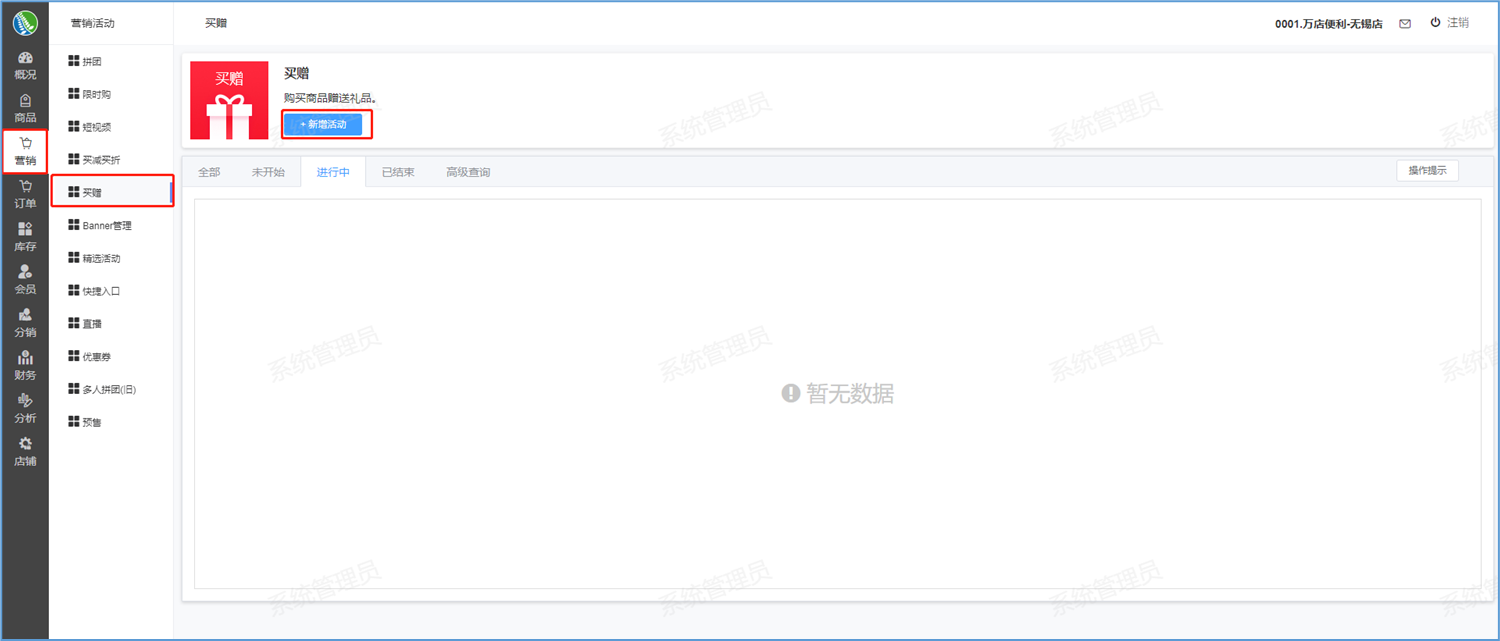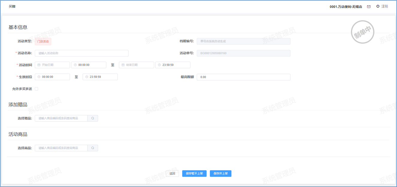 发布买赠活动-功能介绍 通过发布买赠活动功能,您可以发布做满赠活动的商品在小程序商城中。  发布买赠活动-功能路径 B2C门店运营管理后台->营销->买赠->新增活动  发布买赠活动-操作流程-新增活动 1.您可以根据系统提示,填写买赠活动的基本信息,然后点击“保存并上架”发布活动。 注意:“*” 为必填项,详细名词解释见下页。  发布买赠活动-操作流程-名词解释 活动名称:买赠活动的名称 档期编号:单号由系统自动生成 活动时间:买赠做活动的时间 活动单号:该满减活动的唯一标识单号,系统自动生成 生效时段:活动时间内每天几点到几点生效 允许多买多送:允许后,每达到规定金额的倍数,就多赠送一个商品(如满10送1,满20送2) 选择赠品:选择达到条件金额后赠送给买家的商品 规则说明:给买家看的活动说明 满足金额:满足多少金额后可以送增品 换购价:默认为0,您也可以设置满足金额后用多少钱换购赠品 赠品库存:商家赠品的总数,赠品库存为0时,将不再赠送。 活动商品:参与买赠活动的商品  发布买赠活动-操作流程-选择赠品 1.您可以点击选择赠品右侧的按钮,按照提示选择你想要赠送的商品,然后点击“确定”添加赠品。 2.然后您可以根据系统提示,输入规则说明、满足金额、换购价、赠品库存等信息。  发布买赠活动-操作流程-活动商品 您可以点击选择活动商品右侧的按钮,按照提示选择你想要活动商品,然后点击“确定”添加商品(如图)。  发布买赠活动-操作流程-保存并上架 1.当您的活动中的所有带“*”必填项都填写完成后,点击“保存并上架”按钮,就可以将活动上架到小程序商城中了。 2.在小程序商城中下滑至“买赠”模块(如图),即可找到您的商品。 3.您也可以点击“爆款类目6-买赠”(如图),即可显示全部买赠商品。  发布买赠活动-操作流程-购买买赠商品 您可以在小程序商城购买买减活动商品,当达到满减价格后,购买商品,系统会自动为您计算满减价格。