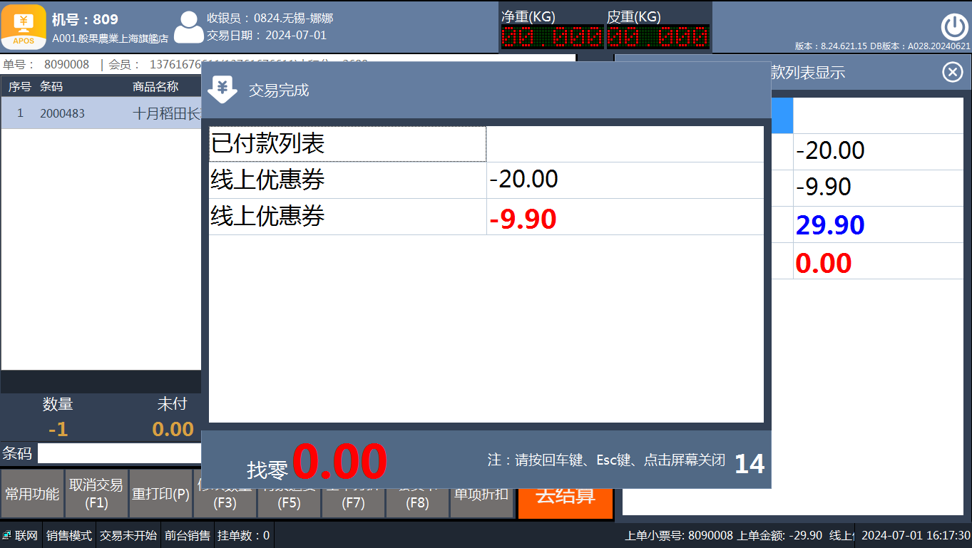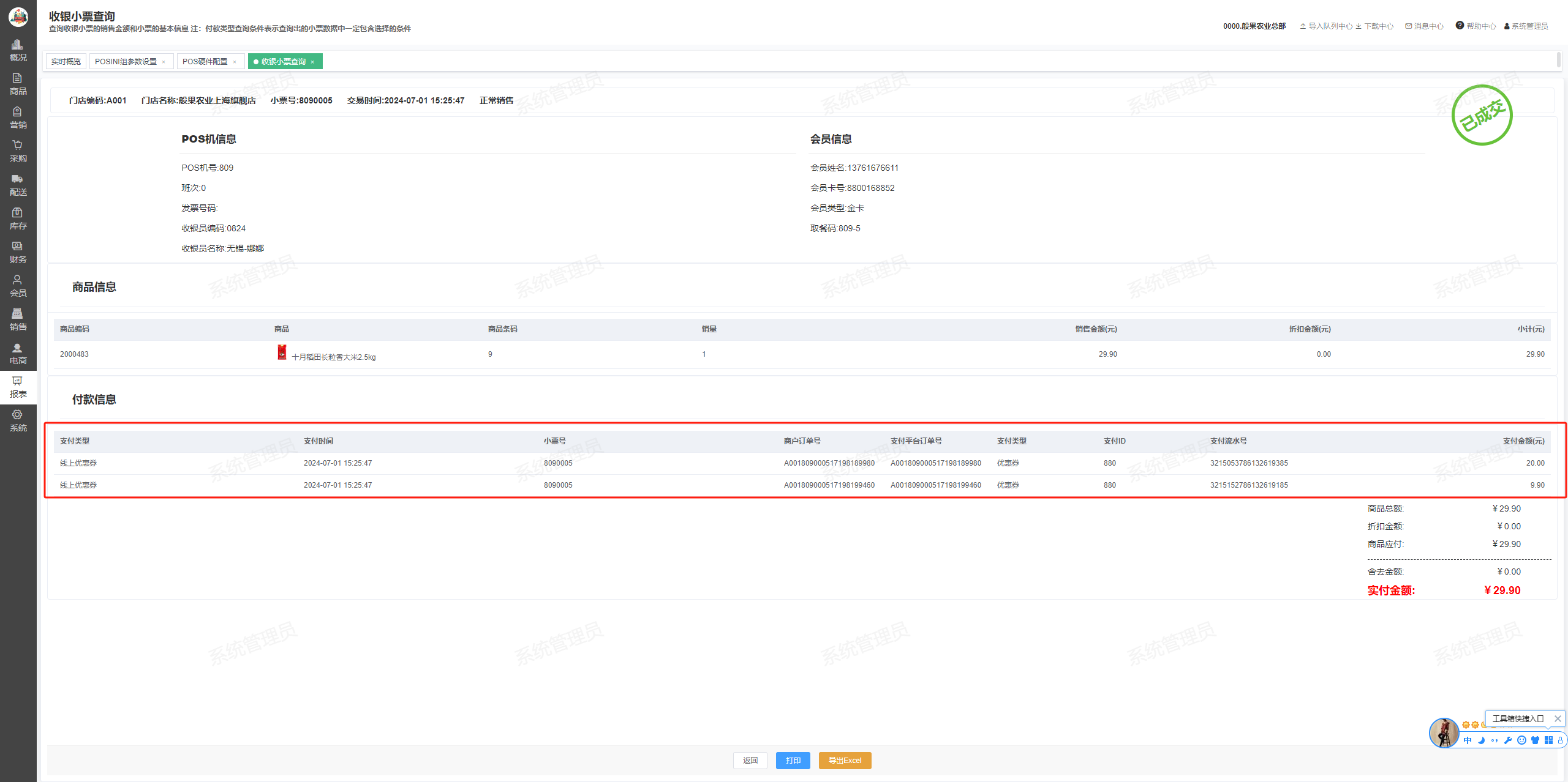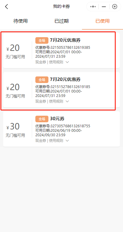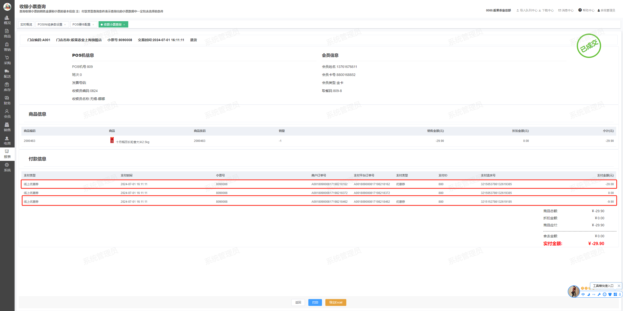 ## 使用优惠券付款 ### 一、输入会员结算时自动显示可用券 #### 1、功能菜单中找到【年卡会员】或【会员卡】功能,点击后输入会员卡号或会员手机号   #### 2、商品购买添加完成后,点击【去结算】按钮,会自动展示可用优惠券列表  #### 3、选择一张20元优惠券,点击【确认】提交优惠券付款   ### 二、使用输入优惠券号码付款 #### 1、会员打开【B2C商城小程序-我的-优惠券】找到要使用的优惠券,点击优惠券可展示优惠券二维码和券号  #### 2、使用【优惠券】快捷键或付款列表选择【线上优惠券】进行付款 注:券面额大于销售金额时不退超出部分  #### 3、扫描优惠券二维码或输入券号  #### 4、输入优惠券后4位,再次确认验证的优惠券     #### 5、结算完成后打印小票  ## 查看销售订单 ### POS收银系统-小票查询  ### 后台-报表-收银报表查-收银小票查询  ## 退货 ### 1、常用功能菜单中点击【有票退货】,进入退货模式  ### 2、输入原销售小票号  ### 3、使用优惠券交易的订单自动查询原订单交易商品内容,点击【去结算】 注:优惠券的交易订单仅允许全部退货,不允许部分退  ### 4、付款列表选择【线上优惠券】  ### 5、如果只有一张券则自动退款,如果有多张券则需选择要退的券     ## 查询退货订单 ### POS收银系统-小票查询  ### 后台-报表-收银报表查-收银小票查询