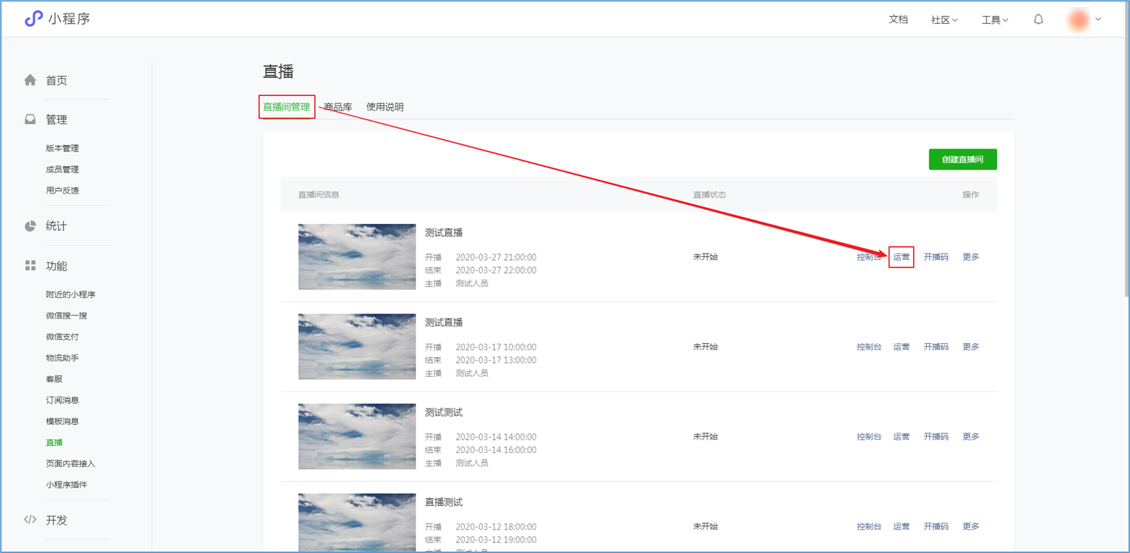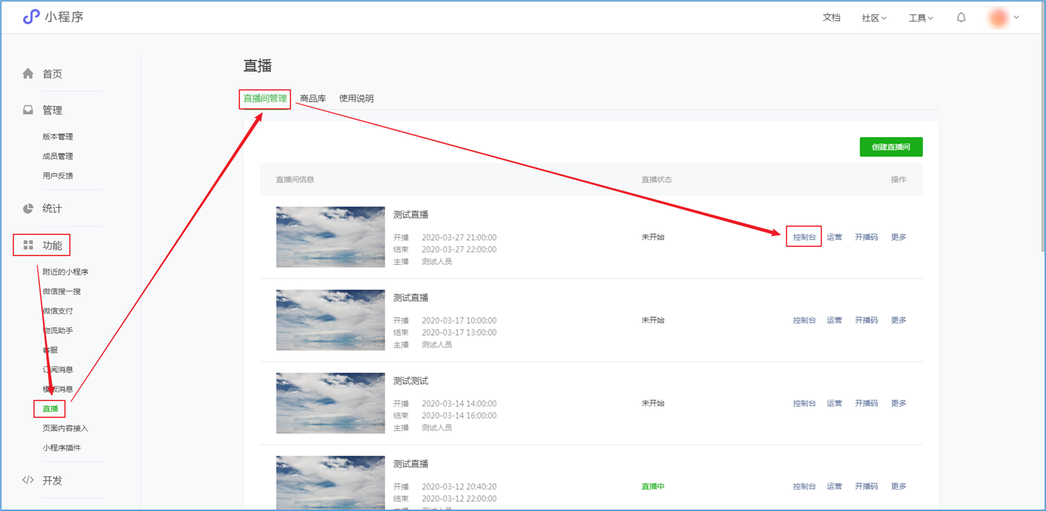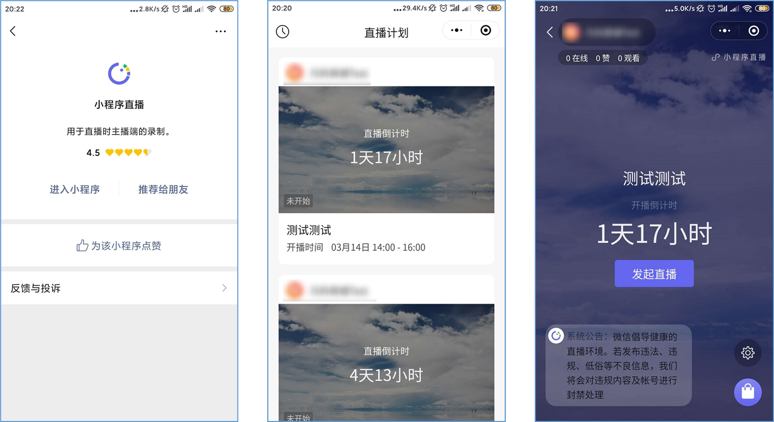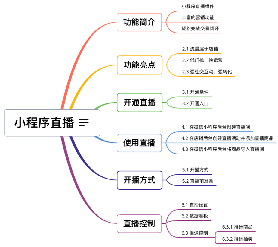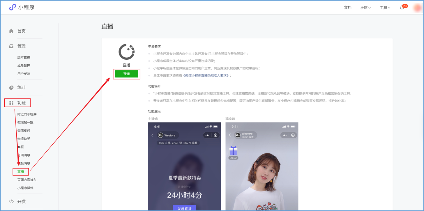 微信小程序直播-功能简介 小程序直播组件是微信为商家提供的实时视频直播工具,可以帮助商家快速通过小程序向用户提供优质的直播内容。同时,借助小程序丰富的营销功能,使得用户可以在小程序内轻松完成购买交易闭环,有效提升转化率。  微信小程序直播-功能亮点 流量属于商家 1.无需跳转:用户观看直播内容、下单在自家小程序完成。 2.流量自由:直播流量将沉淀在自己小程序中。 3.自主性强:可自行决定开展直播时间及频次。  微信小程序直播-功能亮点 低门槛、快运营 1.开发快:接入快、快运营。 2.已运营:至快20分钟即可上手。 3.丰富互动:提供点赞、抽奖、优惠券派发等能力。  微信小程序直播-功能亮点 强社交互动、强转化 1.小程序直播x订阅消息:支持一键订阅,方便用户回访。 2.小程序直播x社交:一键分享直播间至微信聊天。 3.小程序直播x公众号:公众号可为直播间引流,粉丝更易转化。 微信小程序直播-开启直播-开通条件 一:申请要求: 1.小程序开发者为国内非个人主体开发者,且小程序类目在开放类目中; 2.小程序所属主体近半年内没有严重违规记录; 3.小程序所属主体在微信生态内的用户运营、商业变现及投放推广的效果达标; 注:具体申请要求请查看《[微信小程序直播功能准入要求](https://res.wx.qq.com/mmbizwxampnodelogicsvr_node/dist/images/access_47d0ce.pdf)》(网址:[https://res.wx.qq.com/mmbizwxampnodelogicsvr_node/dist/images/access_47d0ce.pdf](https://res.wx.qq.com/mmbizwxampnodelogicsvr_node/dist/images/access_47d0ce.pdf)); 二、运营要求: 1.主体下小程序近半年没有严重违规 2.小程序近90天内存在支付行为 以上2个运营条件和类目同时满足的前提下,下面3个条件满足其一即可 1.主体下公众号累计粉丝大于100 2.主体下小程序连续7日dua(日活跃用户数)大于100 3.主体在微信生态内近1年广告投放实际消耗金额大于10000元 微信小程序直播-开启直播-开通入口 登录微信小程序后台,进入【功能-直播】中点击“开通”按钮,然后阅读并勾选同意服务条款,即可开通小程序直播功能。  微信小程序直播-创建直播间 开通功能后,在【微信小程序后台-功能-直播-直播间管理】中,点击“创建直播间”。  微信小程序直播-创建直播间-直播类型 按要求填写直播间类型。直播类型分为手机直播和推流设备直播。如果您使用手机直播,只需点击“手机直播”按钮即可。 手机直播:通过“小程序直播主播端小程序”发起直播。  微信小程序直播-创建直播间-直播类型 如果您使用推流设备直播,需点击“推流设备直播”按钮,然后根据您的设备选则横屏或竖屏。填写完毕后,点击“下一步”按钮进入基本信息页面填写。 推流设备直播:通过第三方推流设备发起直播(仅当小程序直播组件版本在1.0.3或以上有效果)  微信小程序直播-创建直播间-基本信息 按要求填写直播间资料,如:直播标题、开播时间、主播昵称、主播微信账号、是否允许评论、分享卡片封面、直播间封面等。  微信小程序直播-创建直播间-基本信息 直播标题:必须为3-17个汉字(一个字等于两个英文字符或特殊字符)。 开播时间:所选时间范围必须在12小时以内;开播时间和结束时间间隔不得短于30分钟。计划结束时间到时,正在进行的直播不会被强制结束,但若主播仍未开播,该直播间将过期,无法开播。 主播昵称:必须为2-15个汉字(一个字等于两个英文字符或特殊字符)。 主播微信账号:需与实际开播的主播一致,主播第1次登陆开播小程序时将进行实名验证。 注: 1、直播间资料所有选项均为必填项。 2、填写内容将以左侧预览图的样式展示给用户。 微信小程序直播-创建直播间-样式配置 按要求上传分享卡片封面和直播间背景墙(如图)。  微信小程序直播-创建直播间 成功创建直播间后,可以进行分享直播间、添加运营资源、查看推流小程序码操作。 分享直播间:可获取直播间小程序码,用于微信聊天等渠道分享。 添加运营资源:可在直播间添加商品、抽奖等。 查看推流小程序码:主播扫码可进入“小程序直播”发起直播。  微信小程序直播-创建直播间 您可以在【微信小程序后台-功能-直播-直播间管理】中,找到您的直播间,然后点击“开播码”进入主播小程序进行推流。  微信小程序直播-创建直播间 如果您设置的是“推流设备直播”,然后点击“推流地址”进入主播小程序进行推流。扫码后,您将获得您的唯一推流直流地址,请先保存,在后续步骤将会使用。  微信小程序直播-在管理后台中添加直播活动及商品 创建直播间成功后,您可以打开管理后台,进入【营销-直播】中,点击“新增活动”,新增一个直播活动。  微信小程序直播-新增活动-基本设置 进入直播活动基本设置,您可以根据系统提示,填写活动的基本信息。 开播时间:直播活动的开播时间 排序:直播活动在小程序商城的显示顺序(排序越大显示越靠前) 直播入口:小程序模板中开启“是否显示直播”  微信小程序直播-新增活动-直播商品 直播活动的基本设置填写完毕后,您可以切换页签至“直播商品”,点击添加商品,添加本次直播的商品。  微信小程序直播-新增活动-直播商品 添加商品后,您可以点击商品的“编辑”按钮,为商品添加价格信息。 商品封面:商品的封面图,系统自动添加 商品简称:商品的名称 价格类型:分为一口价、价格区间、显示折扣价三种类型。  微信小程序