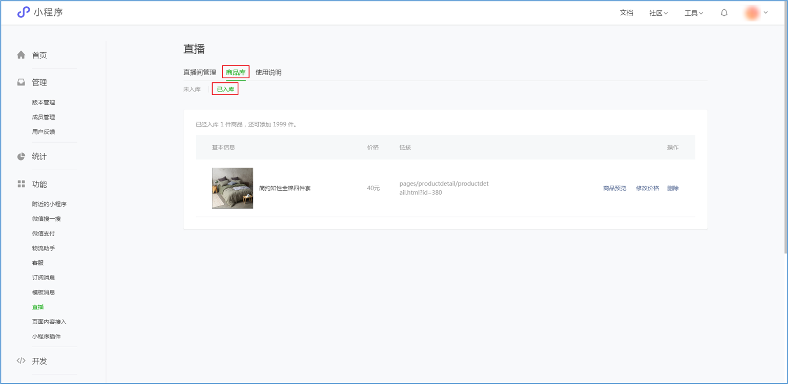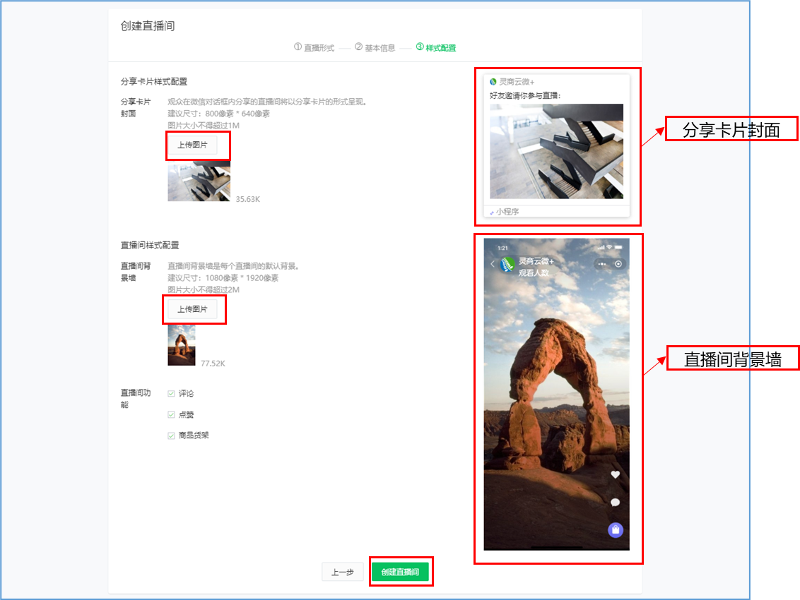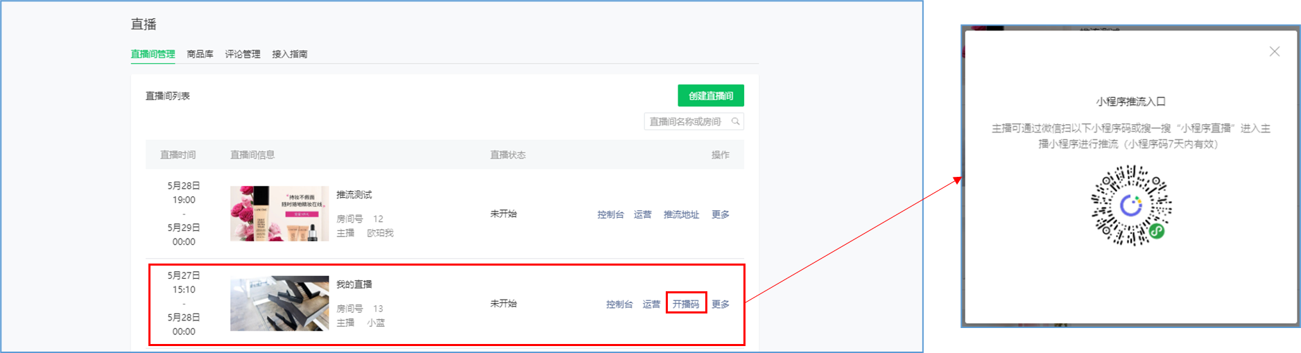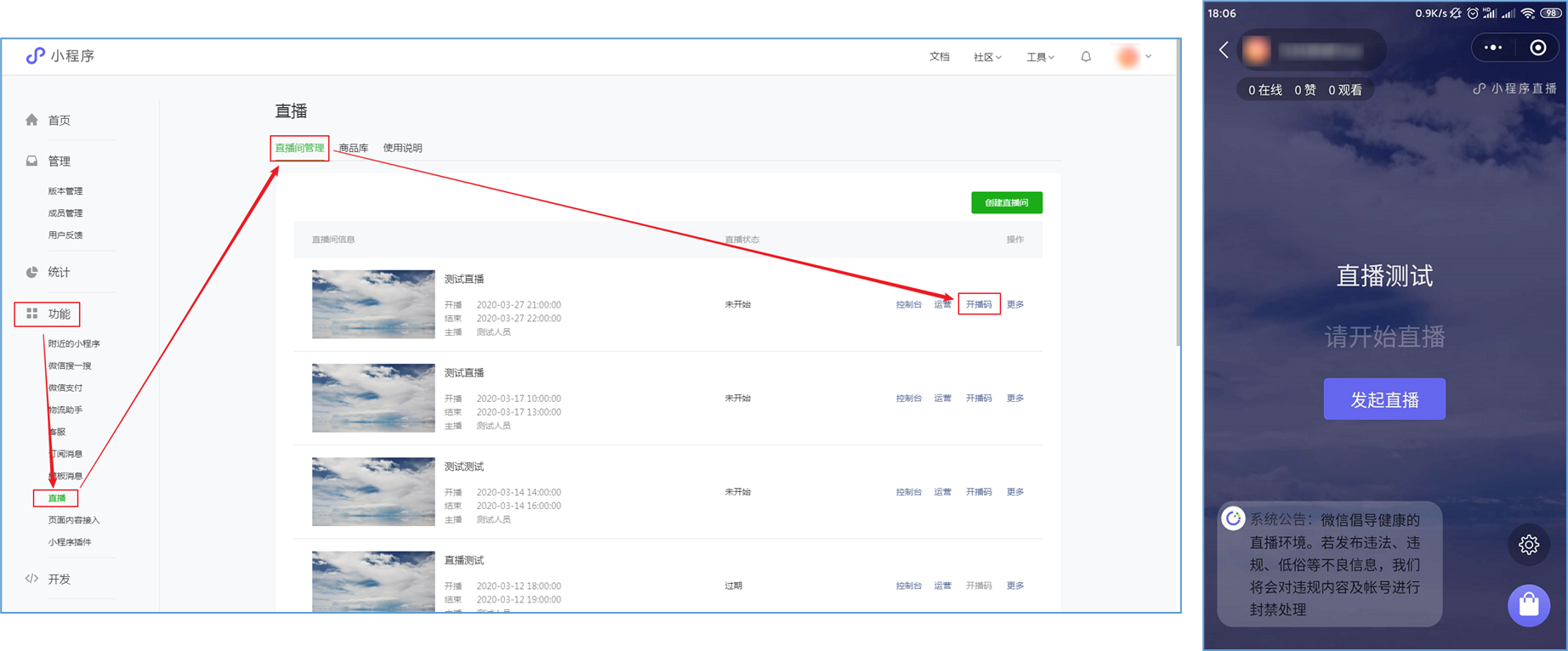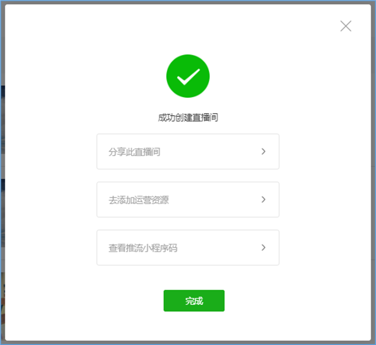 微信小程序直播-功能简介 小程序直播组件是微信为商家提供的实时视频直播工具,可以帮助商家快速通过小程序向用户提供优质的直播内容。同时,借助小程序丰富的营销功能,使得用户可以在小程序内轻松完成购买交易闭环,有效提升转化率。  微信小程序直播-功能亮点 流量属于商家 1.无需跳转:用户观看直播内容、下单在自家小程序完成。 2.流量自由:直播流量将沉淀在自己小程序中。 3.自主性强:可自行决定开展直播时间及频次。  微信小程序直播-功能亮点 低门槛、快运营 1.开发快:接入快、快运营。 2.已运营:至快20分钟即可上手。 3.丰富互动:提供点赞、抽奖、优惠券派发等能力。  微信小程序直播-功能亮点 强社交互动、强转化 1.小程序直播x订阅消息:支持一键订阅,方便用户回访。 2.小程序直播x社交:一键分享直播间至微信聊天。 3.小程序直播x公众号:公众号可为直播间引流,粉丝更易转化。 微信小程序直播-开启直播-开通条件 一:申请要求: 1.小程序开发者为国内非个人主体开发者,且小程序类目在开放类目中; 2.小程序所属主体近半年内没有严重违规记录; 3.小程序所属主体在微信生态内的用户运营、商业变现及投放推广的效果达标; 注:具体申请要求请查看《[微信小程序直播功能准入要求](https://res.wx.qq.com/mmbizwxampnodelogicsvr_node/dist/images/access_47d0ce.pdf)》(网址:[https://res.wx.qq.com/mmbizwxampnodelogicsvr_node/dist/images/access_47d0ce.pdf](https://res.wx.qq.com/mmbizwxampnodelogicsvr_node/dist/images/access_47d0ce.pdf)); 二、运营要求: 1.主体下小程序近半年没有严重违规 2.小程序近90天内存在支付行为 以上2个运营条件和类目同时满足的前提下,下面3个条件满足其一即可 1.主体下公众号累计粉丝大于100 2.主体下小程序连续7日dua(日活跃用户数)大于100 3.主体在微信生态内近1年广告投放实际消耗金额大于10000元 微信小程序直播-开启直播-开通入口 登录微信小程序后台,进入【功能-直播】中点击“开通”按钮,然后阅读并勾选同意服务条款,即可开通小程序直播功能。  微信小程序直播-创建直播间 开通功能后,在【微信小程序后台-功能-直播-直播间管理】中,点击“创建直播间”。  微信小程序直播-创建直播间-直播类型 按要求填写直播间类型。直播类型分为手机直播和推流设备直播。如果您使用手机直播,只需点击“手机直播”按钮即可。 手机直播:通过“小程序直播主播端小程序”发起直播。  微信小程序直播-创建直播间-直播类型 如果您使用推流设备直播,需点击“推流设备直播”按钮,然后根据您的设备选则横屏或竖屏。填写完毕后,点击“下一步”按钮进入基本信息页面填写。 推流设备直播:通过第三方推流设备发起直播(仅当小程序直播组件版本在1.0.3或以上有效果)  微信小程序直播-创建直播间-基本信息 按要求填写直播间资料,如:直播标题、开播时间、主播昵称、主播微信账号、是否允许评论、分享卡片封面、直播间封面等。  微信小程序直播-创建直播间-基本信息 直播标题:必须为3-17个汉字(一个字等于两个英文字符或特殊字符)。 开播时间:所选时间范围必须在12小时以内;开播时间和结束时间间隔不得短于30分钟。计划结束时间到时,正在进行的直播不会被强制结束,但若主播仍未开播,该直播间将过期,无法开播。 主播昵称:必须为2-15个汉字(一个字等于两个英文字符或特殊字符)。 主播微信账号:需与实际开播的主播一致,主播第1次登陆开播小程序时将进行实名验证。 注: 1、直播间资料所有选项均为必填项。 2、填写内容将以左侧预览图的样式展示给用户。 微信小程序直播-创建直播间-样式配置 按要求上传分享卡片封面和直播间背景墙(如图)。  微信小程序直播-创建直播间 成功创建直播间后,可以进行分享直播间、添加运营资源、查看推流小程序码操作。 分享直播间:可获取直播间小程序码,用于微信聊天等渠道分享。 添加运营资源:可在直播间添加商品、抽奖等。 查看推流小程序码:主播扫码可进入“小程序直播”发起直播。  微信小程序直播-创建直播间 您可以在【微信小程序后台-功能-直播-直播间管理】中,找到您的直播间,然后点击“开播码”进入主播小程序进行推流。  微信小程序直播-创建直播间 如果您设置的是“推流设备直播”,然后点击“推流地址”进入主播小程序进行推流。扫码后,您将获得您的唯一推流直流地址,请先保存,在后续步骤将会使用。  微信小程序直播-在管理后台中添加直播活动及商品 创建直播间成功后,您可以打开管理后台,进入【营销-直播】中,点击“新增活动”,新增一个直播活动。  微信小程序直播-新增活动-基本设置 进入直播活动基本设置,您可以根据系统提示,填写活动的基本信息。 开播时间:直播活动的开播时间 排序:直播活动在小程序商城的显示顺序(排序越大显示越靠前) 直播入口:小程序模板中开启“是否显示直播”  微信小程序直播-新增活动-直播商品 直播活动的基本设置填写完毕后,您可以切换页签至“直播商品”,点击添加商品,添加本次直播的商品。  微信小程序直播-新增活动-直播商品 添加商品后,您可以点击商品的“编辑”按钮,为商品添加价格信息。 商品封面:商品的封面图,系统自动添加 商品简称:商品的名称 价格类型:分为一口价、价格区间、显示折扣价三种类型。  微信小程序