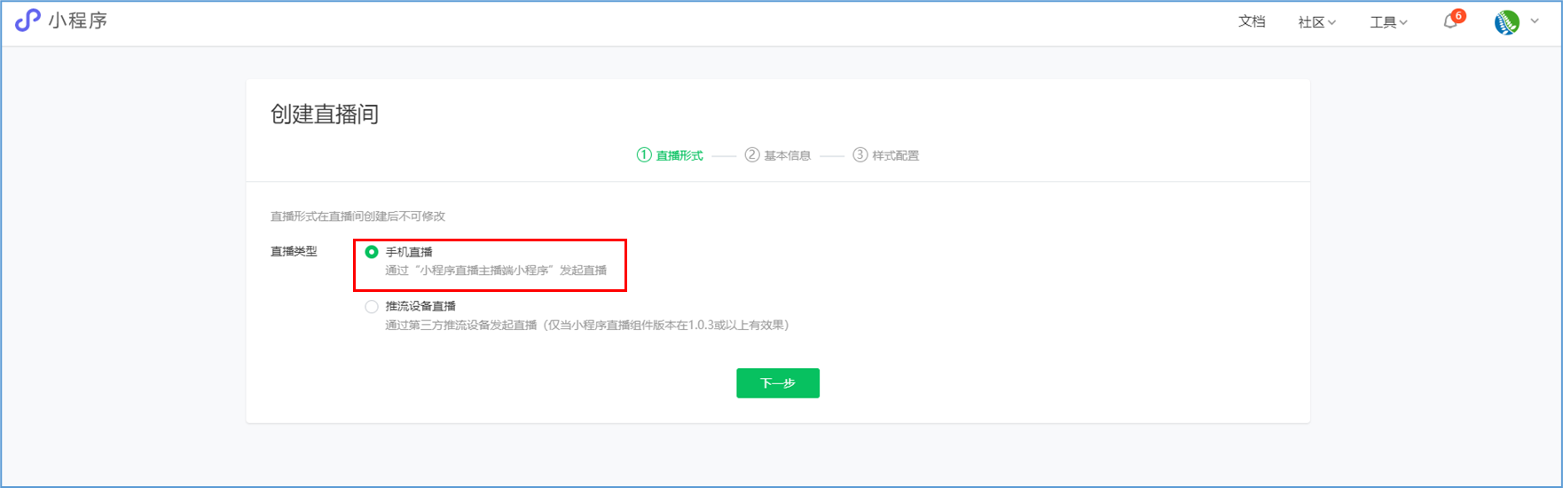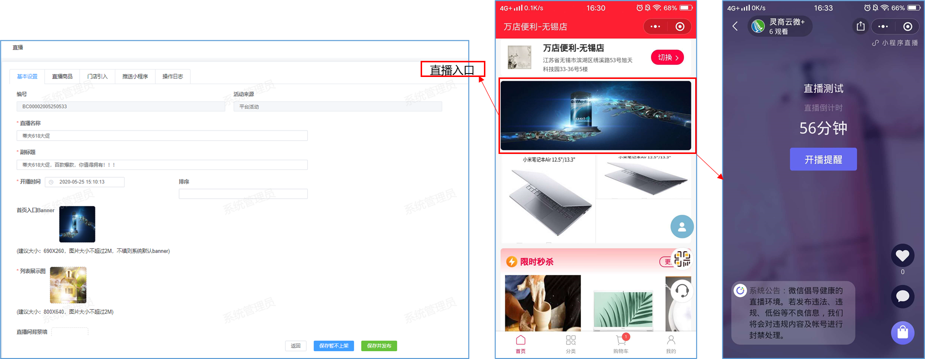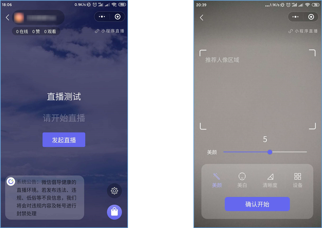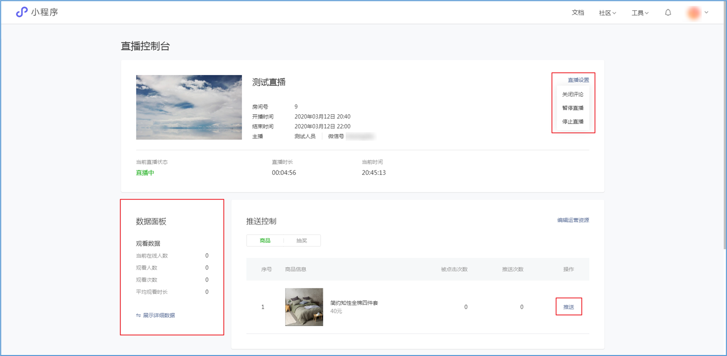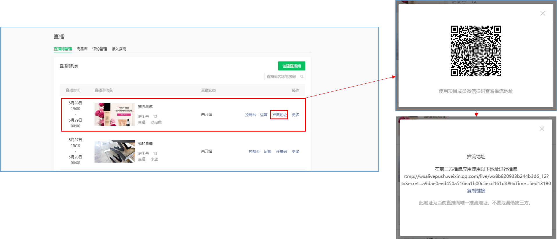 微信小程序直播-功能简介 小程序直播组件是微信为商家提供的实时视频直播工具,可以帮助商家快速通过小程序向用户提供优质的直播内容。同时,借助小程序丰富的营销功能,使得用户可以在小程序内轻松完成购买交易闭环,有效提升转化率。  微信小程序直播-功能亮点 流量属于商家 1.无需跳转:用户观看直播内容、下单在自家小程序完成。 2.流量自由:直播流量将沉淀在自己小程序中。 3.自主性强:可自行决定开展直播时间及频次。  微信小程序直播-功能亮点 低门槛、快运营 1.开发快:接入快、快运营。 2.已运营:至快20分钟即可上手。 3.丰富互动:提供点赞、抽奖、优惠券派发等能力。  微信小程序直播-功能亮点 强社交互动、强转化 1.小程序直播x订阅消息:支持一键订阅,方便用户回访。 2.小程序直播x社交:一键分享直播间至微信聊天。 3.小程序直播x公众号:公众号可为直播间引流,粉丝更易转化。 微信小程序直播-开启直播-开通条件 一:申请要求: 1.小程序开发者为国内非个人主体开发者,且小程序类目在开放类目中; 2.小程序所属主体近半年内没有严重违规记录; 3.小程序所属主体在微信生态内的用户运营、商业变现及投放推广的效果达标; 注:具体申请要求请查看《[微信小程序直播功能准入要求](https://res.wx.qq.com/mmbizwxampnodelogicsvr_node/dist/images/access_47d0ce.pdf)》(网址:[https://res.wx.qq.com/mmbizwxampnodelogicsvr_node/dist/images/access_47d0ce.pdf](https://res.wx.qq.com/mmbizwxampnodelogicsvr_node/dist/images/access_47d0ce.pdf)); 二、运营要求: 1.主体下小程序近半年没有严重违规 2.小程序近90天内存在支付行为 以上2个运营条件和类目同时满足的前提下,下面3个条件满足其一即可 1.主体下公众号累计粉丝大于100 2.主体下小程序连续7日dua(日活跃用户数)大于100 3.主体在微信生态内近1年广告投放实际消耗金额大于10000元 微信小程序直播-开启直播-开通入口 登录微信小程序后台,进入【功能-直播】中点击“开通”按钮,然后阅读并勾选同意服务条款,即可开通小程序直播功能。  微信小程序直播-创建直播间 开通功能后,在【微信小程序后台-功能-直播-直播间管理】中,点击“创建直播间”。  微信小程序直播-创建直播间-直播类型 按要求填写直播间类型。直播类型分为手机直播和推流设备直播。如果您使用手机直播,只需点击“手机直播”按钮即可。 手机直播:通过“小程序直播主播端小程序”发起直播。  微信小程序直播-创建直播间-直播类型 如果您使用推流设备直播,需点击“推流设备直播”按钮,然后根据您的设备选则横屏或竖屏。填写完毕后,点击“下一步”按钮进入基本信息页面填写。 推流设备直播:通过第三方推流设备发起直播(仅当小程序直播组件版本在1.0.3或以上有效果)  微信小程序直播-创建直播间-基本信息 按要求填写直播间资料,如:直播标题、开播时间、主播昵称、主播微信账号、是否允许评论、分享卡片封面、直播间封面等。  微信小程序直播-创建直播间-基本信息 直播标题:必须为3-17个汉字(一个字等于两个英文字符或特殊字符)。 开播时间:所选时间范围必须在12小时以内;开播时间和结束时间间隔不得短于30分钟。计划结束时间到时,正在进行的直播不会被强制结束,但若主播仍未开播,该直播间将过期,无法开播。 主播昵称:必须为2-15个汉字(一个字等于两个英文字符或特殊字符)。 主播微信账号:需与实际开播的主播一致,主播第1次登陆开播小程序时将进行实名验证。 注: 1、直播间资料所有选项均为必填项。 2、填写内容将以左侧预览图的样式展示给用户。 微信小程序直播-创建直播间-样式配置 按要求上传分享卡片封面和直播间背景墙(如图)。  微信小程序直播-创建直播间 成功创建直播间后,可以进行分享直播间、添加运营资源、查看推流小程序码操作。 分享直播间:可获取直播间小程序码,用于微信聊天等渠道分享。 添加运营资源:可在直播间添加商品、抽奖等。 查看推流小程序码:主播扫码可进入“小程序直播”发起直播。  微信小程序直播-创建直播间 您可以在【微信小程序后台-功能-直播-直播间管理】中,找到您的直播间,然后点击“开播码”进入主播小程序进行推流。  微信小程序直播-创建直播间 如果您设置的是“推流设备直播”,然后点击“推流地址”进入主播小程序进行推流。扫码后,您将获得您的唯一推流直流地址,请先保存,在后续步骤将会使用。  微信小程序直播-在管理后台中添加直播活动及商品 创建直播间成功后,您可以打开管理后台,进入【营销-直播】中,点击“新增活动”,新增一个直播活动。  微信小程序直播-新增活动-基本设置 进入直播活动基本设置,您可以根据系统提示,填写活动的基本信息。 开播时间:直播活动的开播时间 排序:直播活动在小程序商城的显示顺序(排序越大显示越靠前) 直播入口:小程序模板中开启“是否显示直播”  微信小程序直播-新增活动-直播商品 直播活动的基本设置填写完毕后,您可以切换页签至“直播商品”,点击添加商品,添加本次直播的商品。  微信小程序直播-新增活动-直播商品 添加商品后,您可以点击商品的“编辑”按钮,为商品添加价格信息。 商品封面:商品的封面图,系统自动添加 商品简称:商品的名称 价格类型:分为一口价、价格区间、显示折扣价三种类型。  微信小程序