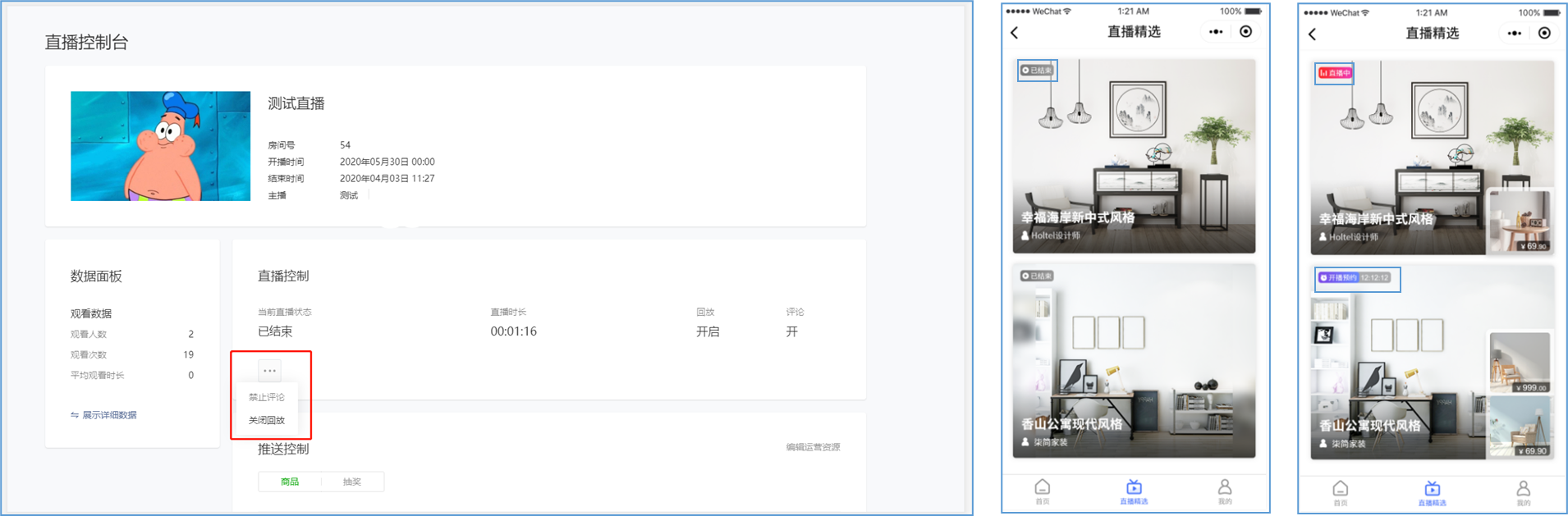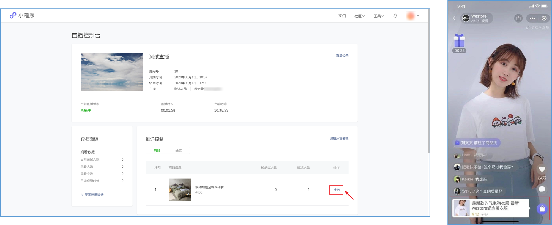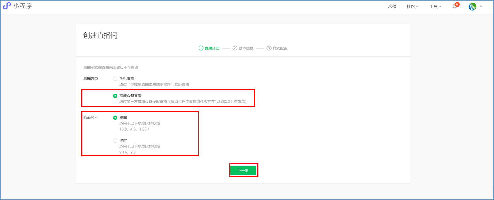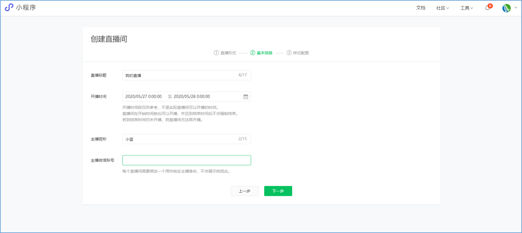 微信小程序直播-功能简介 小程序直播组件是微信为商家提供的实时视频直播工具,可以帮助商家快速通过小程序向用户提供优质的直播内容。同时,借助小程序丰富的营销功能,使得用户可以在小程序内轻松完成购买交易闭环,有效提升转化率。  微信小程序直播-功能亮点 流量属于商家 1.无需跳转:用户观看直播内容、下单在自家小程序完成。 2.流量自由:直播流量将沉淀在自己小程序中。 3.自主性强:可自行决定开展直播时间及频次。  微信小程序直播-功能亮点 低门槛、快运营 1.开发快:接入快、快运营。 2.已运营:至快20分钟即可上手。 3.丰富互动:提供点赞、抽奖、优惠券派发等能力。  微信小程序直播-功能亮点 强社交互动、强转化 1.小程序直播x订阅消息:支持一键订阅,方便用户回访。 2.小程序直播x社交:一键分享直播间至微信聊天。 3.小程序直播x公众号:公众号可为直播间引流,粉丝更易转化。 微信小程序直播-开启直播-开通条件 一:申请要求: 1.小程序开发者为国内非个人主体开发者,且小程序类目在开放类目中; 2.小程序所属主体近半年内没有严重违规记录; 3.小程序所属主体在微信生态内的用户运营、商业变现及投放推广的效果达标; 注:具体申请要求请查看《[微信小程序直播功能准入要求](https://res.wx.qq.com/mmbizwxampnodelogicsvr_node/dist/images/access_47d0ce.pdf)》(网址:[https://res.wx.qq.com/mmbizwxampnodelogicsvr_node/dist/images/access_47d0ce.pdf](https://res.wx.qq.com/mmbizwxampnodelogicsvr_node/dist/images/access_47d0ce.pdf)); 二、运营要求: 1.主体下小程序近半年没有严重违规 2.小程序近90天内存在支付行为 以上2个运营条件和类目同时满足的前提下,下面3个条件满足其一即可 1.主体下公众号累计粉丝大于100 2.主体下小程序连续7日dua(日活跃用户数)大于100 3.主体在微信生态内近1年广告投放实际消耗金额大于10000元 微信小程序直播-开启直播-开通入口 登录微信小程序后台,进入【功能-直播】中点击“开通”按钮,然后阅读并勾选同意服务条款,即可开通小程序直播功能。  微信小程序直播-创建直播间 开通功能后,在【微信小程序后台-功能-直播-直播间管理】中,点击“创建直播间”。  微信小程序直播-创建直播间-直播类型 按要求填写直播间类型。直播类型分为手机直播和推流设备直播。如果您使用手机直播,只需点击“手机直播”按钮即可。 手机直播:通过“小程序直播主播端小程序”发起直播。  微信小程序直播-创建直播间-直播类型 如果您使用推流设备直播,需点击“推流设备直播”按钮,然后根据您的设备选则横屏或竖屏。填写完毕后,点击“下一步”按钮进入基本信息页面填写。 推流设备直播:通过第三方推流设备发起直播(仅当小程序直播组件版本在1.0.3或以上有效果)  微信小程序直播-创建直播间-基本信息 按要求填写直播间资料,如:直播标题、开播时间、主播昵称、主播微信账号、是否允许评论、分享卡片封面、直播间封面等。  微信小程序直播-创建直播间-基本信息 直播标题:必须为3-17个汉字(一个字等于两个英文字符或特殊字符)。 开播时间:所选时间范围必须在12小时以内;开播时间和结束时间间隔不得短于30分钟。计划结束时间到时,正在进行的直播不会被强制结束,但若主播仍未开播,该直播间将过期,无法开播。 主播昵称:必须为2-15个汉字(一个字等于两个英文字符或特殊字符)。 主播微信账号:需与实际开播的主播一致,主播第1次登陆开播小程序时将进行实名验证。 注: 1、直播间资料所有选项均为必填项。 2、填写内容将以左侧预览图的样式展示给用户。 微信小程序直播-创建直播间-样式配置 按要求上传分享卡片封面和直播间背景墙(如图)。  微信小程序直播-创建直播间 成功创建直播间后,可以进行分享直播间、添加运营资源、查看推流小程序码操作。 分享直播间:可获取直播间小程序码,用于微信聊天等渠道分享。 添加运营资源:可在直播间添加商品、抽奖等。 查看推流小程序码:主播扫码可进入“小程序直播”发起直播。  微信小程序直播-创建直播间 您可以在【微信小程序后台-功能-直播-直播间管理】中,找到您的直播间,然后点击“开播码”进入主播小程序进行推流。  微信小程序直播-创建直播间 如果您设置的是“推流设备直播”,然后点击“推流地址”进入主播小程序进行推流。扫码后,您将获得您的唯一推流直流地址,请先保存,在后续步骤将会使用。  微信小程序直播-在管理后台中添加直播活动及商品 创建直播间成功后,您可以打开管理后台,进入【营销-直播】中,点击“新增活动”,新增一个直播活动。  微信小程序直播-新增活动-基本设置 进入直播活动基本设置,您可以根据系统提示,填写活动的基本信息。 开播时间:直播活动的开播时间 排序:直播活动在小程序商城的显示顺序(排序越大显示越靠前) 直播入口:小程序模板中开启“是否显示直播”  微信小程序直播-新增活动-直播商品 直播活动的基本设置填写完毕后,您可以切换页签至“直播商品”,点击添加商品,添加本次直播的商品。  微信小程序直播-新增活动-直播商品 添加商品后,您可以点击商品的“编辑”按钮,为商品添加价格信息。 商品封面:商品的封面图,系统自动添加 商品简称:商品的名称 价格类型:分为一口价、价格区间、显示折扣价三种类型。  微信小程序
