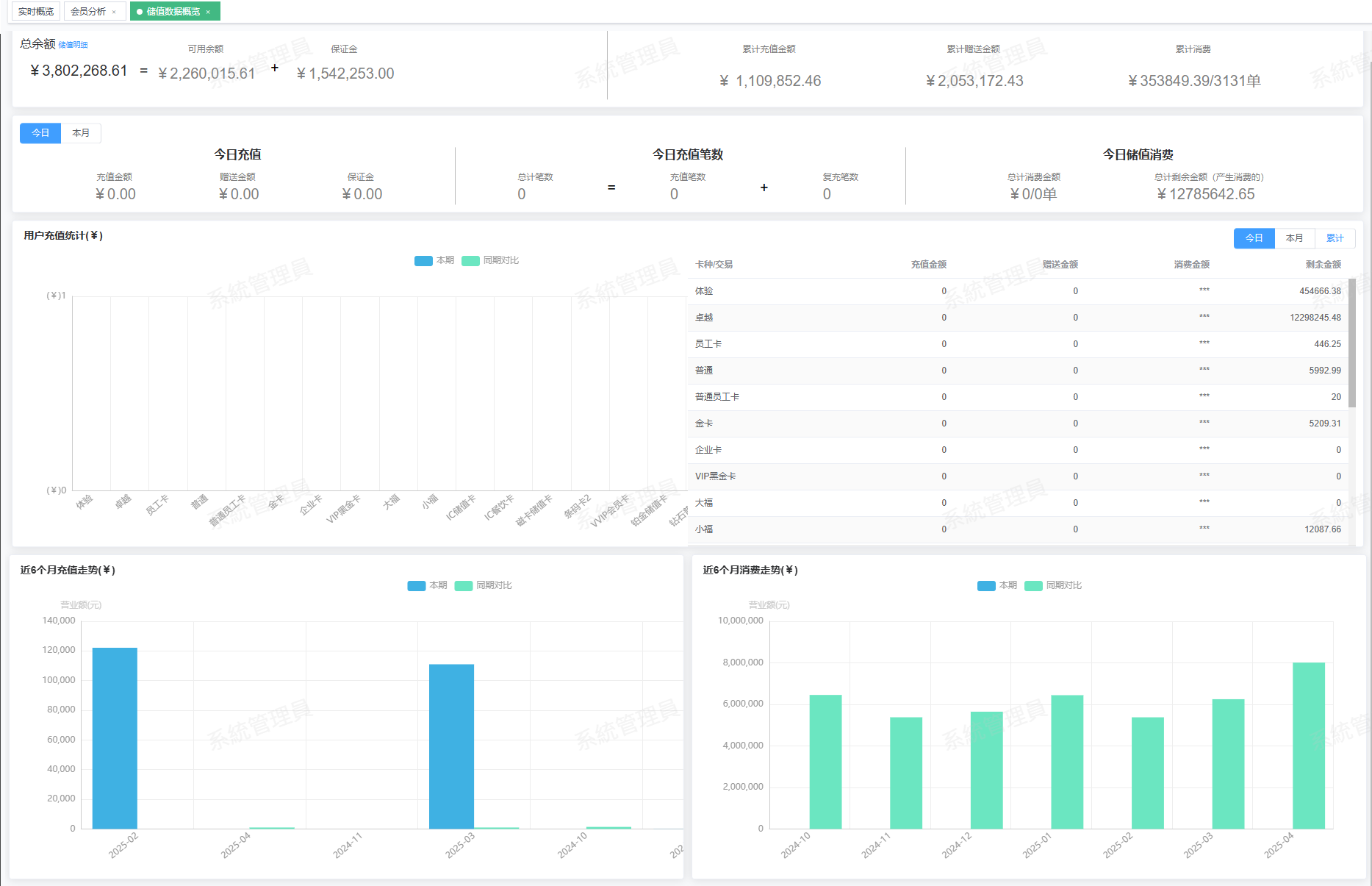 ### 功能说明 主要统计会员储值数据概览,展示数据如下: * 汇总数据:总余额、可用余额、保证金、累计充值金额、累计赠送金额、累计消费。 * 今日数据:今日充值、今日充值笔数、今日储值消费 * 卡种充值统计:用户充值统计分析 * 近6个月充值走势、近6个月消费走势 ### 操作路径 模块操作路径,例如:【概况】→【储值数据概览】 ### 操作界面