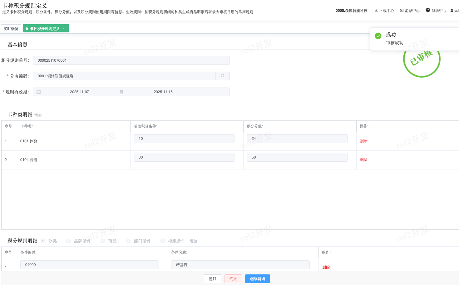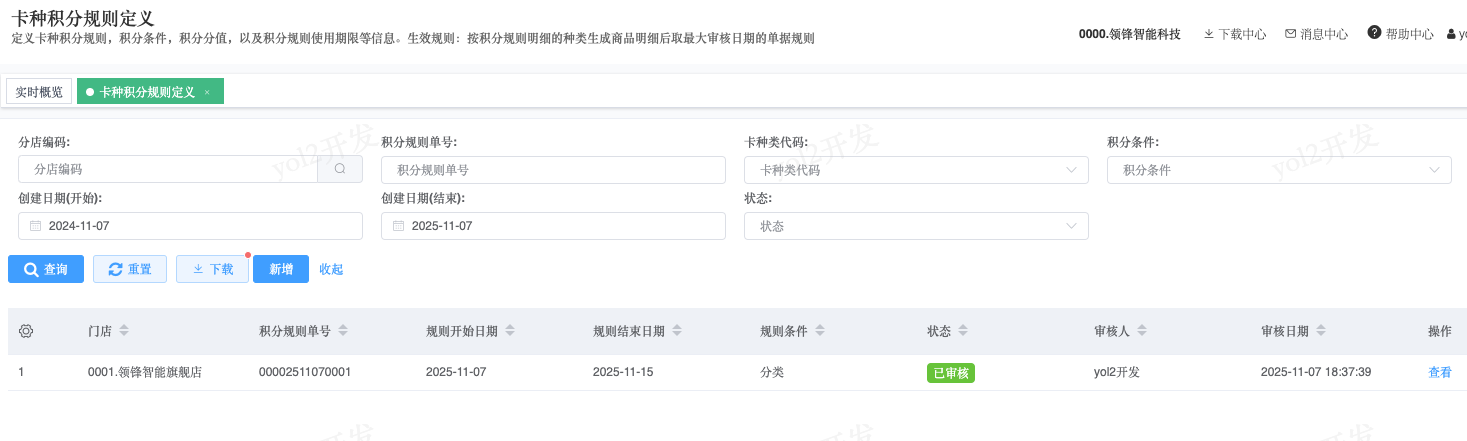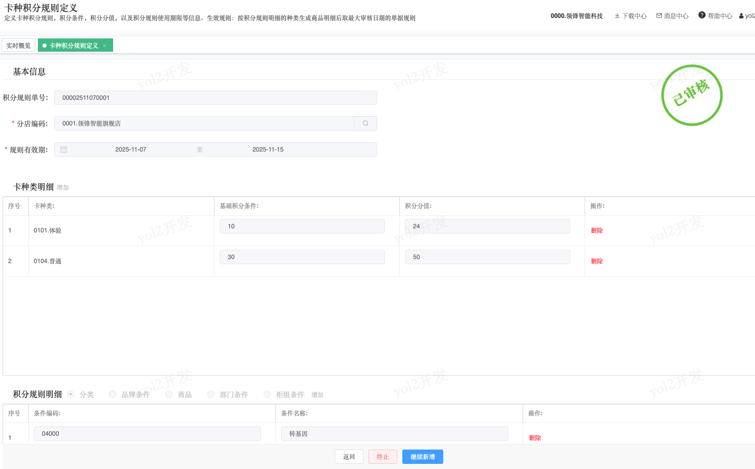 ### 功能说明 定义卡种积分规则,积分条件,积分分值,以及积分规则使用期限等信息。生效规则:按积分规则明细的种类生成商品明细后取最大审核日期的单据规则 ### 操作路径 【会员】→【卡种积分规则定义】 ### 操作界面   ### 操作示例 操作人员点击主界面相应的按钮,系统自动弹出相应的窗口,操作如下所示: 1、进入模块,点【新增】,进入详情页,选择卡种规则的生效分店、规则有效期; 2、卡种类明细点【增加】,选择卡种,填写积分条件、积分分值; ==如积分条件10,积分分值24,即会员消费10元则累计20积分== 3、积分规则明细选择积分条件,可按分类、品牌、商品、部门或柜组,点【增加】设置规则条件明细; 4、填写完成后,点【确认】即新增完成; 5、确认无误后,点【审核】,确定后即设置完成。 ==注意:审核后,单据不可修改及删除;审核后,规则有效期期间交易的会员卡种,按积分条件计算积分分值。==     ### 按钮说明 * 新增:单击该按钮,增加卡种积分规则单 * 修改:可修改未审核的卡种积分规则单 * 删除:可删除未审核的卡种积分规则单 * 查询:单击该按钮,查询数据 * 审核:单击该按钮,更新单据为已审核,审核后,规则有效期期间交易的会员卡种,按积分条件计算积分分值。 * 终止:单击该按钮,可终止已审核的单据