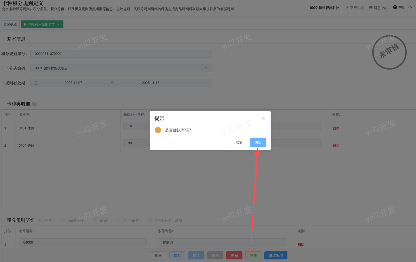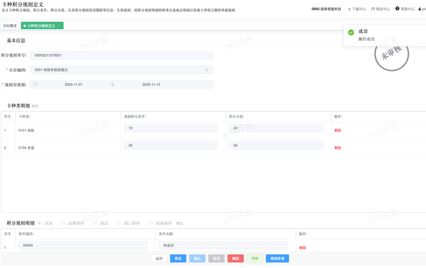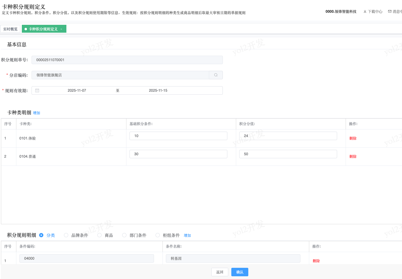 ### 功能说明 定义卡种积分规则,积分条件,积分分值,以及积分规则使用期限等信息。生效规则:按积分规则明细的种类生成商品明细后取最大审核日期的单据规则 ### 操作路径 【会员】→【卡种积分规则定义】 ### 操作界面   ### 操作示例 操作人员点击主界面相应的按钮,系统自动弹出相应的窗口,操作如下所示: 1、进入模块,点【新增】,进入详情页,选择卡种规则的生效分店、规则有效期; 2、卡种类明细点【增加】,选择卡种,填写积分条件、积分分值; ==如积分条件10,积分分值24,即会员消费10元则累计20积分== 3、积分规则明细选择积分条件,可按分类、品牌、商品、部门或柜组,点【增加】设置规则条件明细; 4、填写完成后,点【确认】即新增完成; 5、确认无误后,点【审核】,确定后即设置完成。 ==注意:审核后,单据不可修改及删除;审核后,规则有效期期间交易的会员卡种,按积分条件计算积分分值。==     ### 按钮说明 * 新增:单击该按钮,增加卡种积分规则单 * 修改:可修改未审核的卡种积分规则单 * 删除:可删除未审核的卡种积分规则单 * 查询:单击该按钮,查询数据 * 审核:单击该按钮,更新单据为已审核,审核后,规则有效期期间交易的会员卡种,按积分条件计算积分分值。 * 终止:单击该按钮,可终止已审核的单据