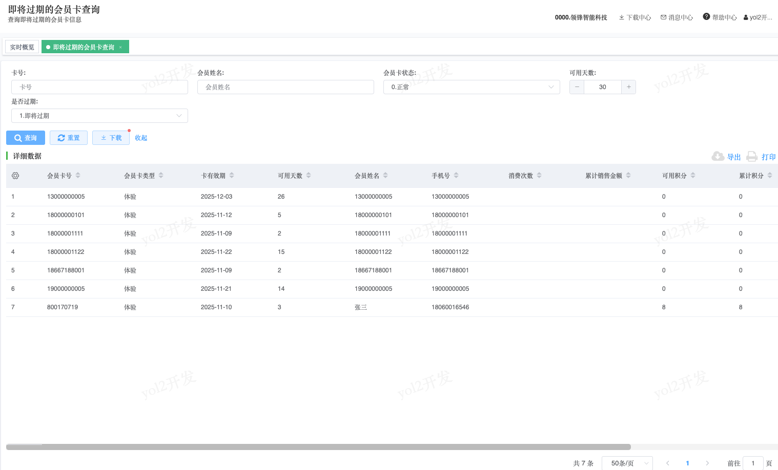 ### 功能说明 查询即将过期的会员卡信息 ### 操作路径 【会员】→【即将过期的会员卡查询】 ### 操作界面