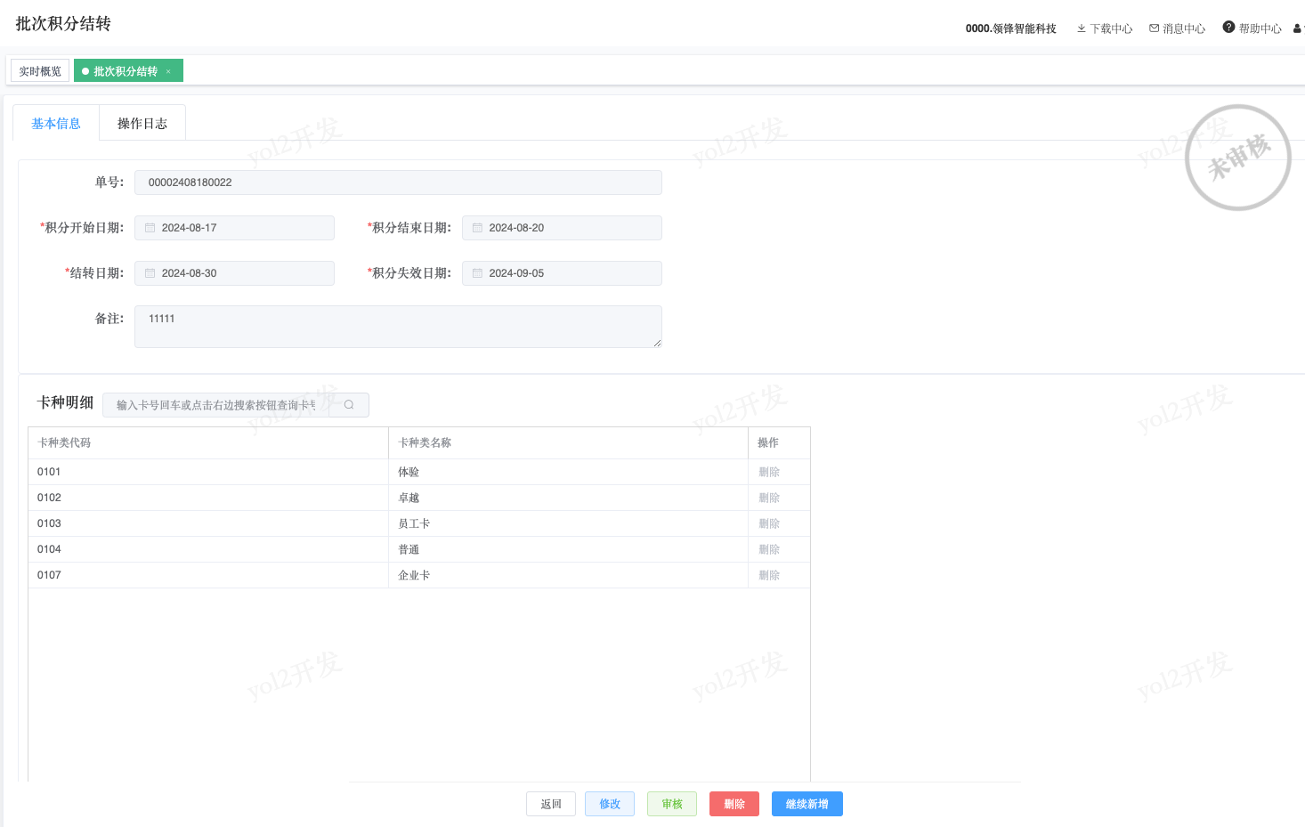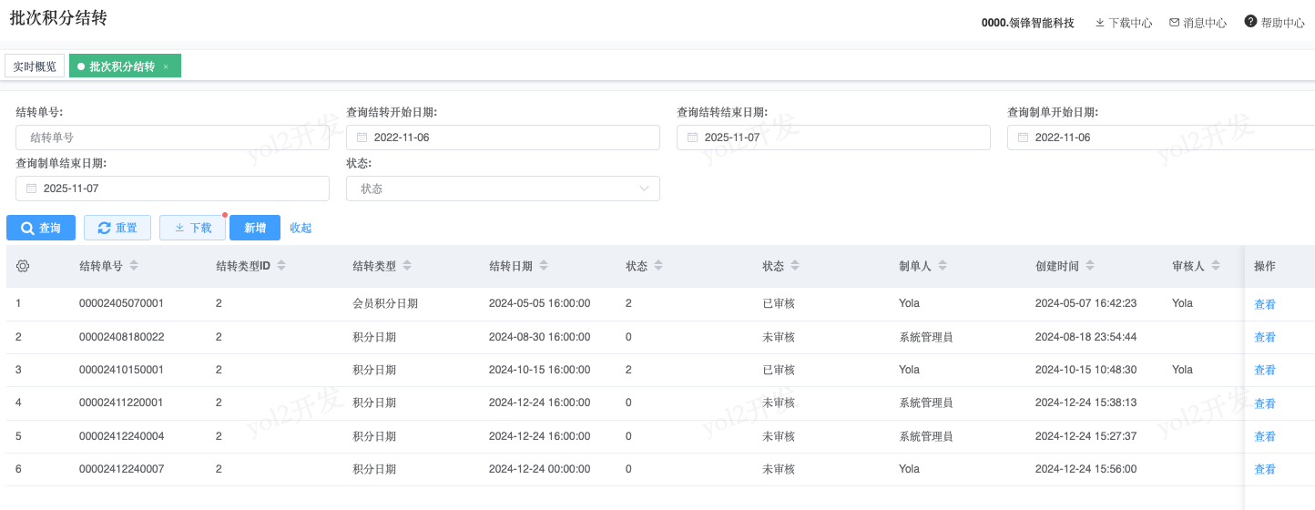 ### 功能说明 按卡种结转单清理,可指定结转日期dClearDate,指定卡种sCardTypeCode,设置开始日期和结束日期,设置积分有效期dValidDate 计算逻辑,指定结转日期这一晚,将指定卡种并且积分产生时间在开始日期和结束日期之间的积分有效期设置到dValidDate这一天 每晚日结会清理有效期过期的积分 ### 操作路径 【会员】→【批次积分结转】 ### 操作界面   ### 操作示例|按卡种结转单清理 操作人员点击主界面相应的按钮,系统自动弹出相应的窗口,操作如下所示: #### 设置到期清零参数 模块路径:【会员】→【会员系统参数】 1、PointClearDate积分到期清零日期参数值1设置为0,不开启  2、 PointValuesDay会员积分有效期参数值1设置为0,不开启  #### 设置批次积分接转单 进入模块,点【新增】,设置指定卡种批次积分结转单,确认无误后点【审核】,审核后生效; ==注意:结转日期不能小于当天;积分失效日期必须大于结转日期;==     #### 每晚日结清理指定卡种有效期过期的积分 验证卡号:800001020132 卡种:0701 结转前积分200;结转后积分清零;  ### 按钮说明 * 新增:单击该按钮,增加批次积分接转单 * 修改:可修改未审核的批次积分接转单 * 删除:可删除未审核的批次积分接转单 * 查询:单击该按钮,查询数据 * 审核:单击该按钮,可确定审核的单据,审核后,单据生效。
